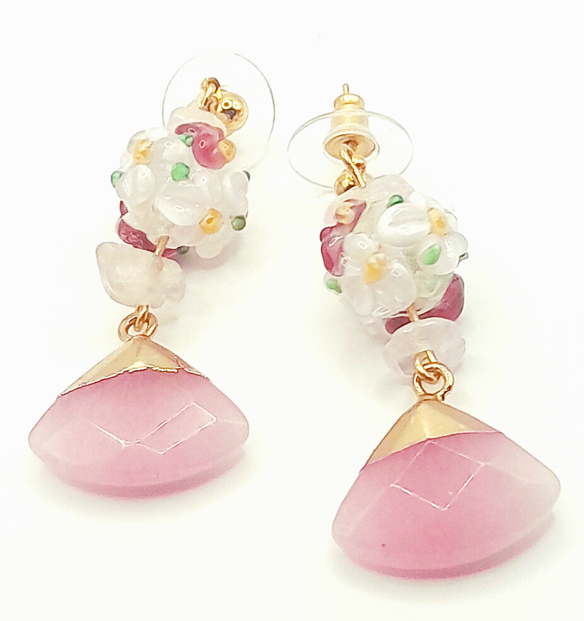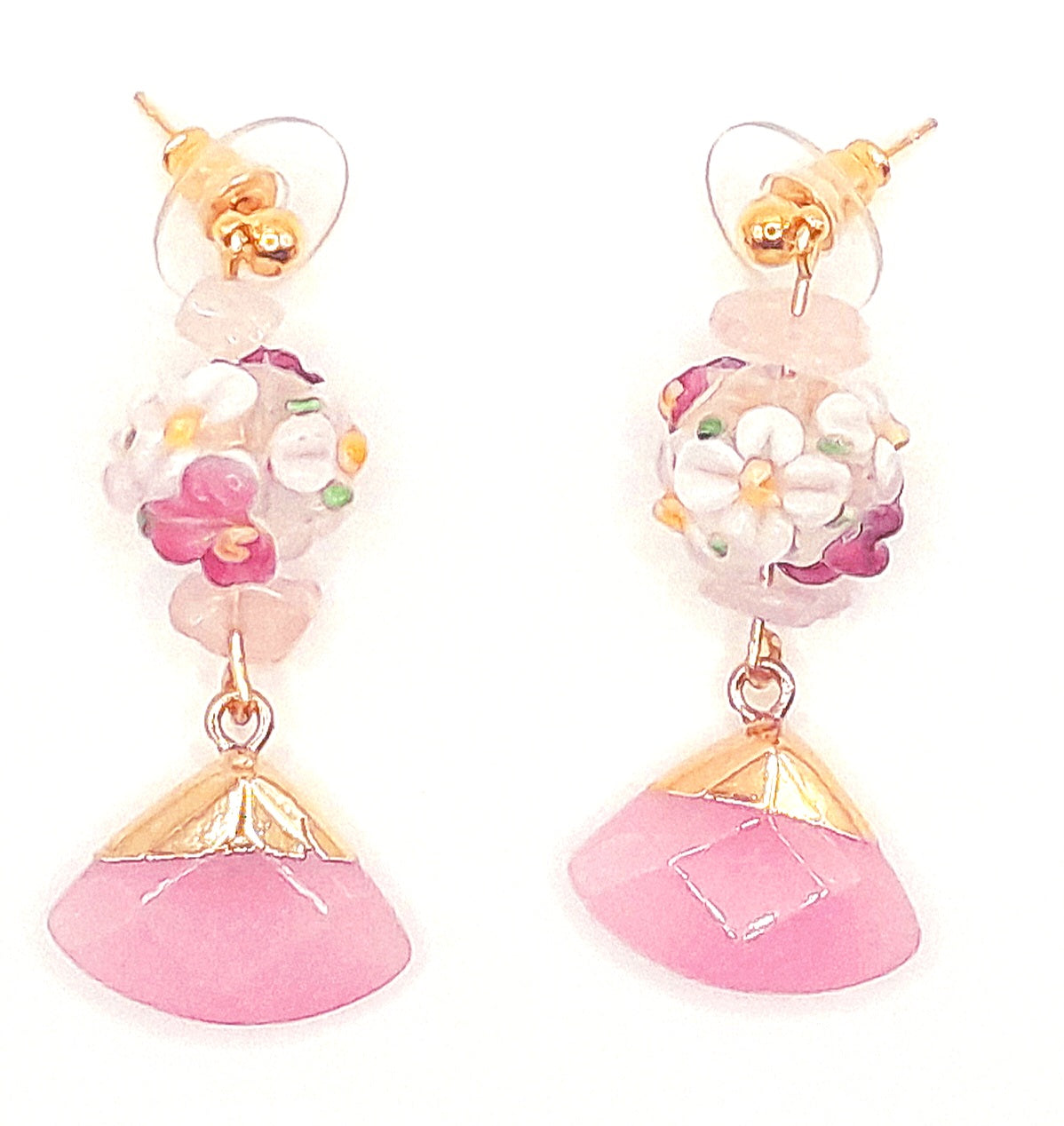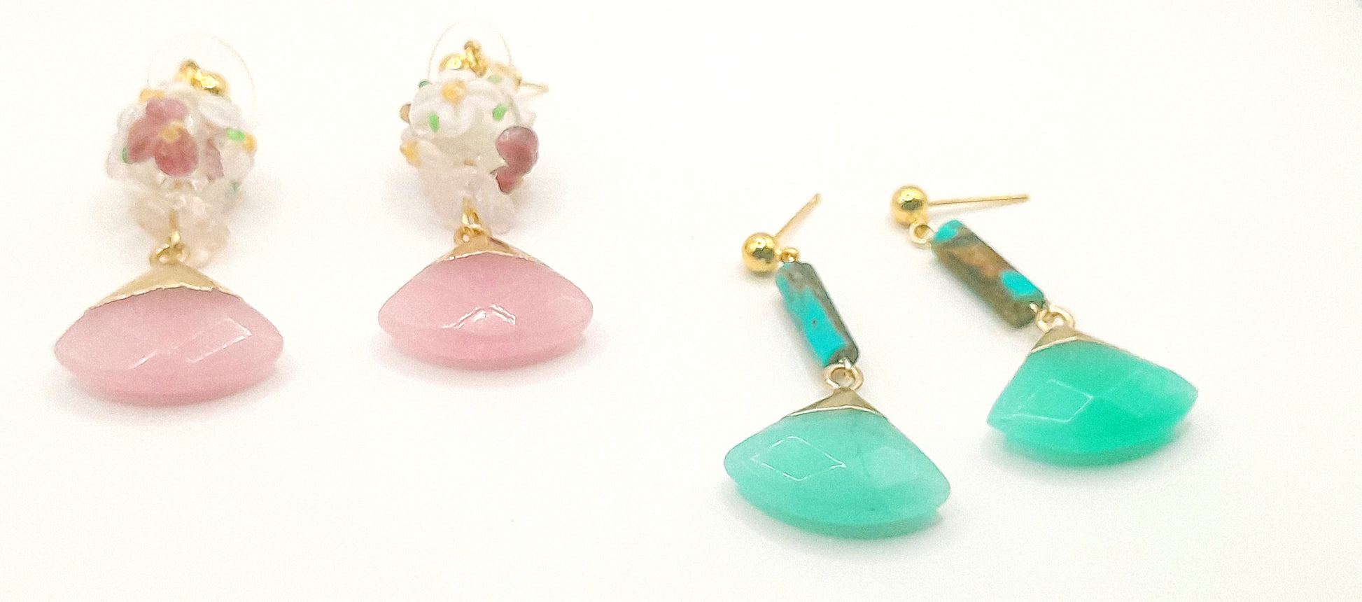 Elevate your jewelry collection with our exquisite Agate stone earrings, featuring two unique and stunning designs. The first pair showcases a pink Agate stone adorned with a glass flower bouquet of delicate pink beads, exuding a soft and feminine touch. The second pair boasts a captivating Teal blue Agate stone complemented by a combination of turquoise and wood long beads, evoking a tranquil and oceanic vibe. Both earrings are elegantly set on 18k gold plated nickel-free ball studs, ensuring style and comfort with every wear.