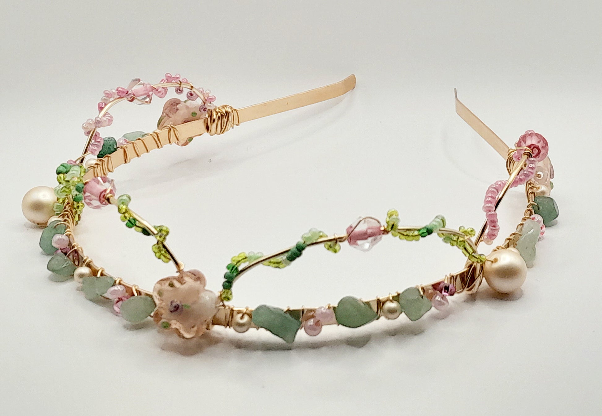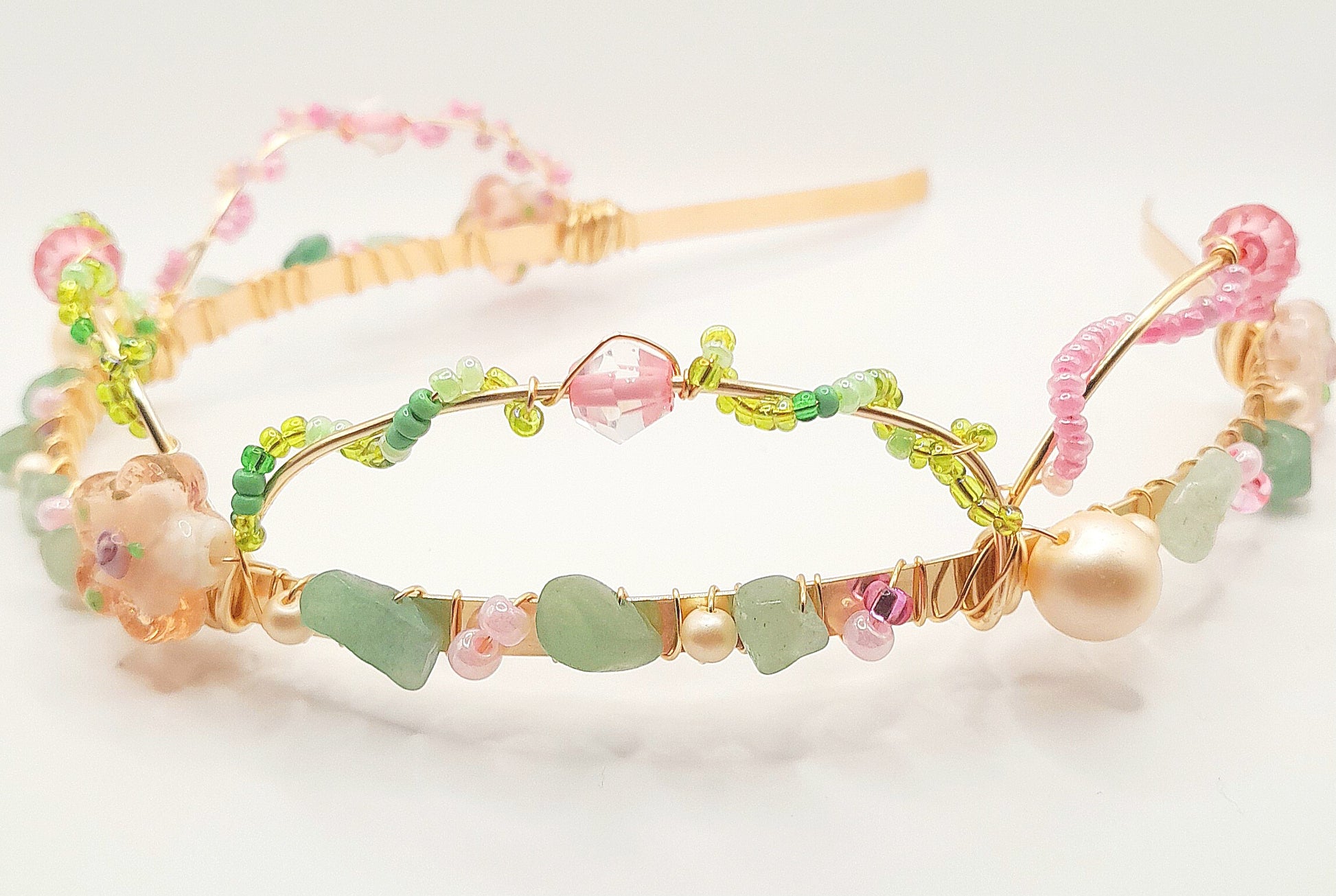 Experience elegance and healing with our handwired gold headband. The base is adorned with pink pearls, glass beads, and green aventurine, a gemstone renowned for releasing old patterns and fostering new growth. Achieve emotional balance as it soothes wounds and transforms hardships into opportunities for personal growth. Elevate your style and well-being with this exquisite headband, perfect for those seeking both fashion and holistic benefits. Explore the transformative power of green aventurine and embrace a new direction in life. Order now and embark on a journey of healing and empowerment.