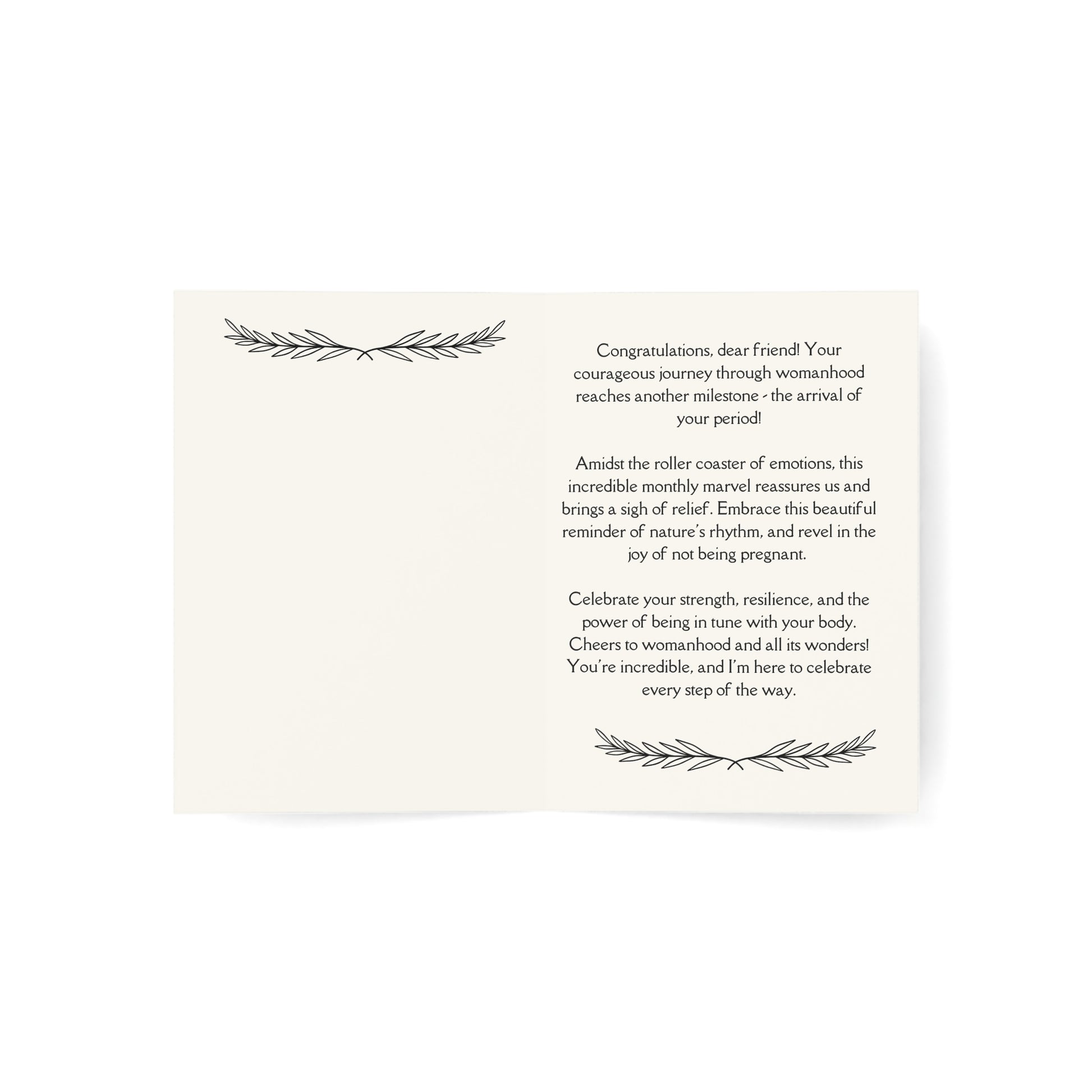 Mark this incredible moment in a young woman's life with our captivating greeting card that beautifully celebrates life's wondrous moments. Adorned with the heartfelt message "Celebrate Life's Wondrous Moments" on the front, our card provides a perfect opportunity to congratulate her on entering womanhood and reassure her that this milestone signifies her growth and changes, rather than pregnancy. Inside, express your heartfelt sentiments and sentiments of support. Meticulously crafted with utmost care and attention to detail, our card stands as a meaningful keepsake for this special occasion. Embrace and empower the young woman as she embarks on this exciting new chapter of her life.