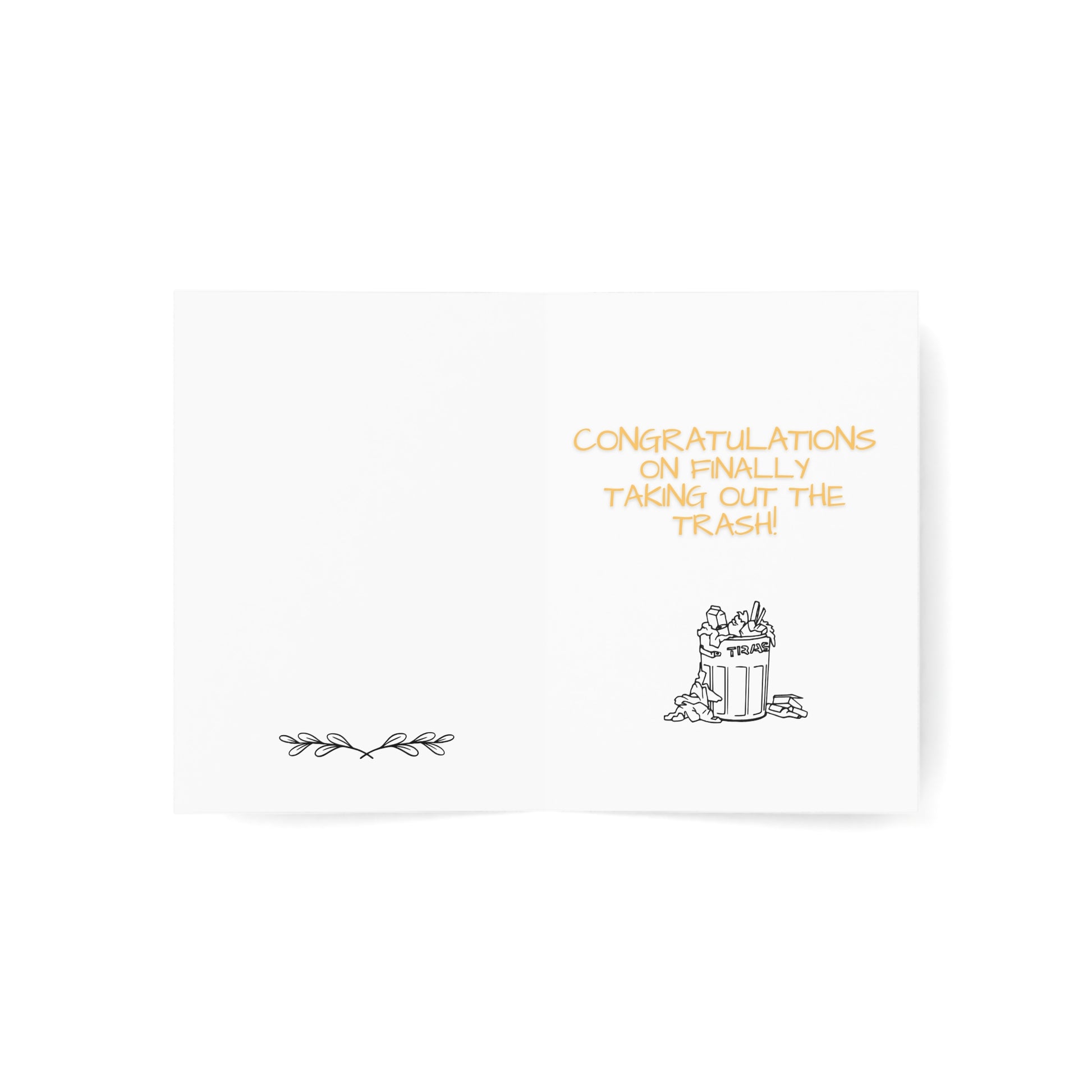 Celebrate a loved one's triumphant escape from a toxic relationship with our captivating Congratulations Greeting Card! With the clever phrase "Congratulations on finally taking out the trash!" displayed prominently, this card conveys heartfelt support and admiration for their courageous decision.