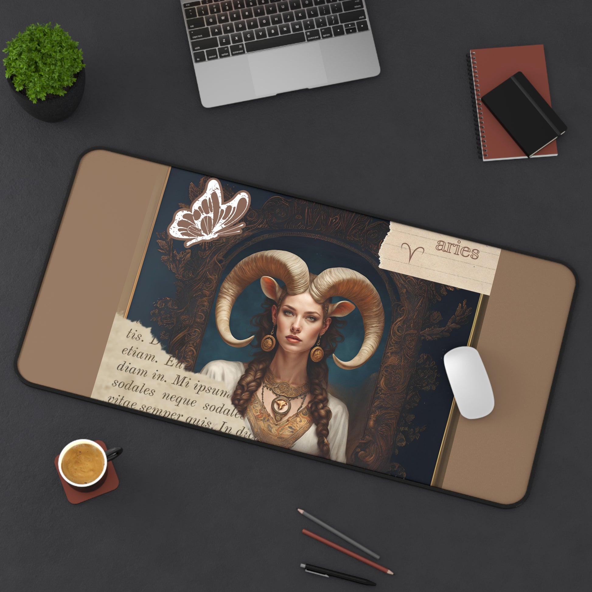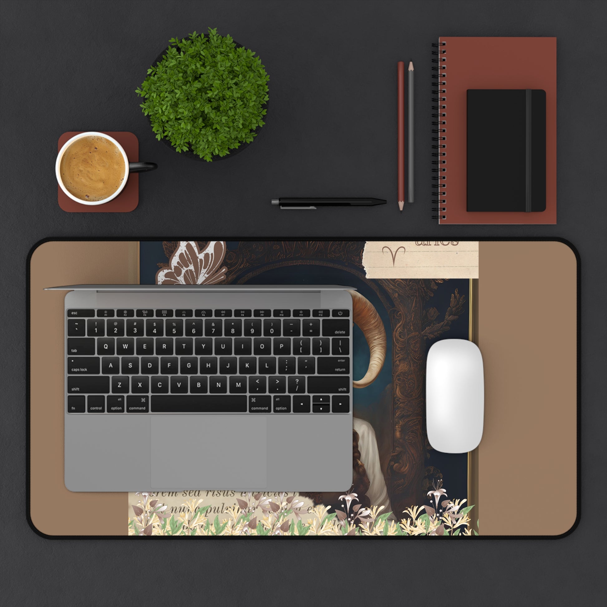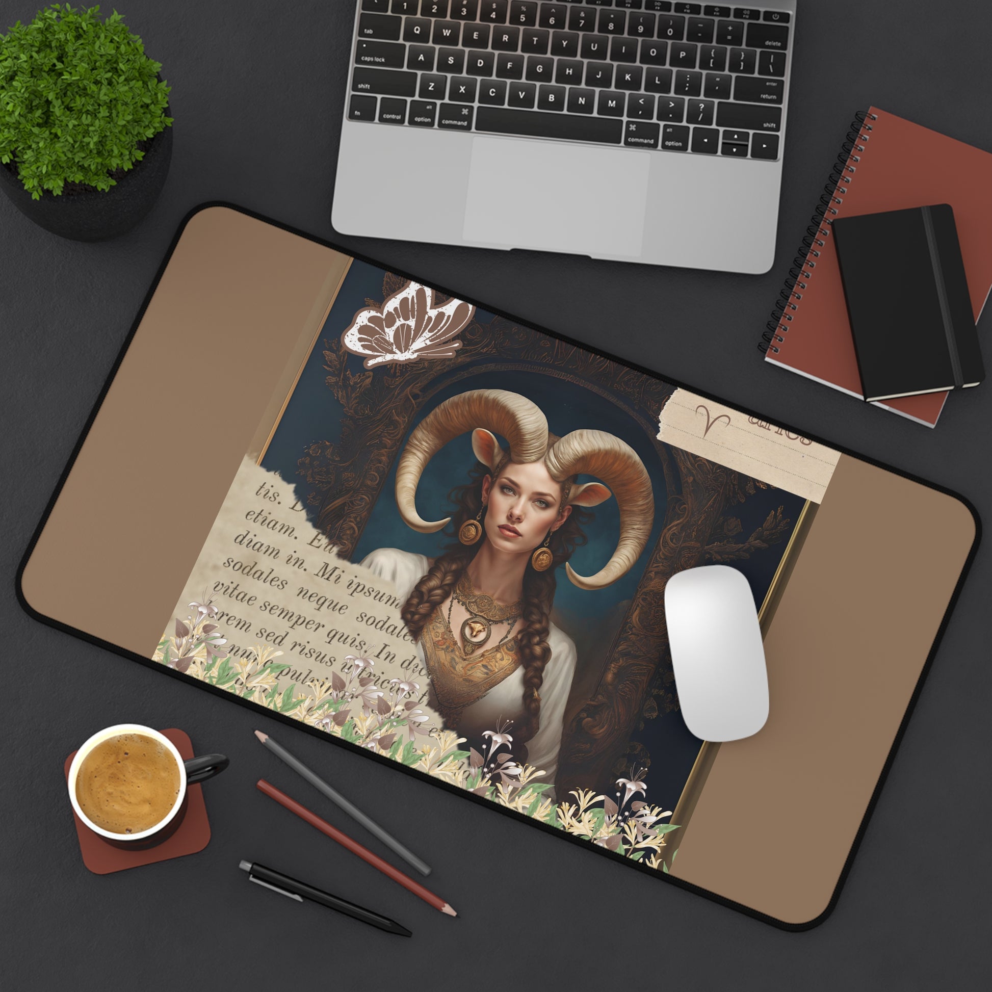 The desk mat features a captivating image of a regal Aries woman, embodying strength and elegance. Her majestic horns add a touch of mythical allure, while her poised and confident demeanor reflects the bold and pioneering nature of Aries. Surrounding her at the base of the image is a lush gathering of honeysuckle, symbolizing rebirth and new beginnings—qualities that are inherently Aries..