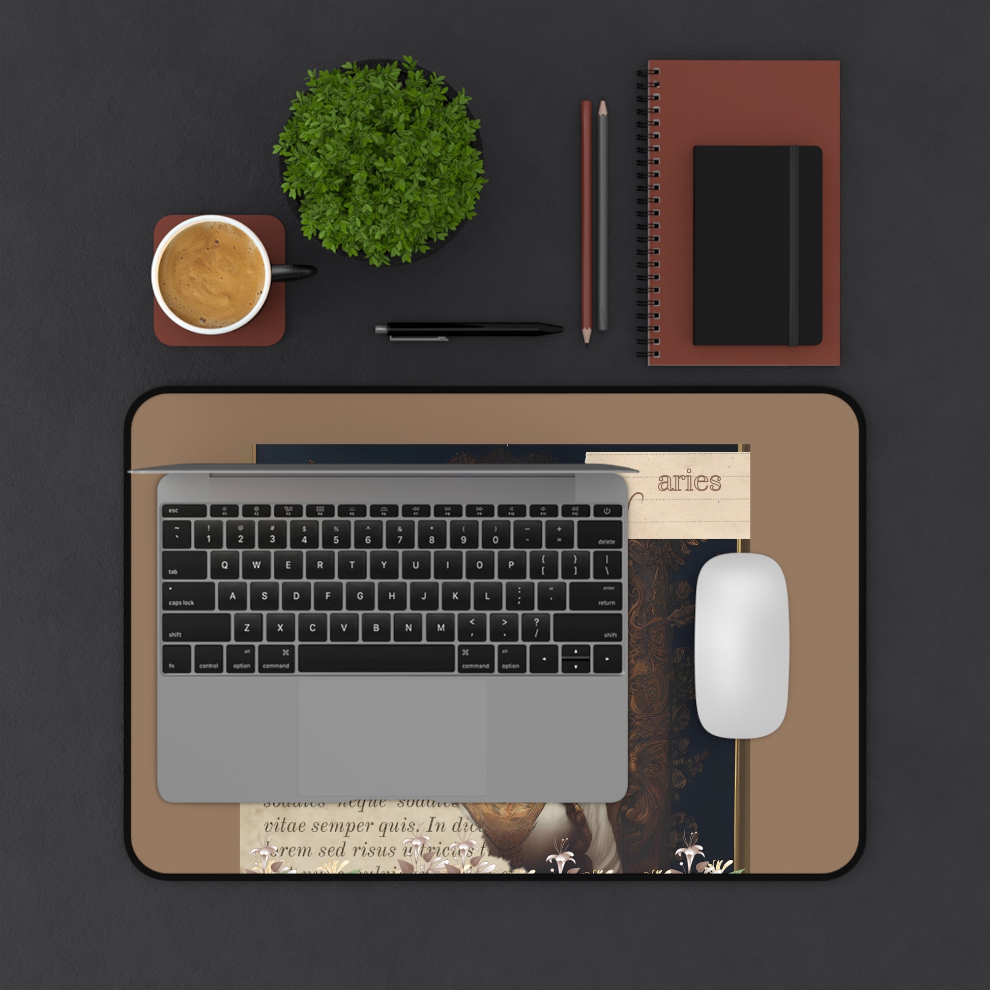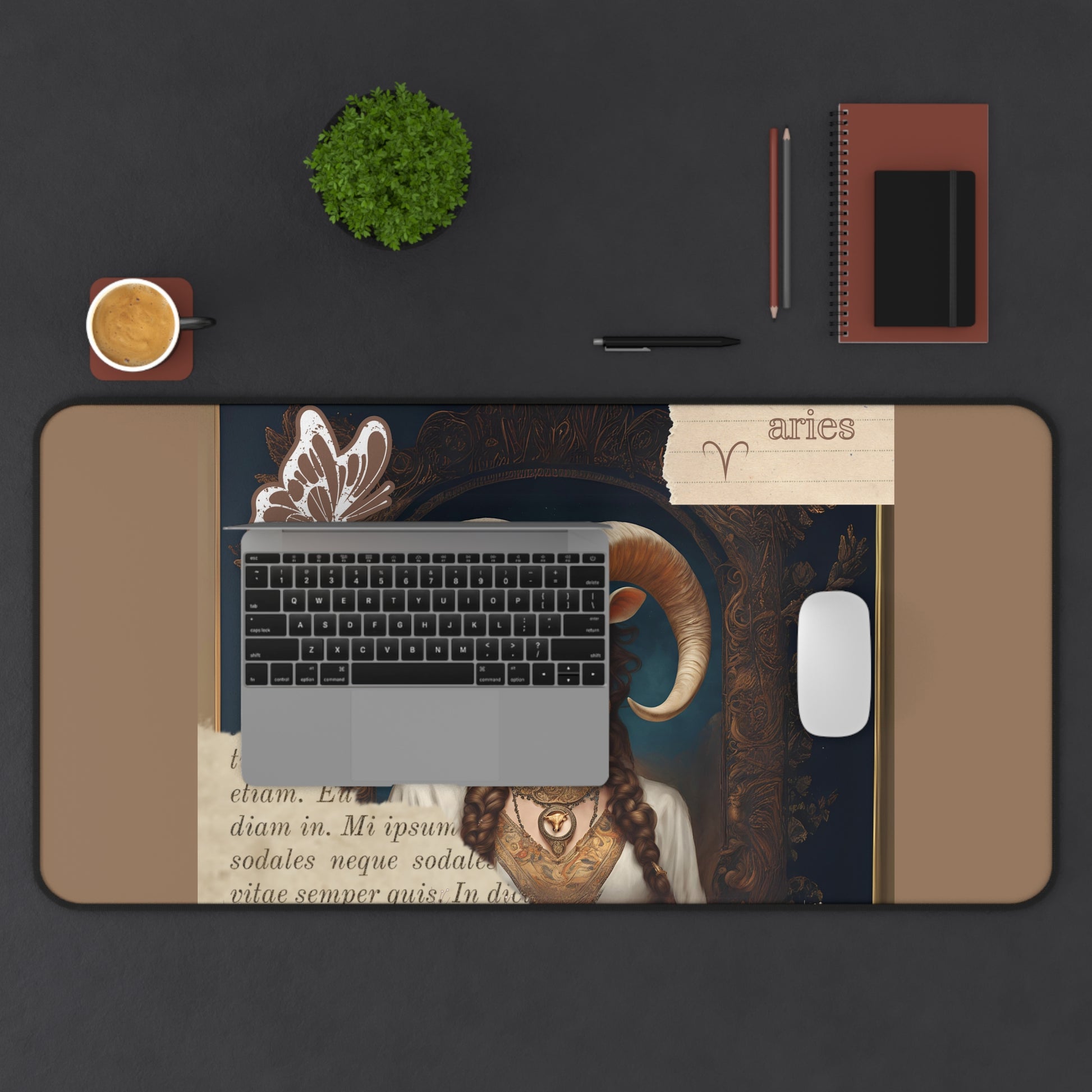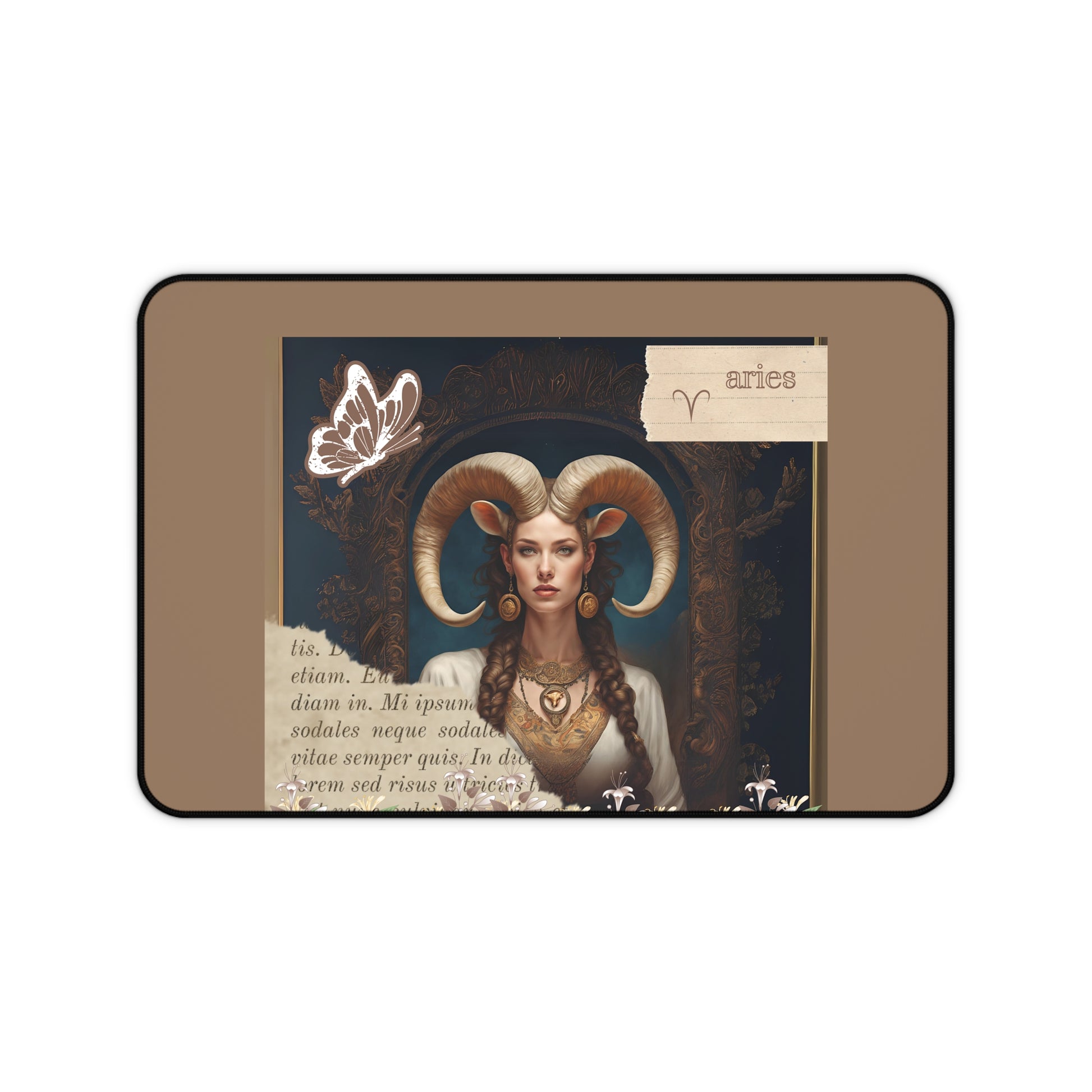 The desk mat features a captivating image of a regal Aries woman, embodying strength and elegance. Her majestic horns add a touch of mythical allure, while her poised and confident demeanor reflects the bold and pioneering nature of Aries. Surrounding her at the base of the image is a lush gathering of honeysuckle, symbolizing rebirth and new beginnings—qualities that are inherently Aries..