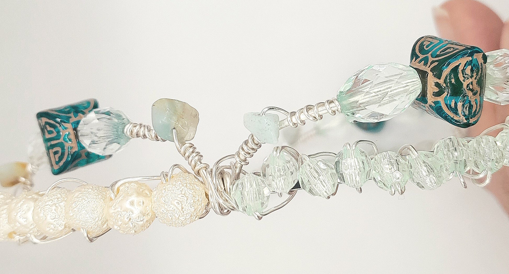 Eleanor - White and Clear Blue Beads Handwired Silver Headband with Green Aventurine on the Arches