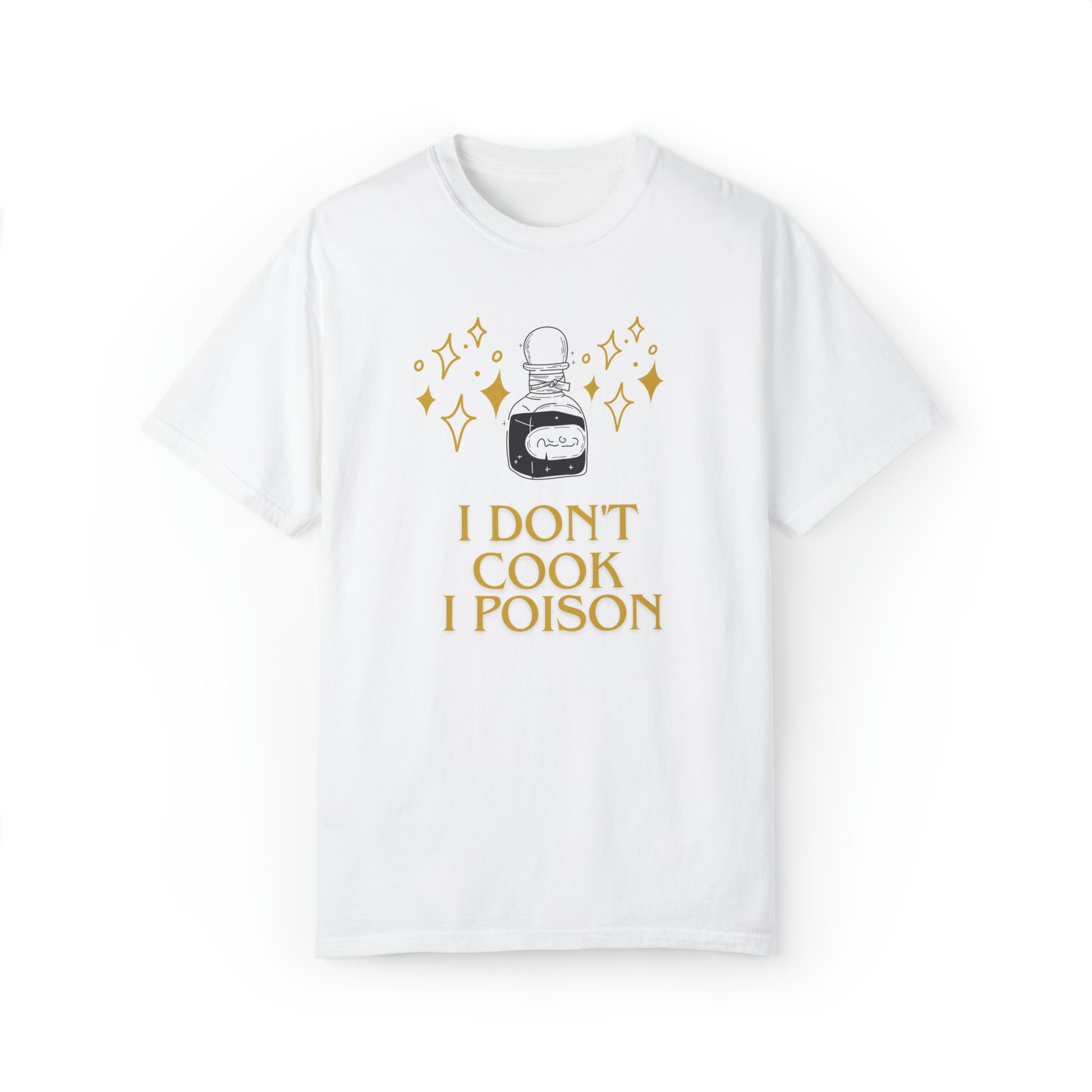 Introducing our edgy and humorous "I don't cook, I poison" t-shirt that adds a dash of wicked allure to your wardrobe. Celebrating culinary rebels and mischievous chefs, this playful yet bold piece effortlessly grabs attention and sparks conversations. Embrace your inner kitchen rebel with this eye-catching tee, featuring a captivating design and premium quality fabric for comfort all day long. Crafted with utmost attention to detail, this t-shirt combines exceptional style and witty humor, making it a fantastic statement piece for food enthusiasts, pranksters, and anyone with a daring sense of humor. Whether you're a master chef or simply enjoy stirring up trouble in the kitchen, this t-shirt is the perfect addition to express your distinctive personality. Amplify your fashion game, make heads turn, and proudly display your rebellious spirit with our irresistible "I don't cook, I poison" t-shirt.