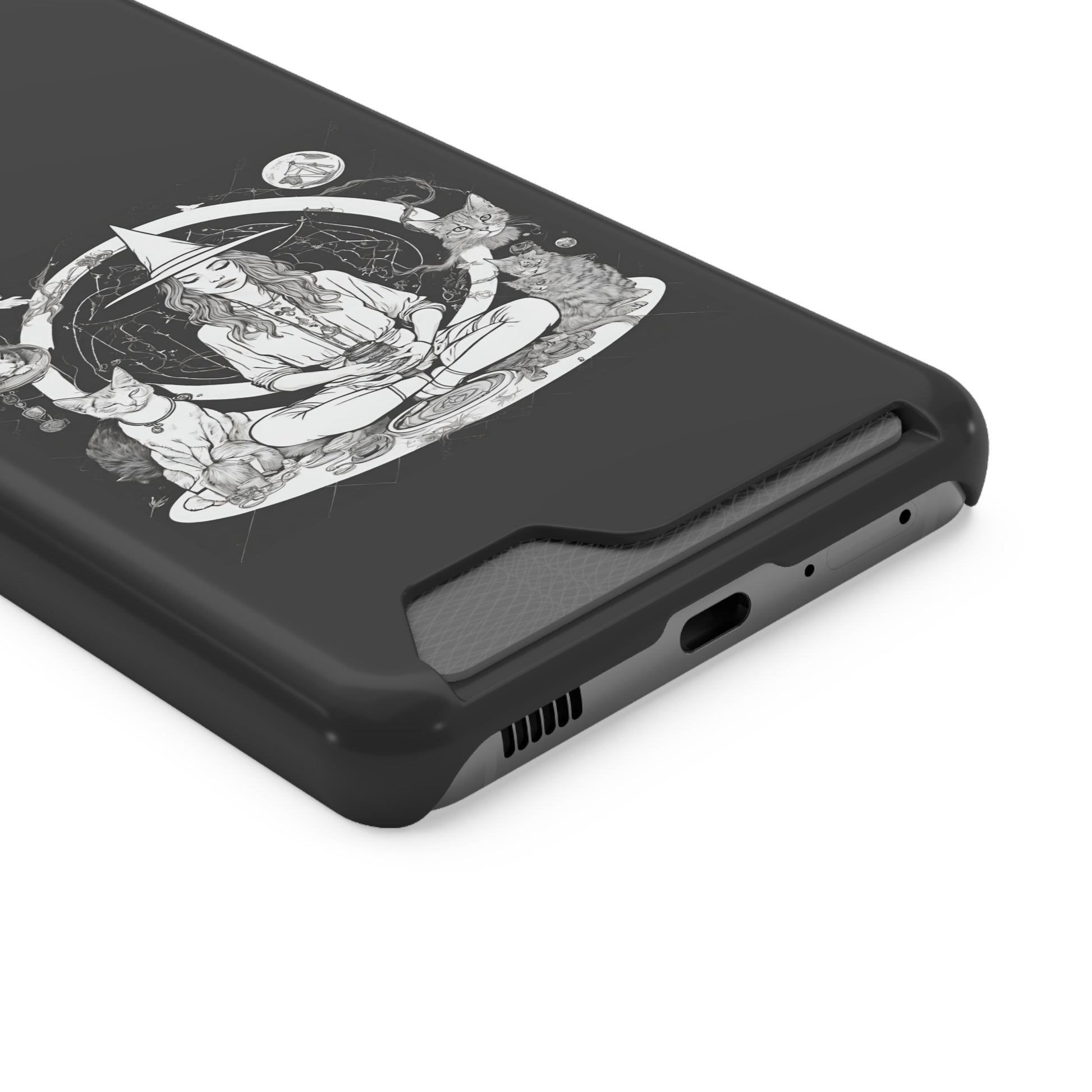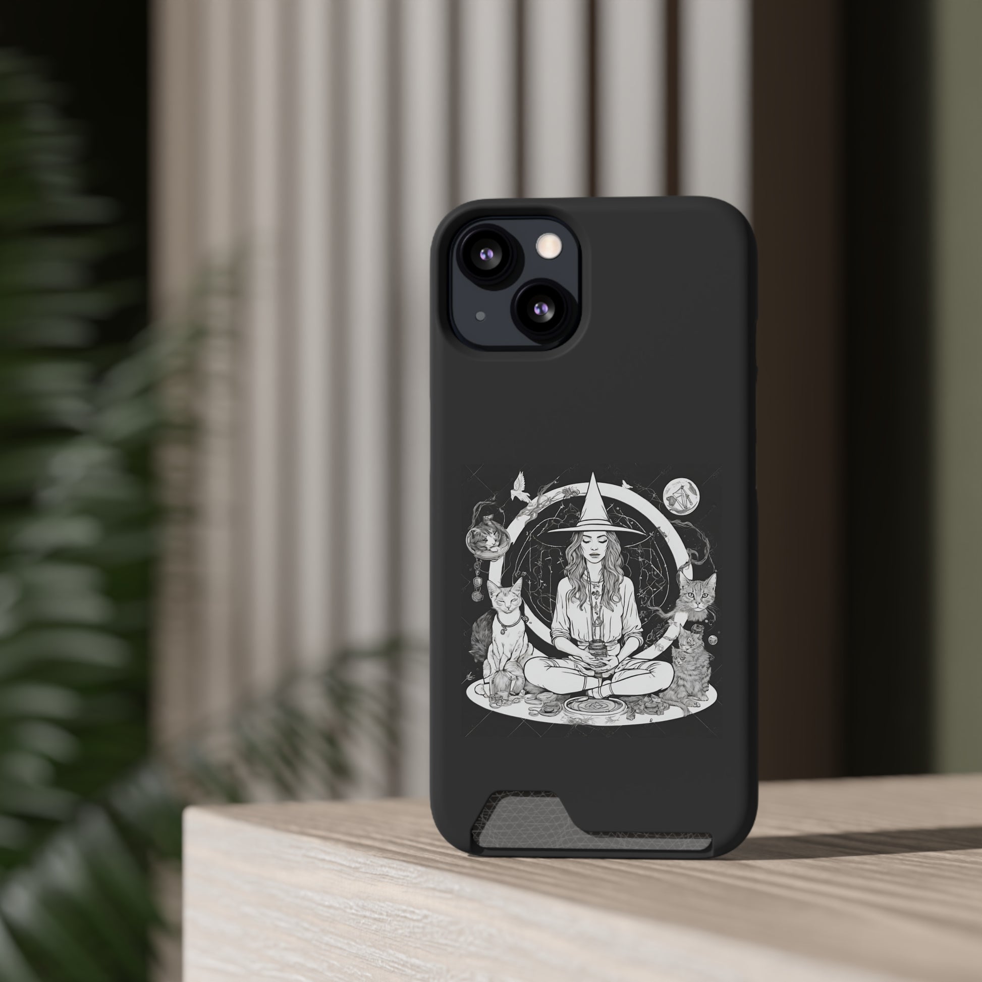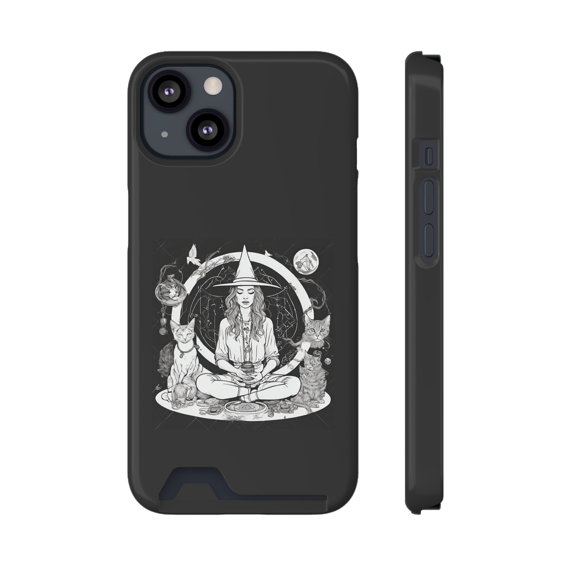 Explore our elegant and functional Dark Phone Case with Card Holder, featuring a mesmerizing image of a woman immersed in deep meditation alongside her spiritual familiars, beautiful cats. This sleek and durable phone case offers unparalleled protection for your device, while the convenient card holder ensures easy access to your essential cards. Crafted with precision and style, our dark phone case not only safeguard your phone from everyday wear and tear, but it also adds a touch of mysticism and spirituality to your life. Elevate your phone's aesthetics and tap into your inner tranquility with this unique and practical accessory.