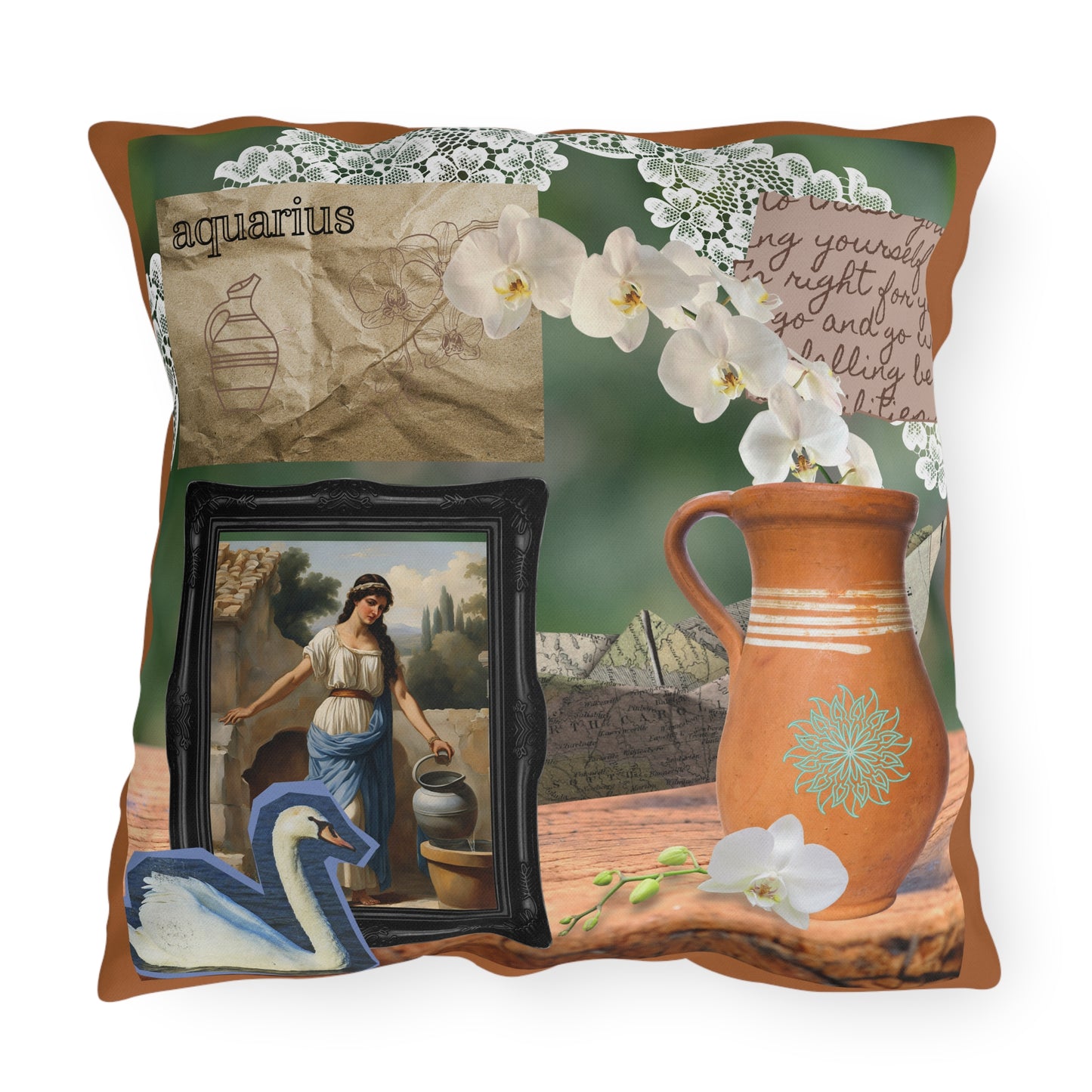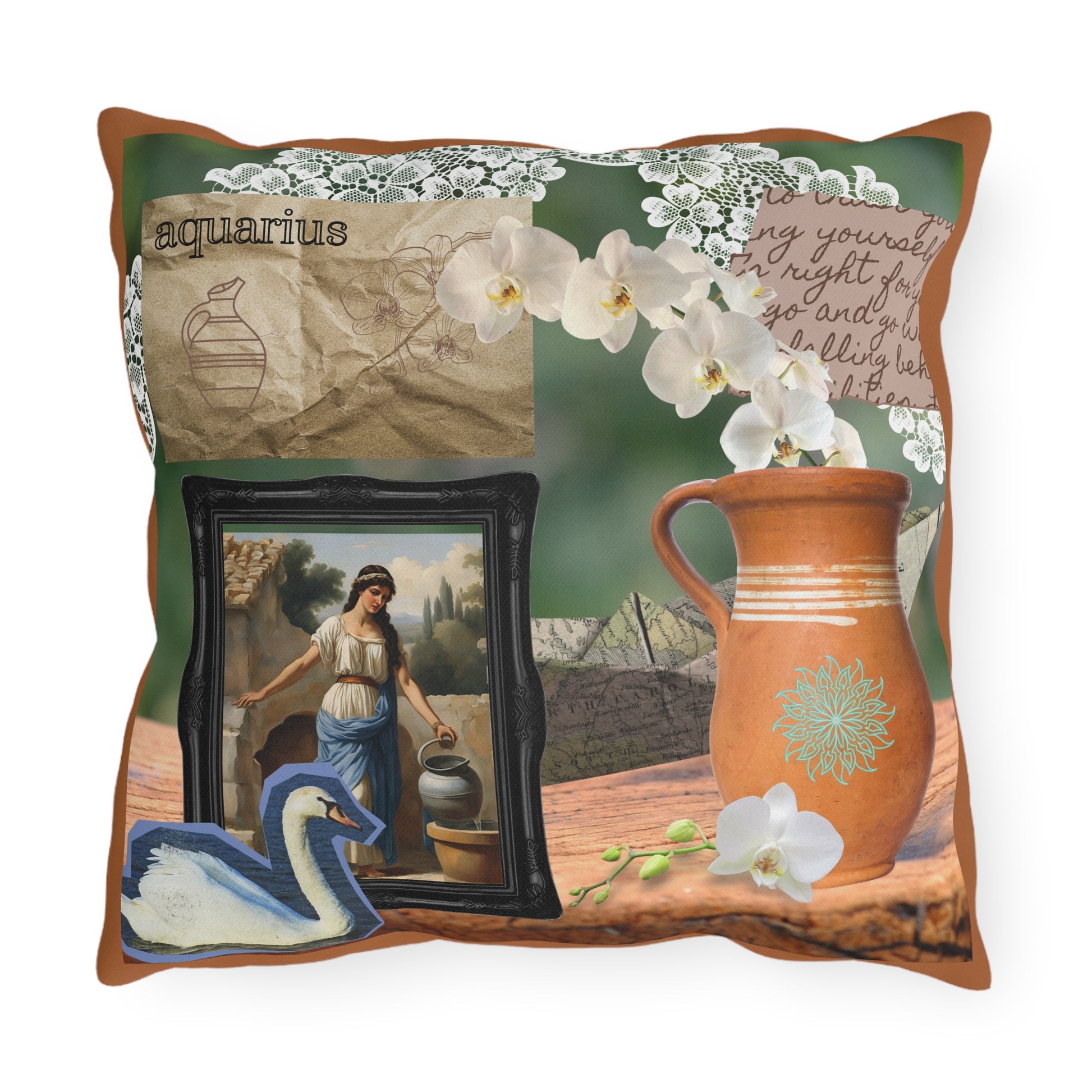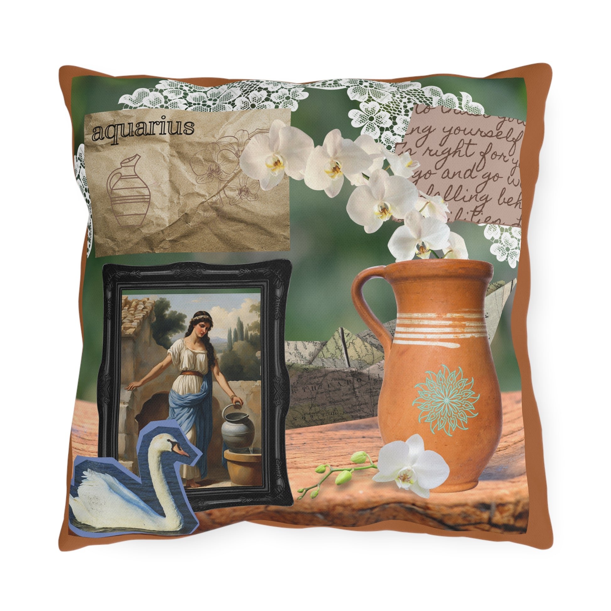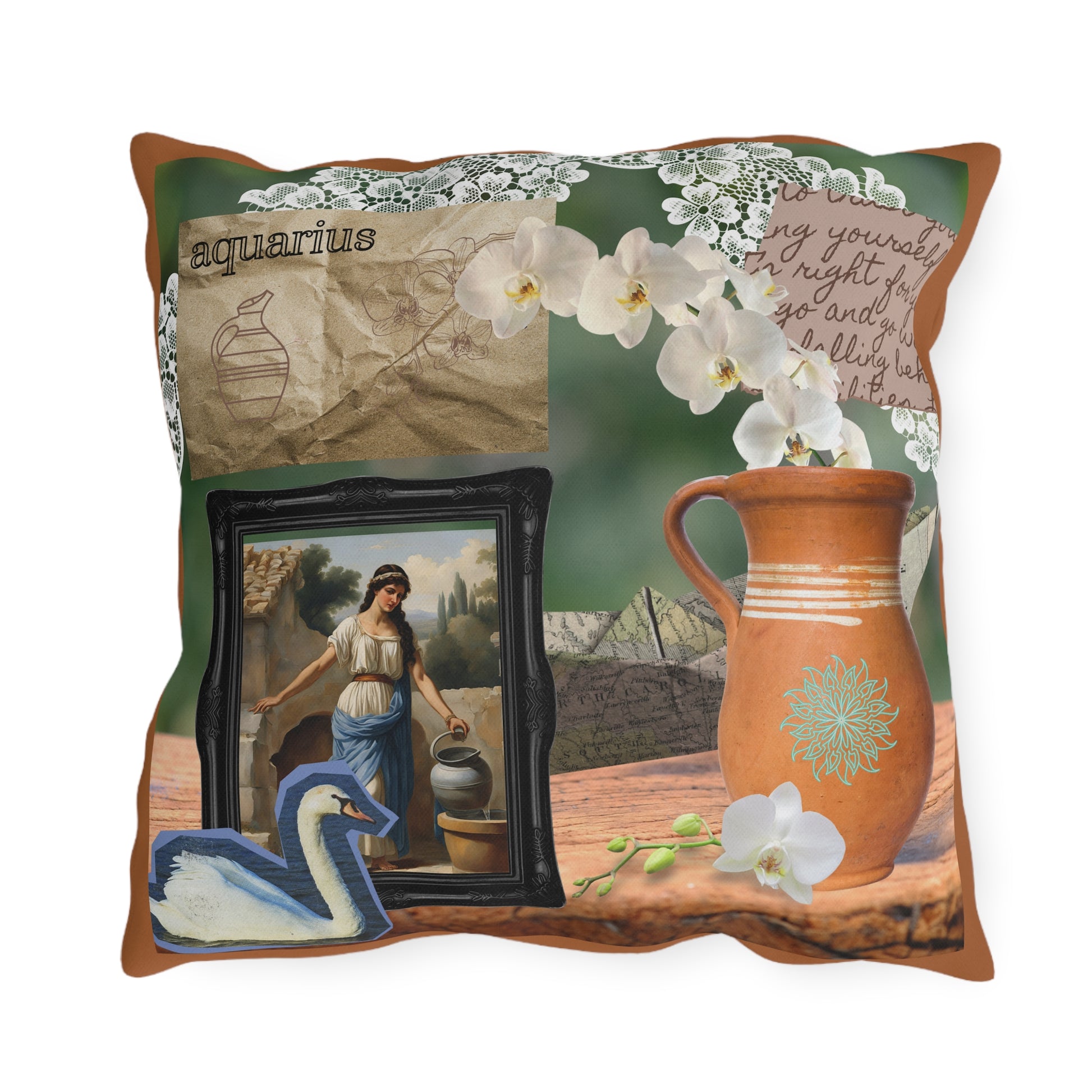 Bring a touch of elegance to your outdoor space with these vibrant and comfortable pillows featuring a mesmerizing illustration of an Aquarius woman, gracefully pouring water from a jug, symbolizing the water-bearer. Her serene expression and classic attire reflect the nurturing and humanitarian spirit of Aquarius. The background features a blend of rustic and botanical elements, including a beautifully illustrated orchid and intricate lace details, adding depth and charm to the design. The presence of a swan and a vintage pitcher further enhances the tranquil and harmonious vibe.