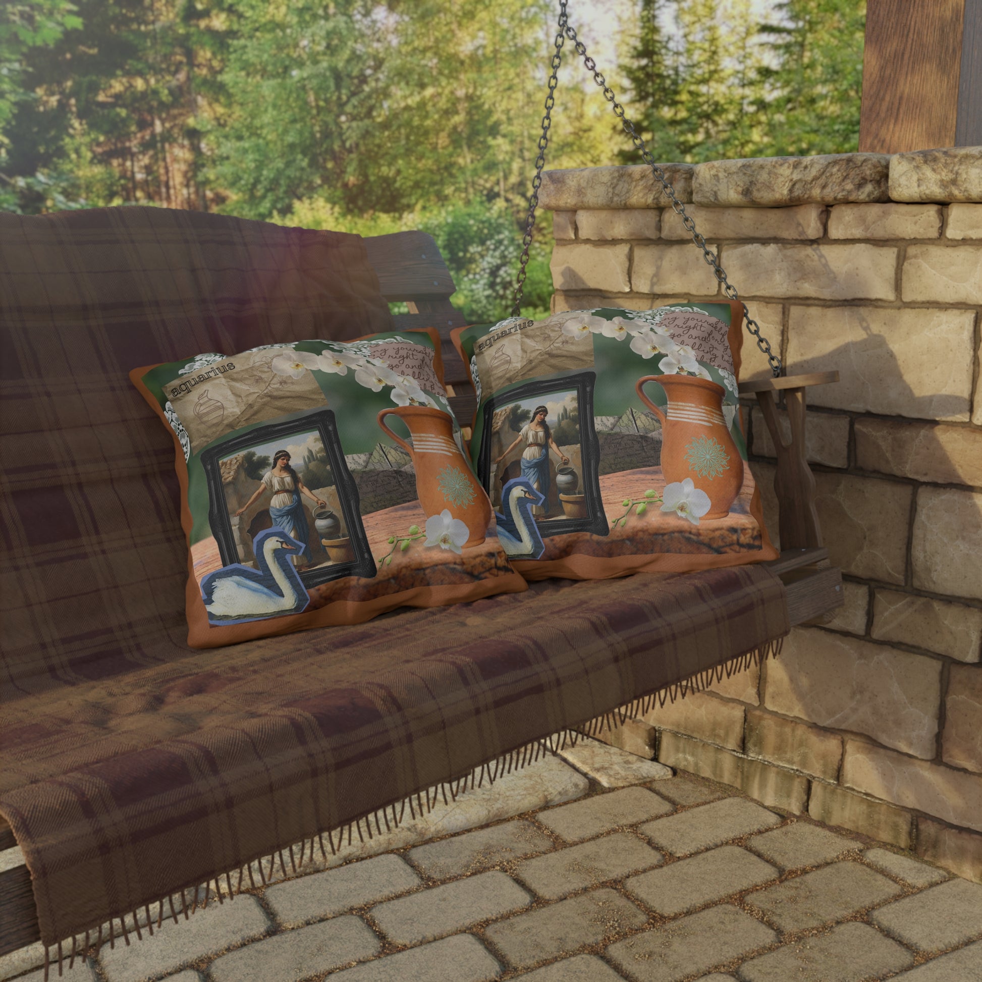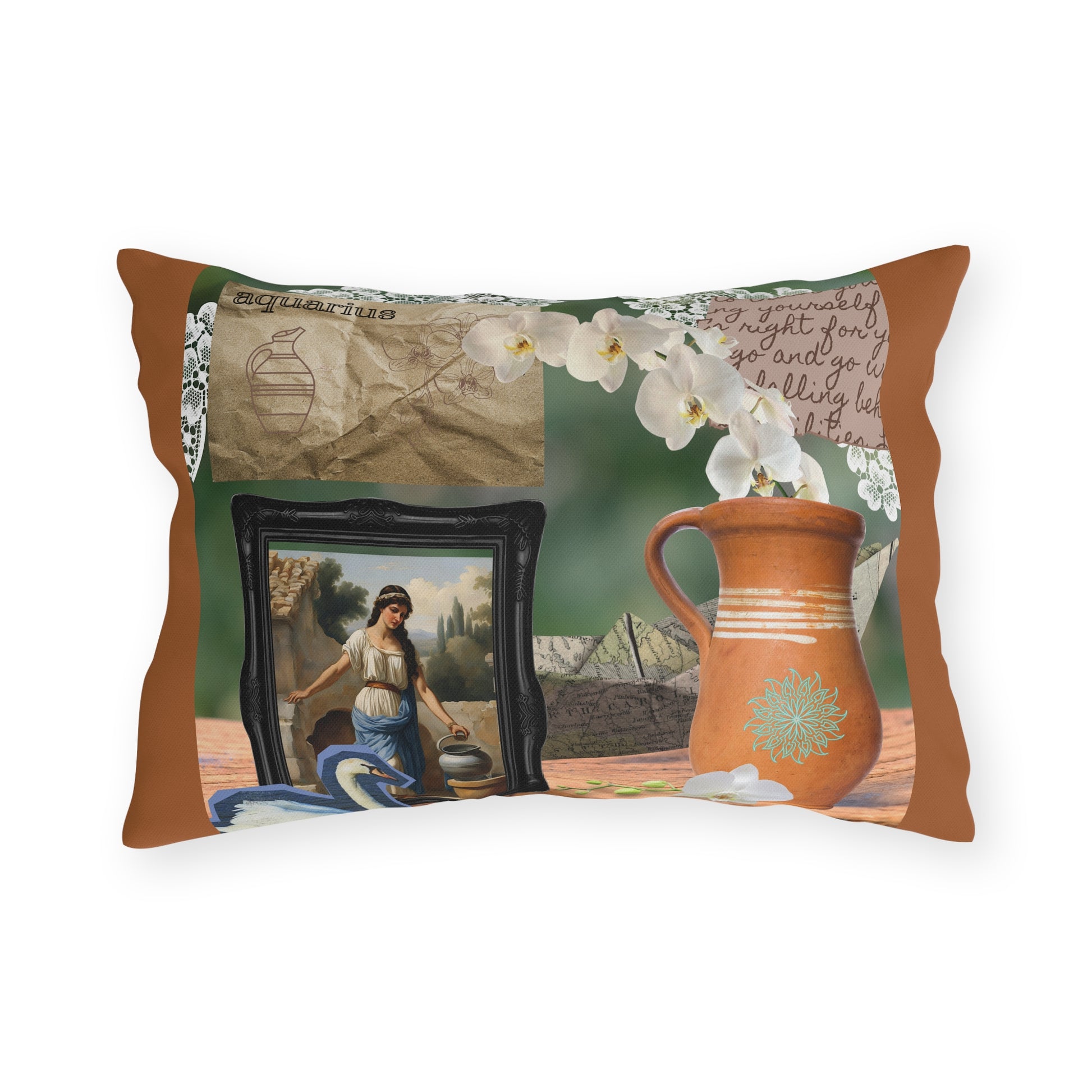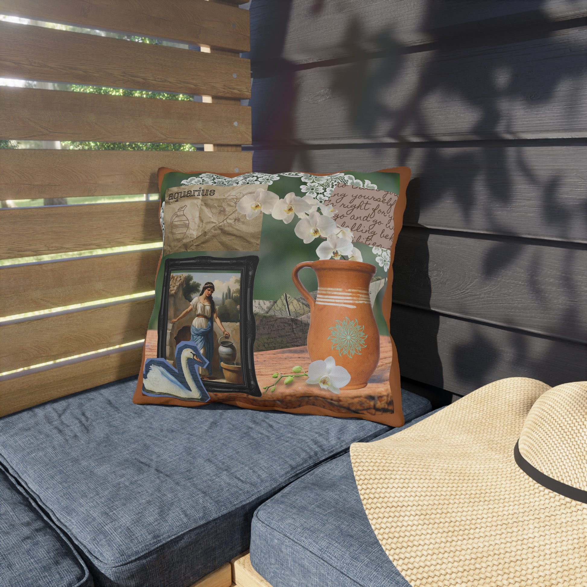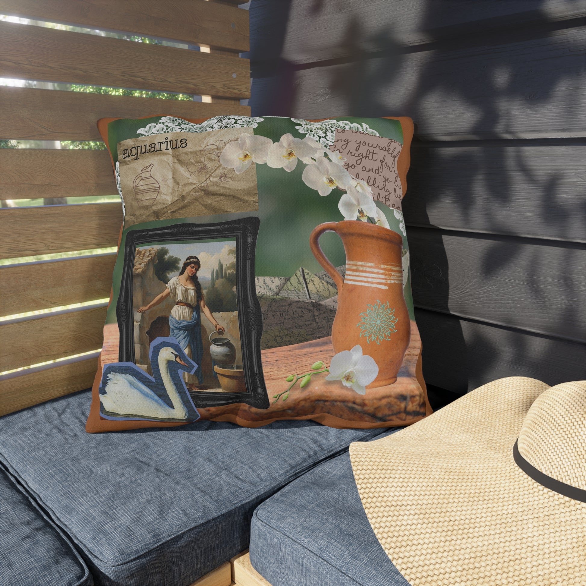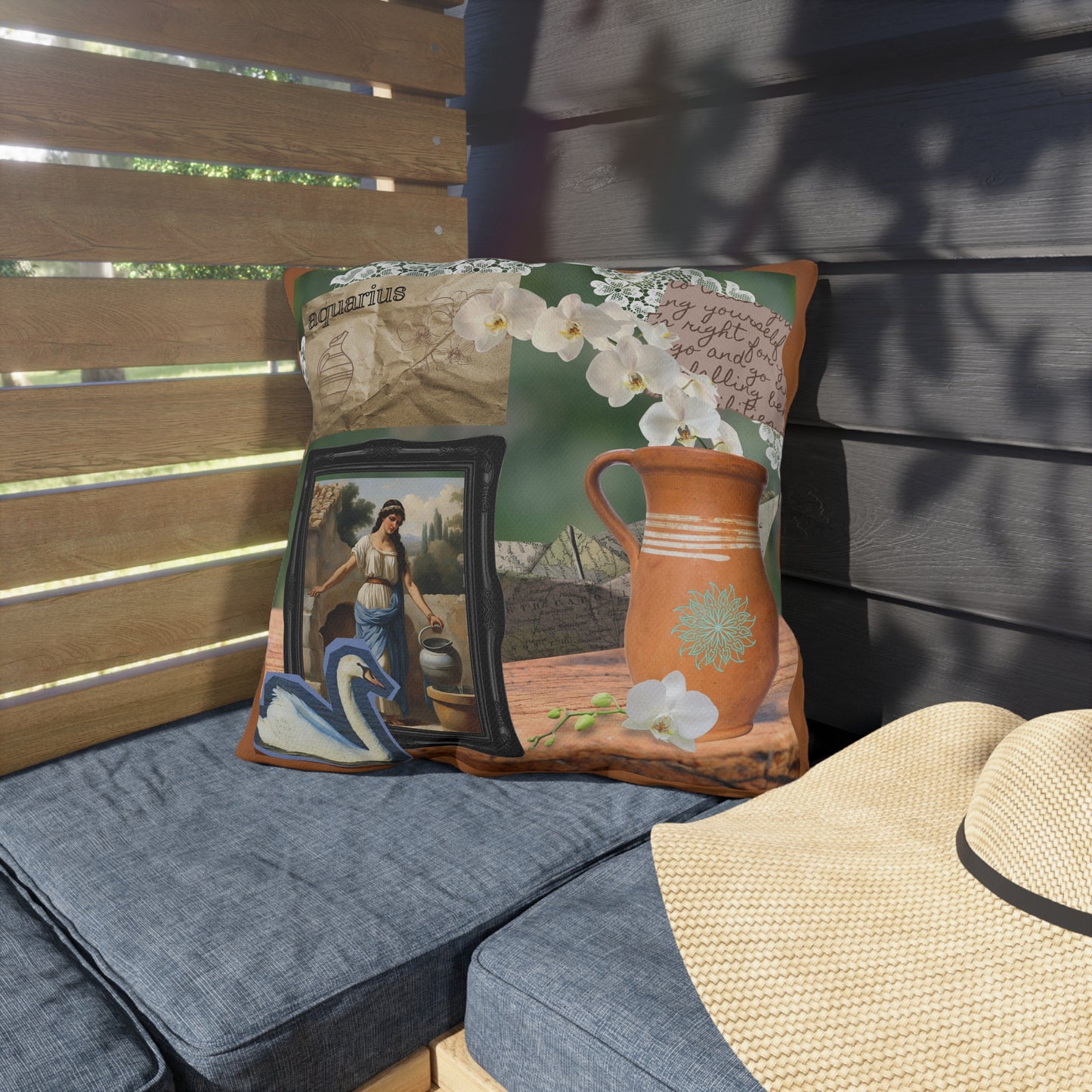 Bring a touch of elegance to your outdoor space with these vibrant and comfortable pillows featuring a mesmerizing illustration of an Aquarius woman, gracefully pouring water from a jug, symbolizing the water-bearer. Her serene expression and classic attire reflect the nurturing and humanitarian spirit of Aquarius. The background features a blend of rustic and botanical elements, including a beautifully illustrated orchid and intricate lace details, adding depth and charm to the design. The presence of a swan and a vintage pitcher further enhances the tranquil and harmonious vibe.