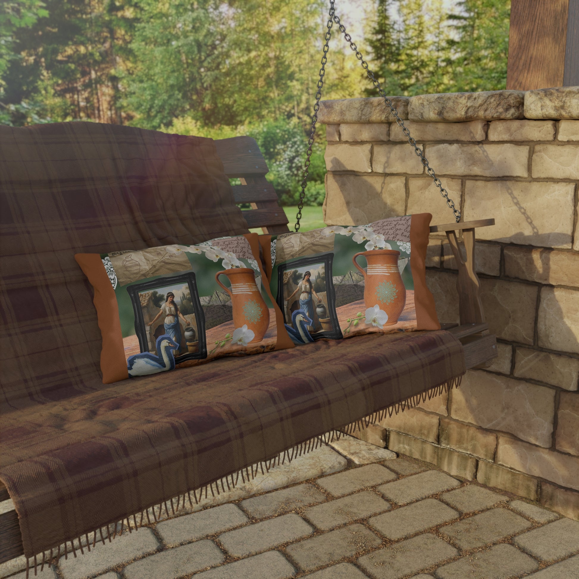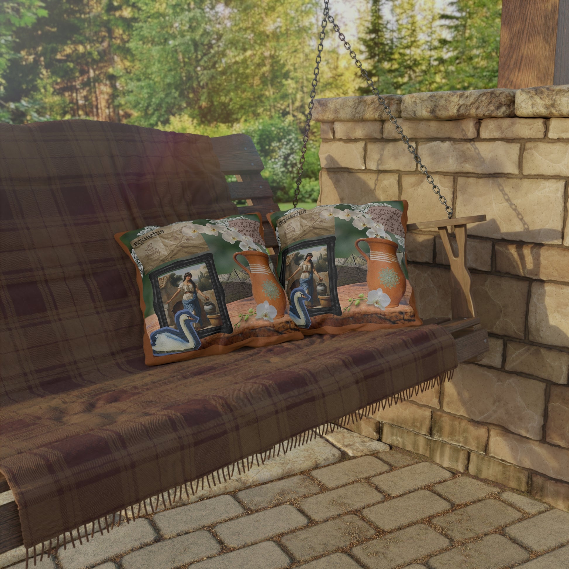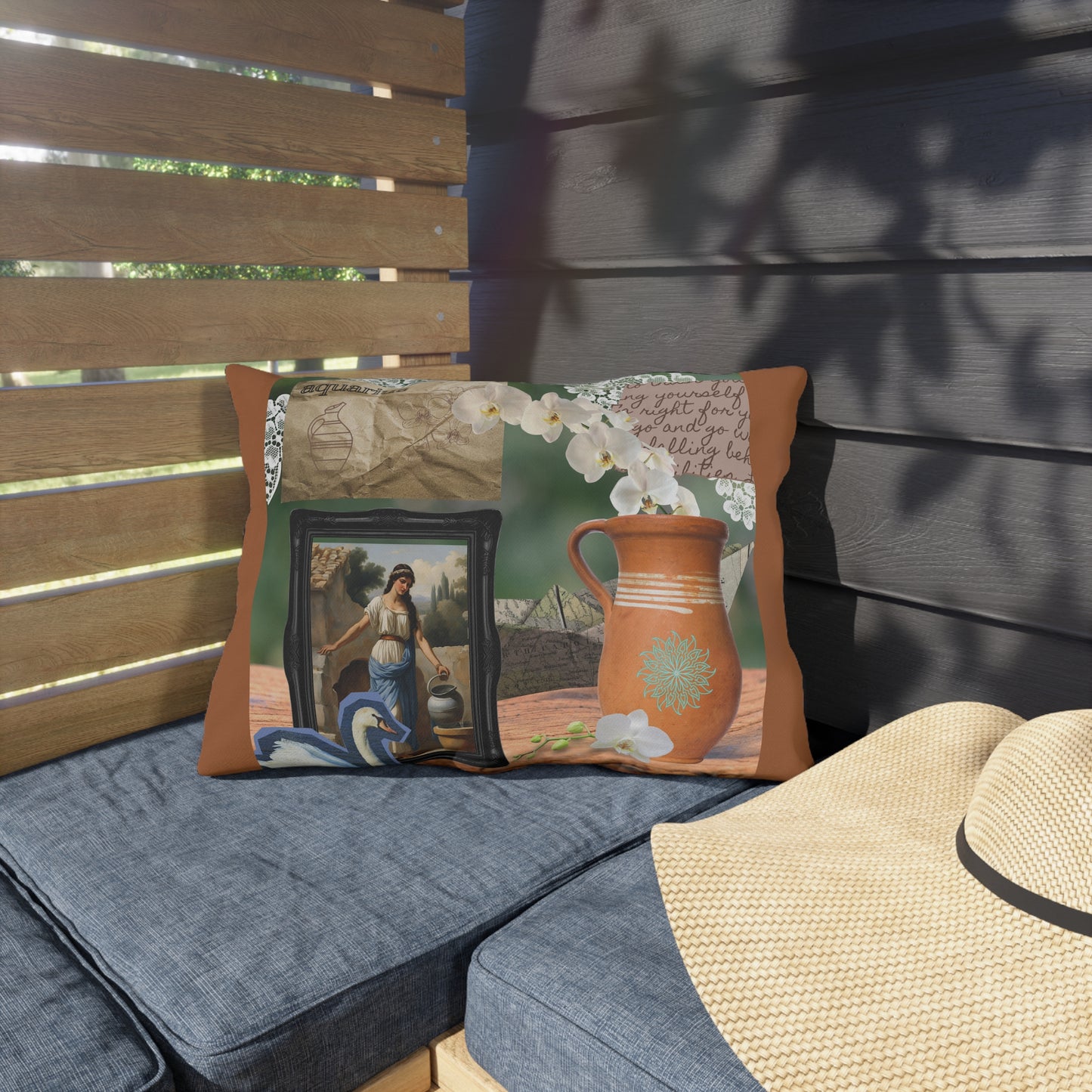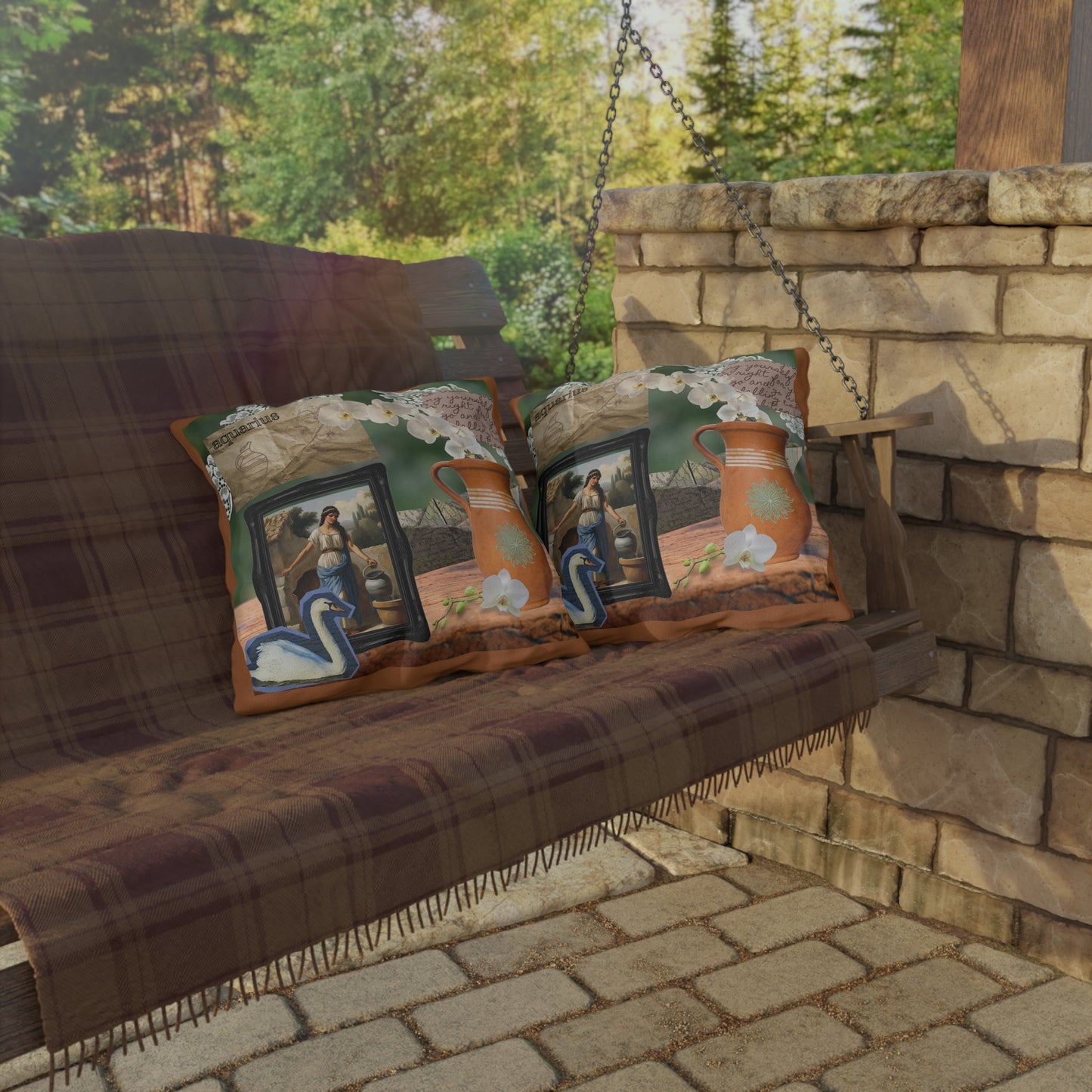 Bring a touch of elegance to your outdoor space with these vibrant and comfortable pillows featuring a mesmerizing illustration of an Aquarius woman, gracefully pouring water from a jug, symbolizing the water-bearer. Her serene expression and classic attire reflect the nurturing and humanitarian spirit of Aquarius. The background features a blend of rustic and botanical elements, including a beautifully illustrated orchid and intricate lace details, adding depth and charm to the design. The presence of a swan and a vintage pitcher further enhances the tranquil and harmonious vibe.
