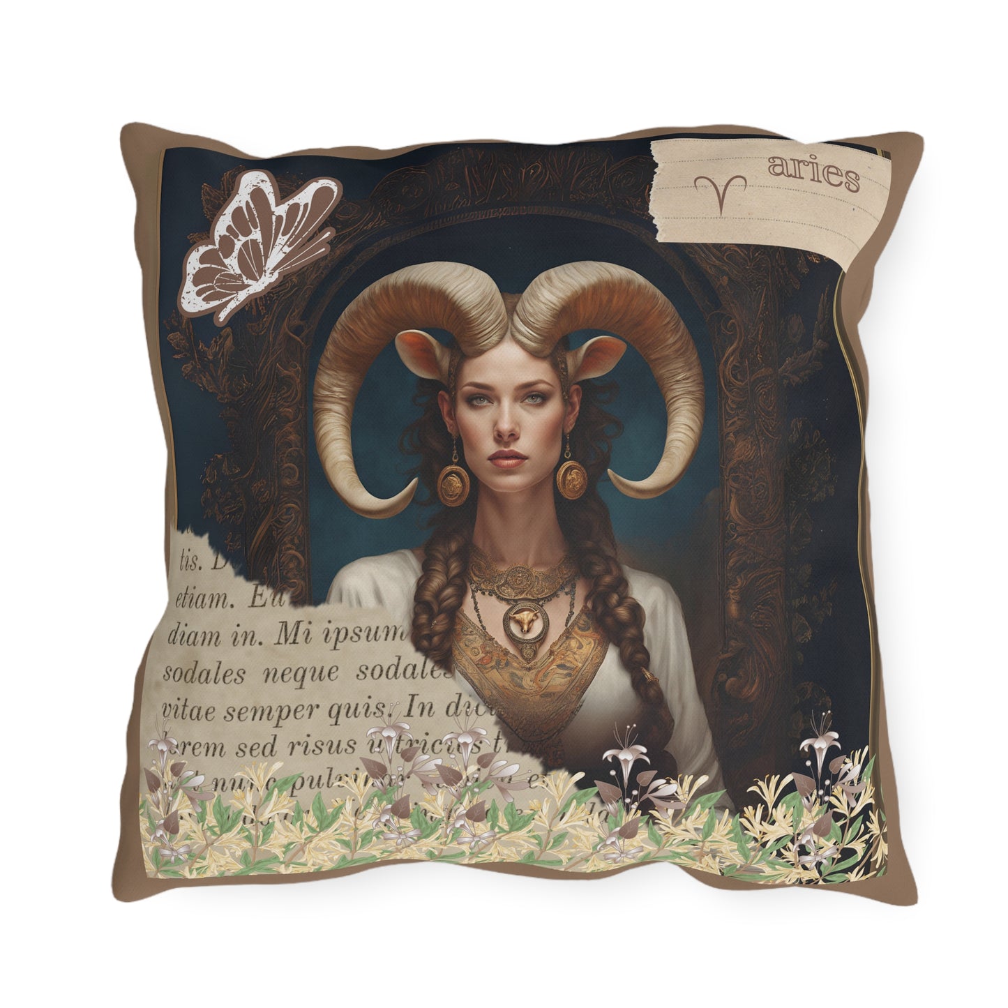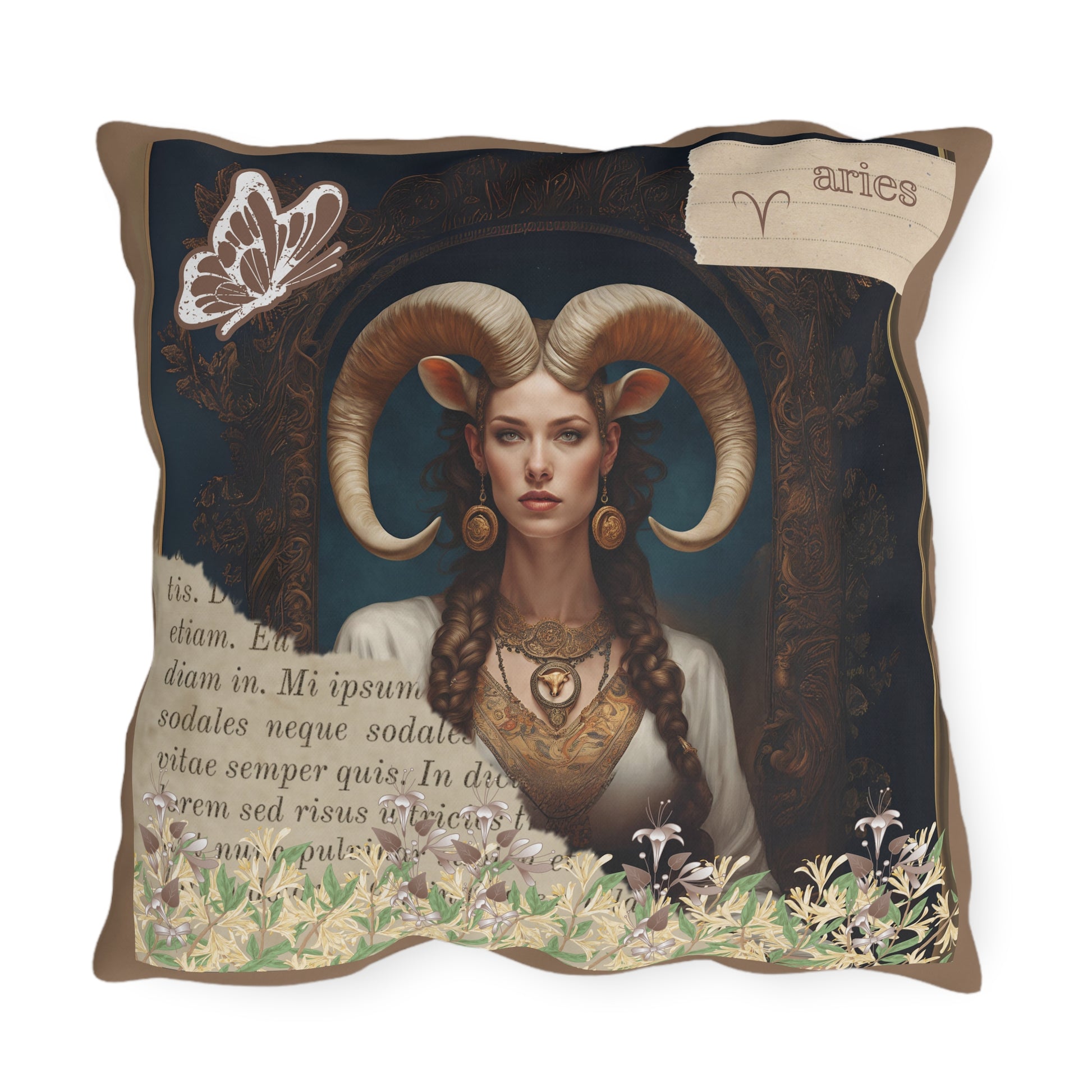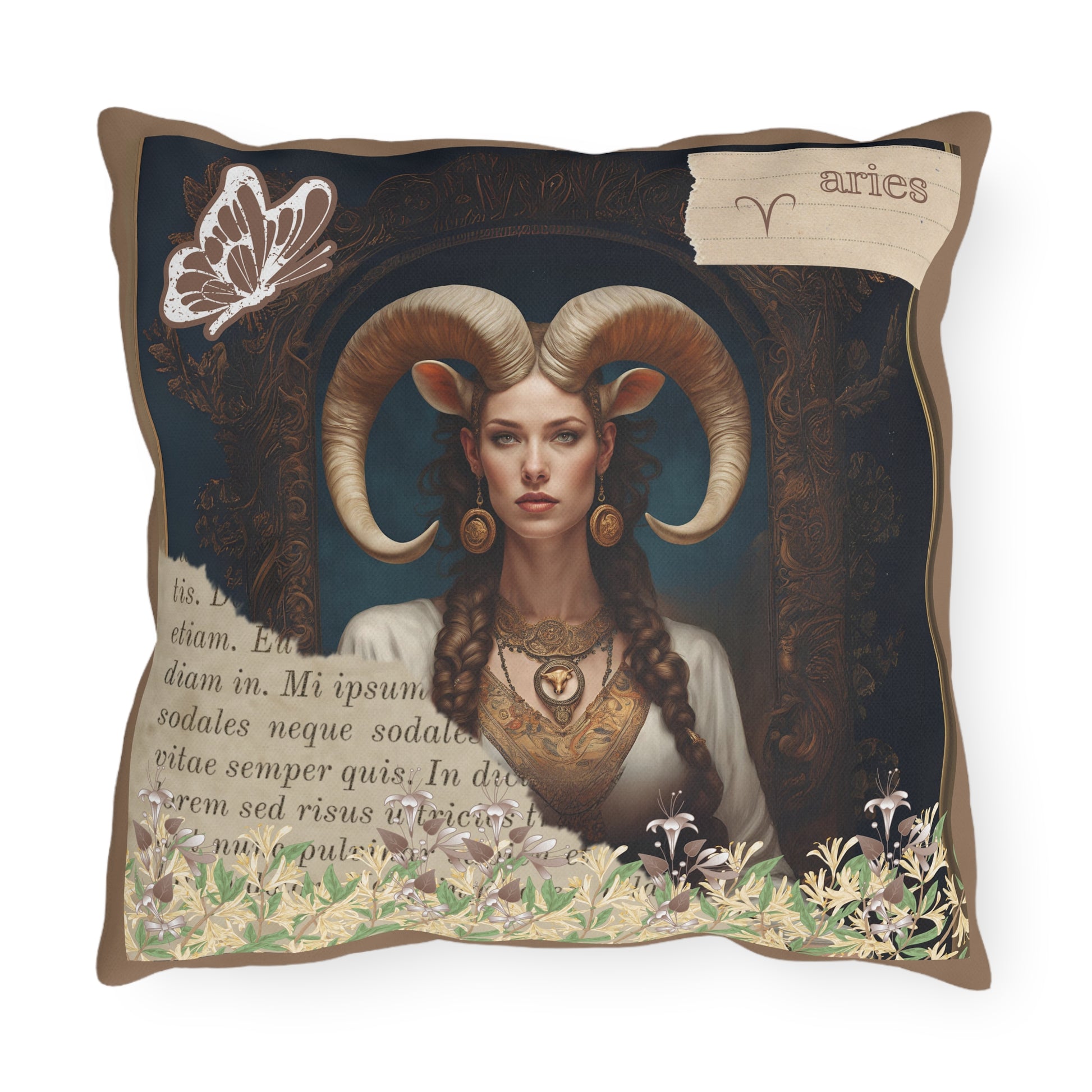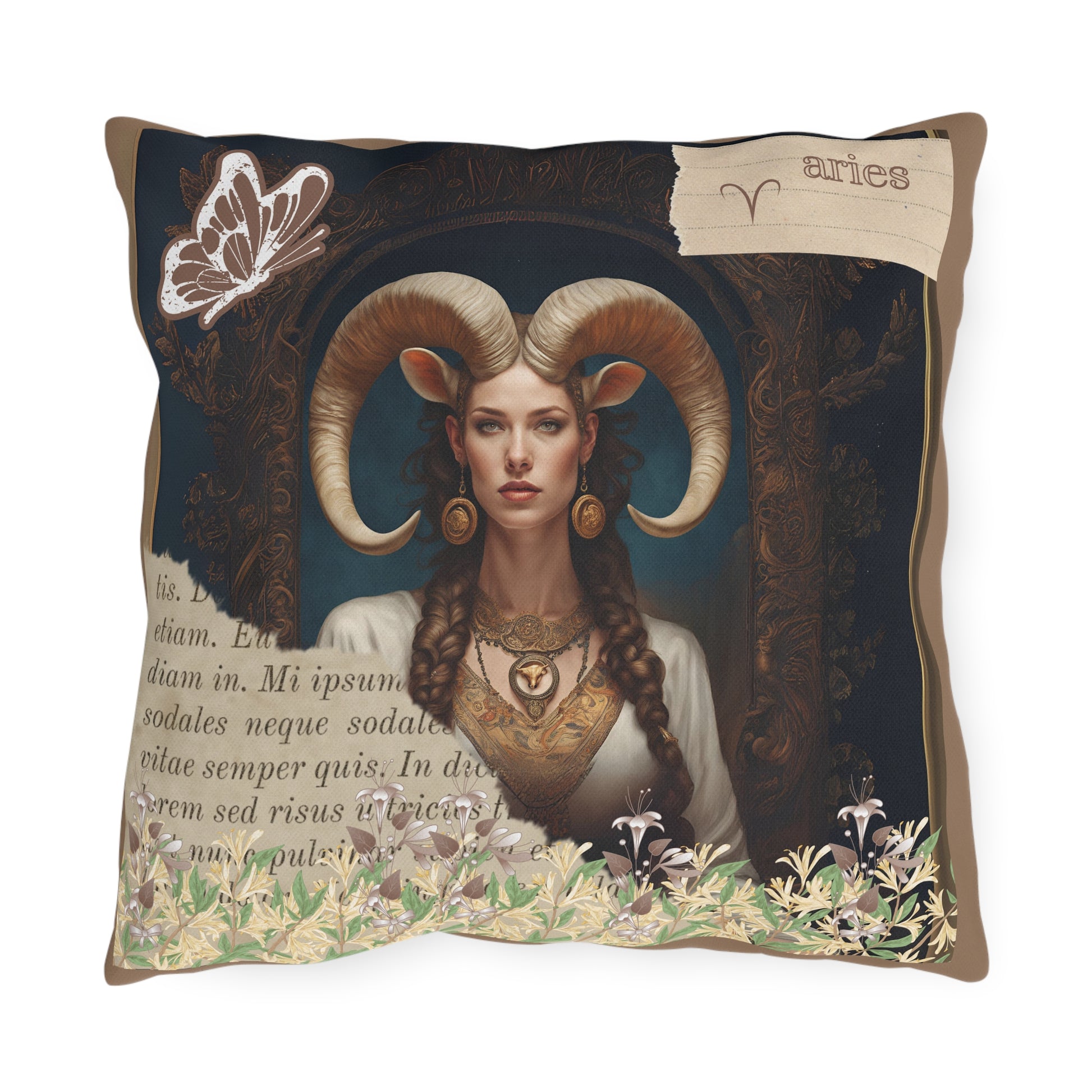 Bring a touch of elegance to your outdoor space with these vibrant and comfortable pillows featuring a captivating image of a regal Aries woman, embodying strength and elegance. Her majestic horns add a touch of mythical allure, while her poised and confident demeanor reflects the bold and pioneering nature of Aries. Surrounding her at the base of the image is a lush gathering of honeysuckle, symbolizing rebirth and new beginnings—qualities that are inherently Aries..