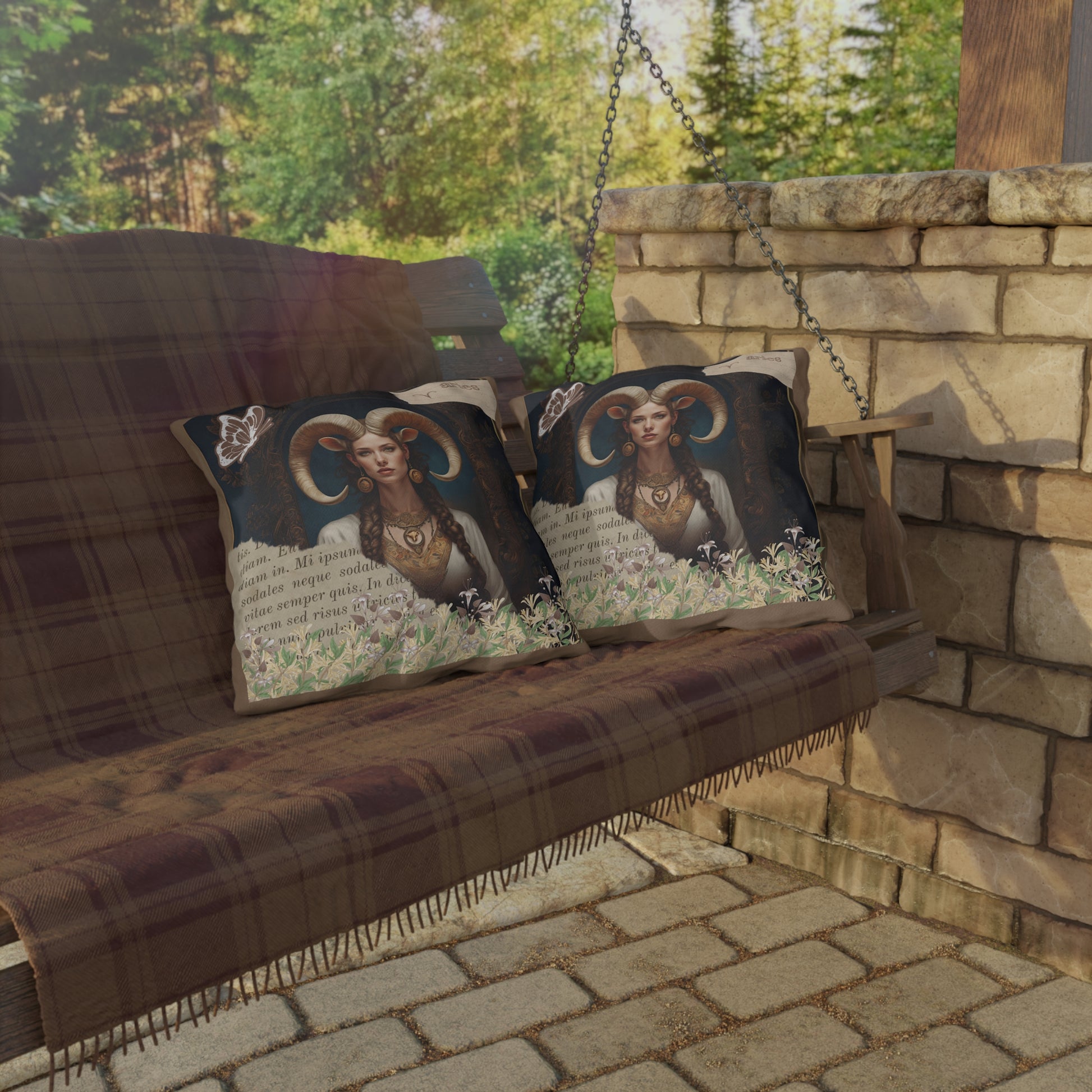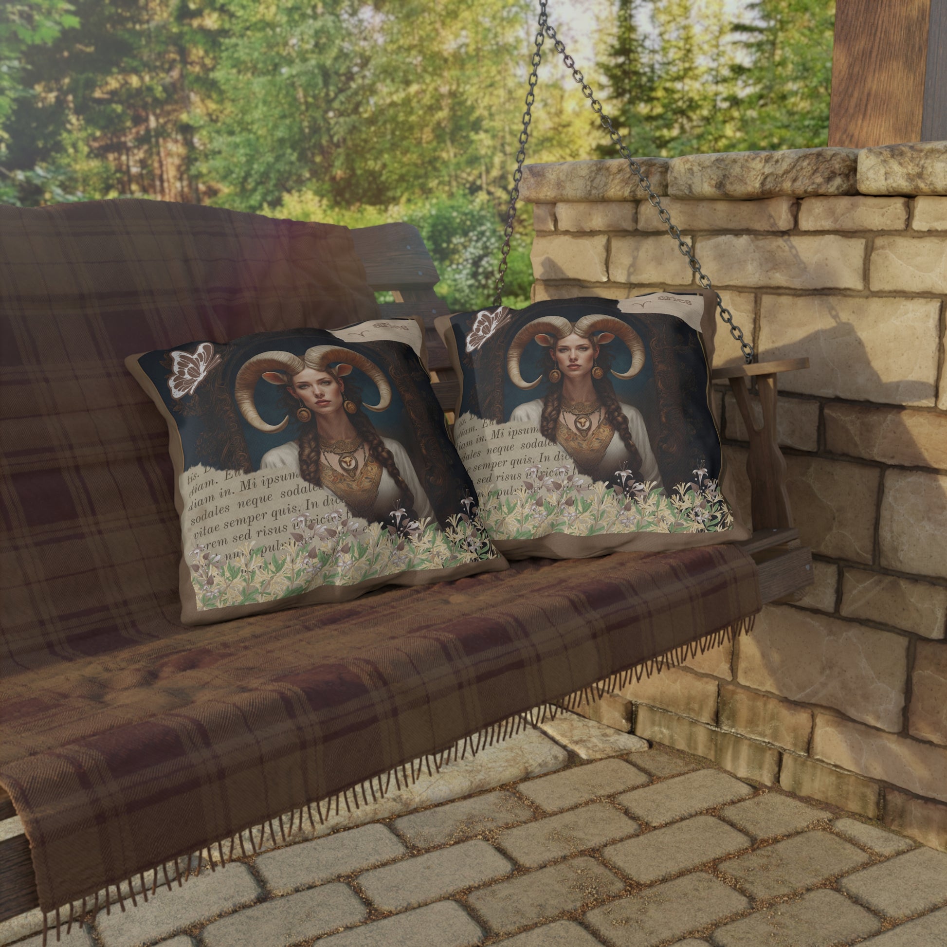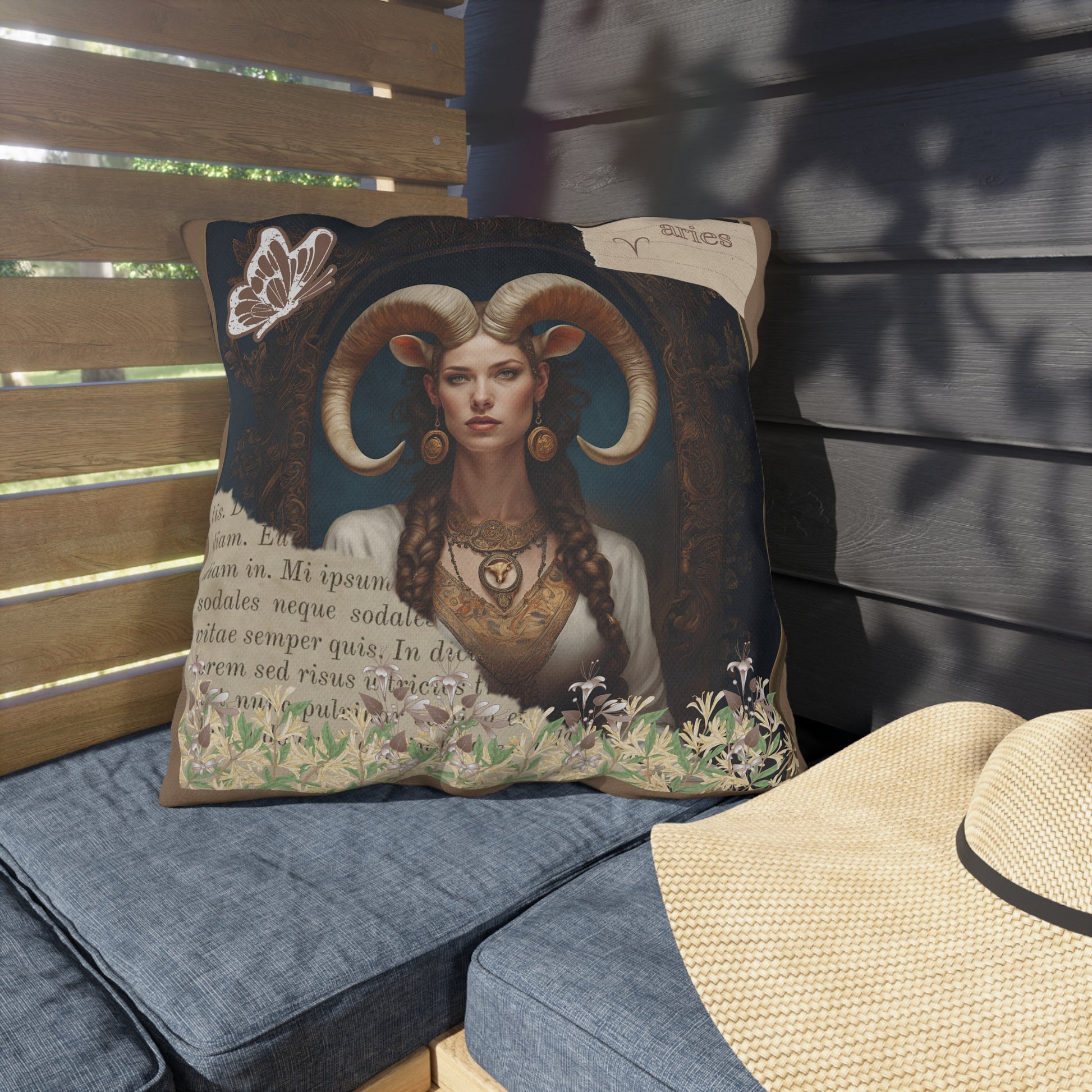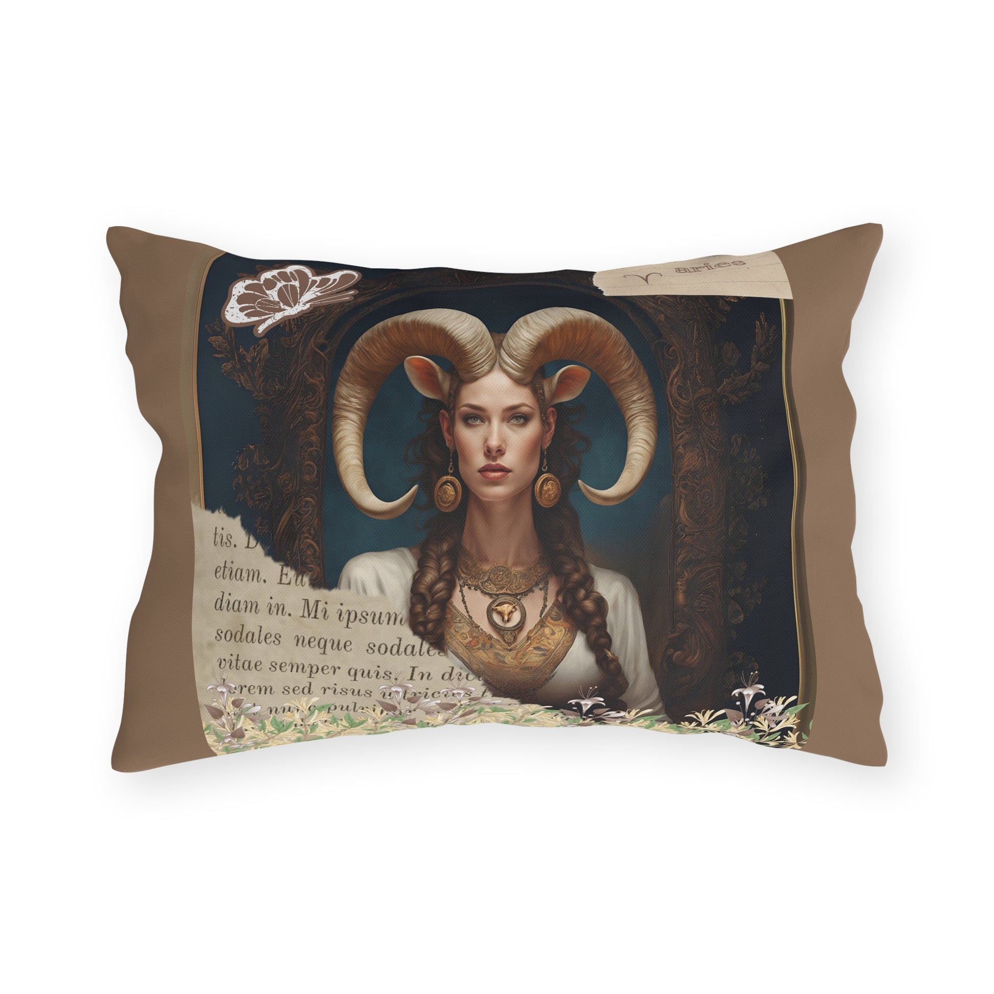 Bring a touch of elegance to your outdoor space with these vibrant and comfortable pillows featuring a captivating image of a regal Aries woman, embodying strength and elegance. Her majestic horns add a touch of mythical allure, while her poised and confident demeanor reflects the bold and pioneering nature of Aries. Surrounding her at the base of the image is a lush gathering of honeysuckle, symbolizing rebirth and new beginnings—qualities that are inherently Aries..