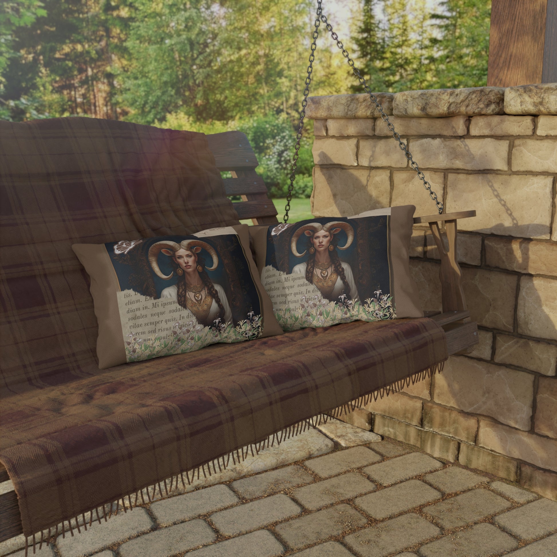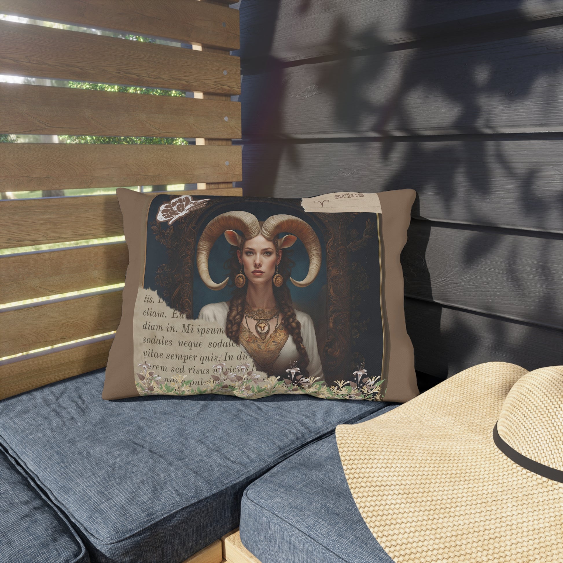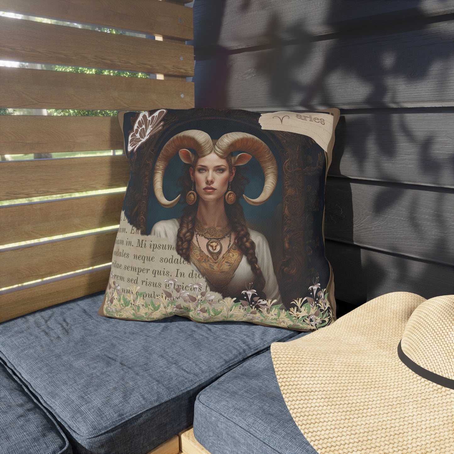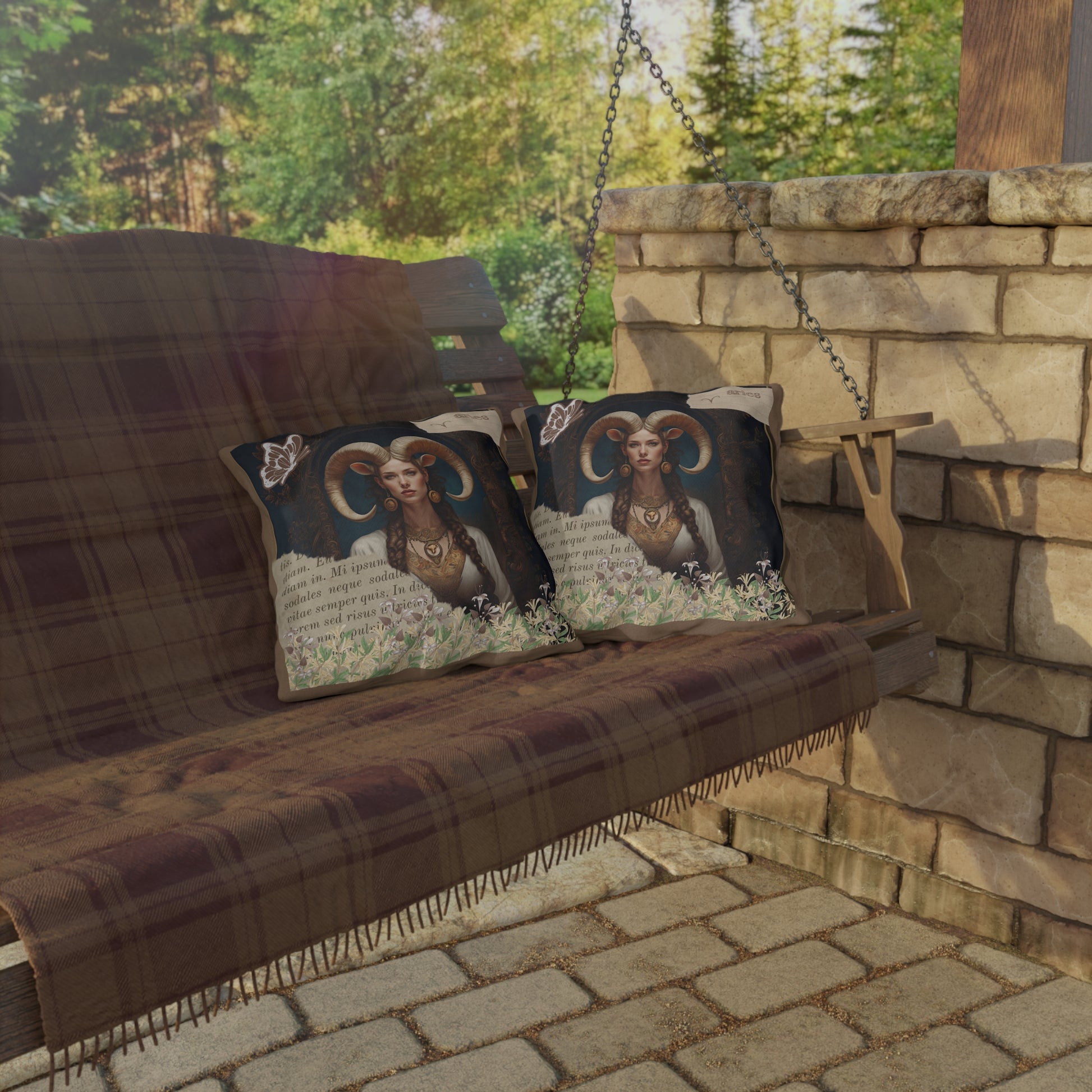 Bring a touch of elegance to your outdoor space with these vibrant and comfortable pillows featuring a captivating image of a regal Aries woman, embodying strength and elegance. Her majestic horns add a touch of mythical allure, while her poised and confident demeanor reflects the bold and pioneering nature of Aries. Surrounding her at the base of the image is a lush gathering of honeysuckle, symbolizing rebirth and new beginnings—qualities that are inherently Aries..