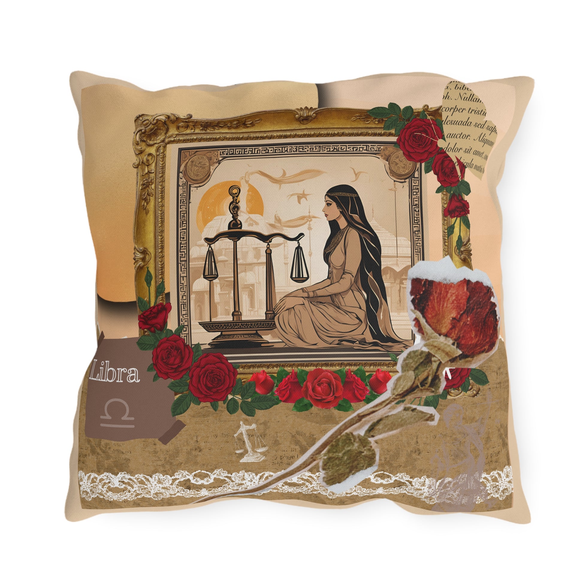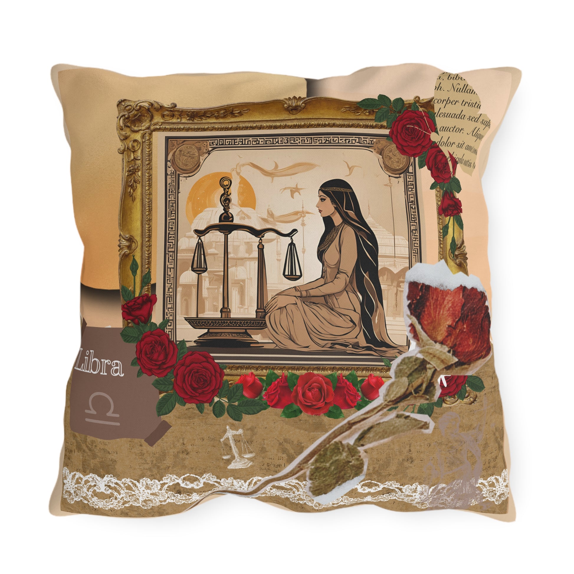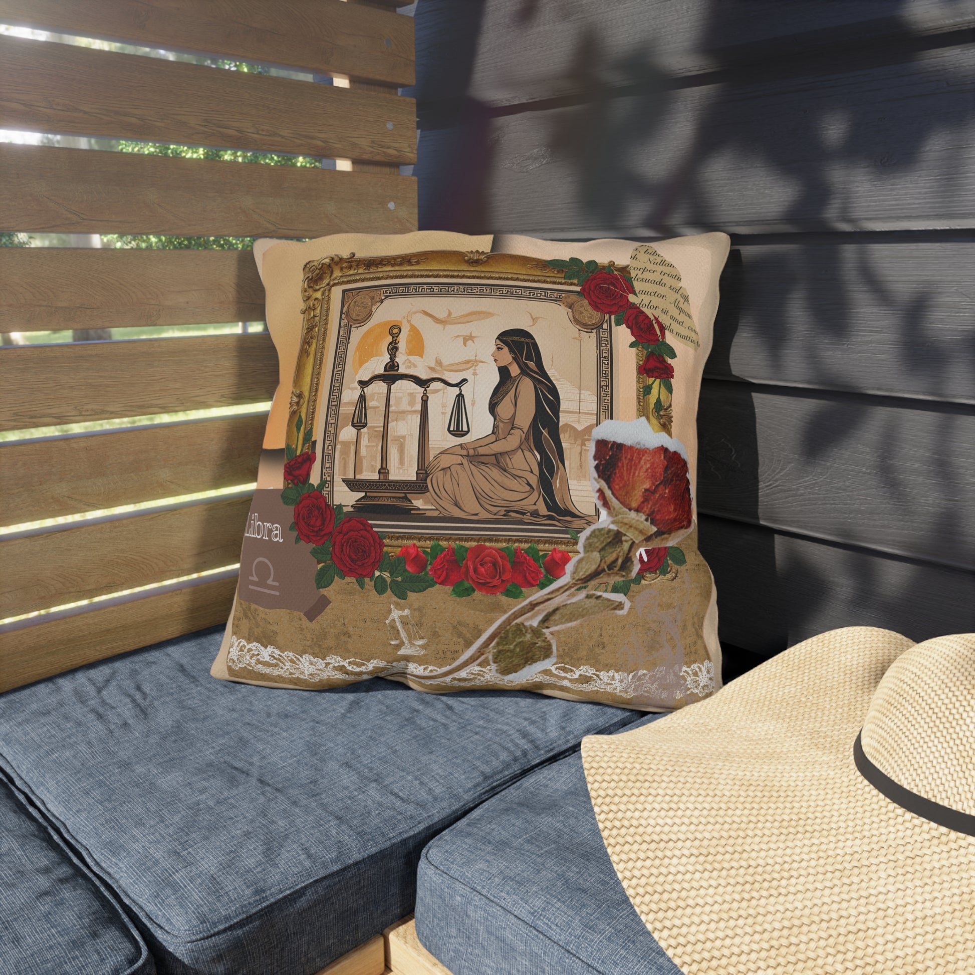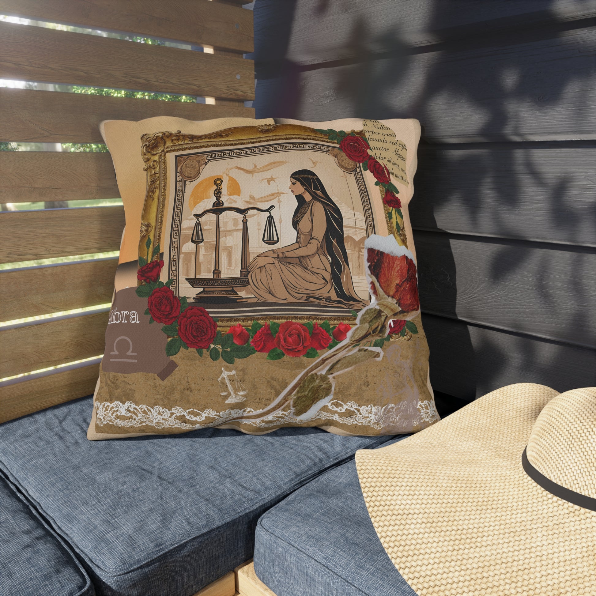 Bring a touch of elegance to your outdoor space with these vibrant and comfortable pillows featuring a graceful woman standing before a pair of balanced scales, embodying the Libra sign's core value of harmony and justice. She is surrounded by delicate roses, which symbolize beauty, love, and refinement—all traits associated with Libra.