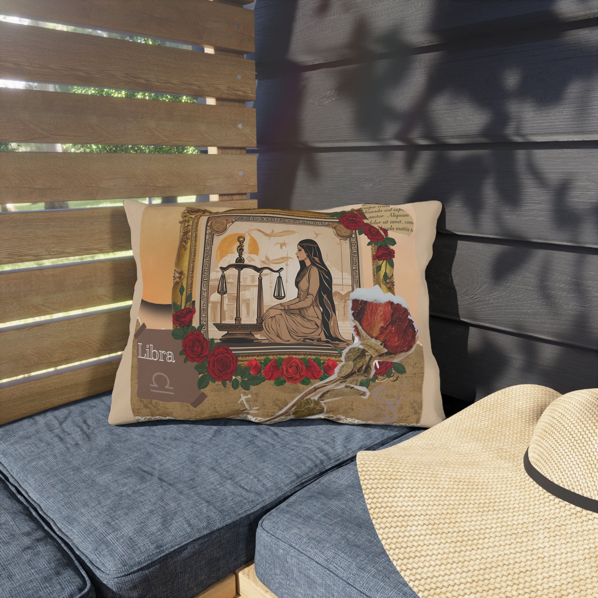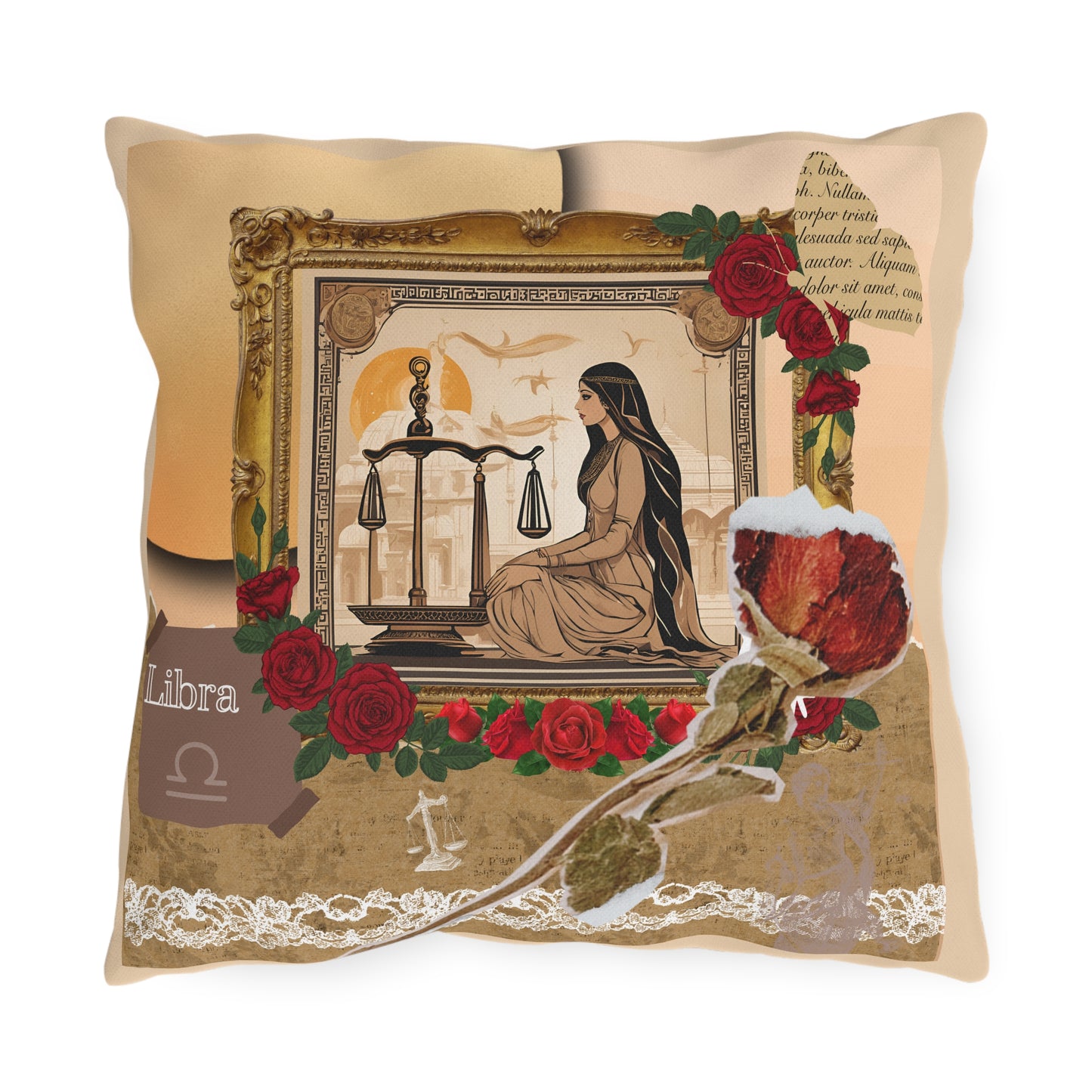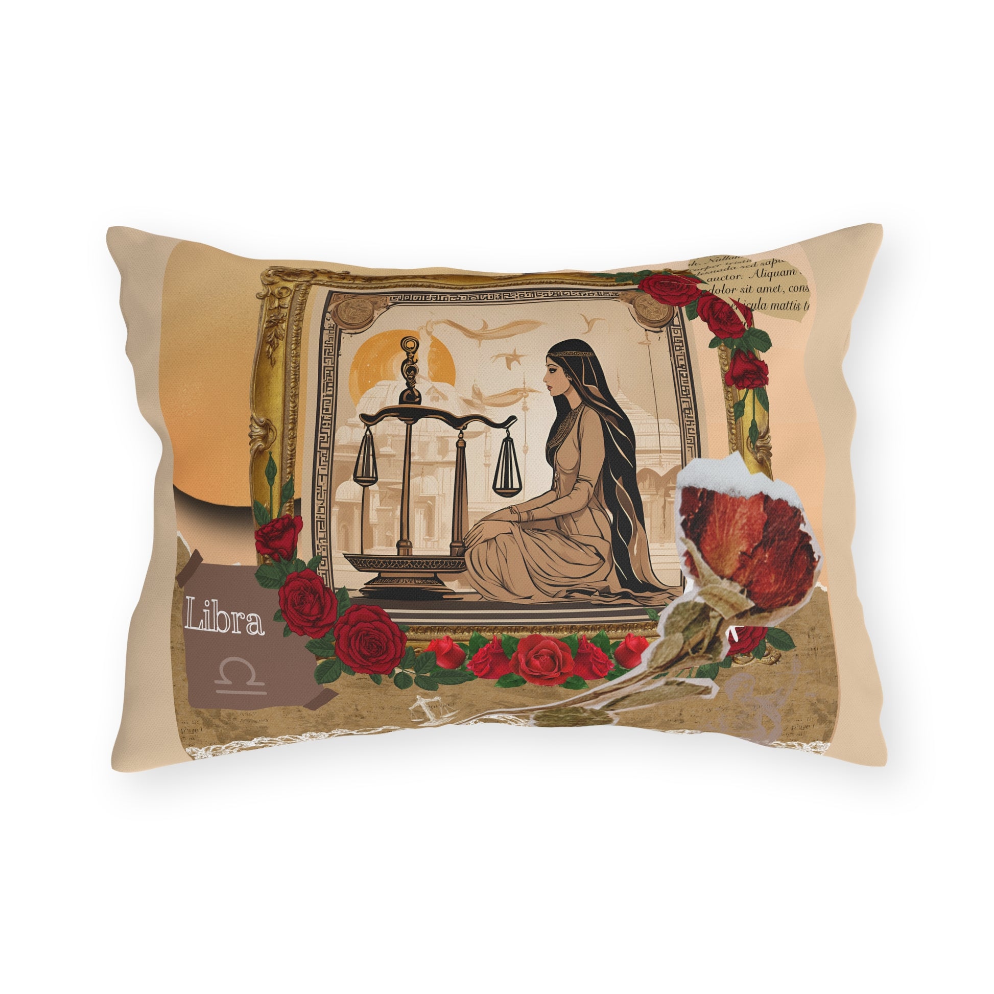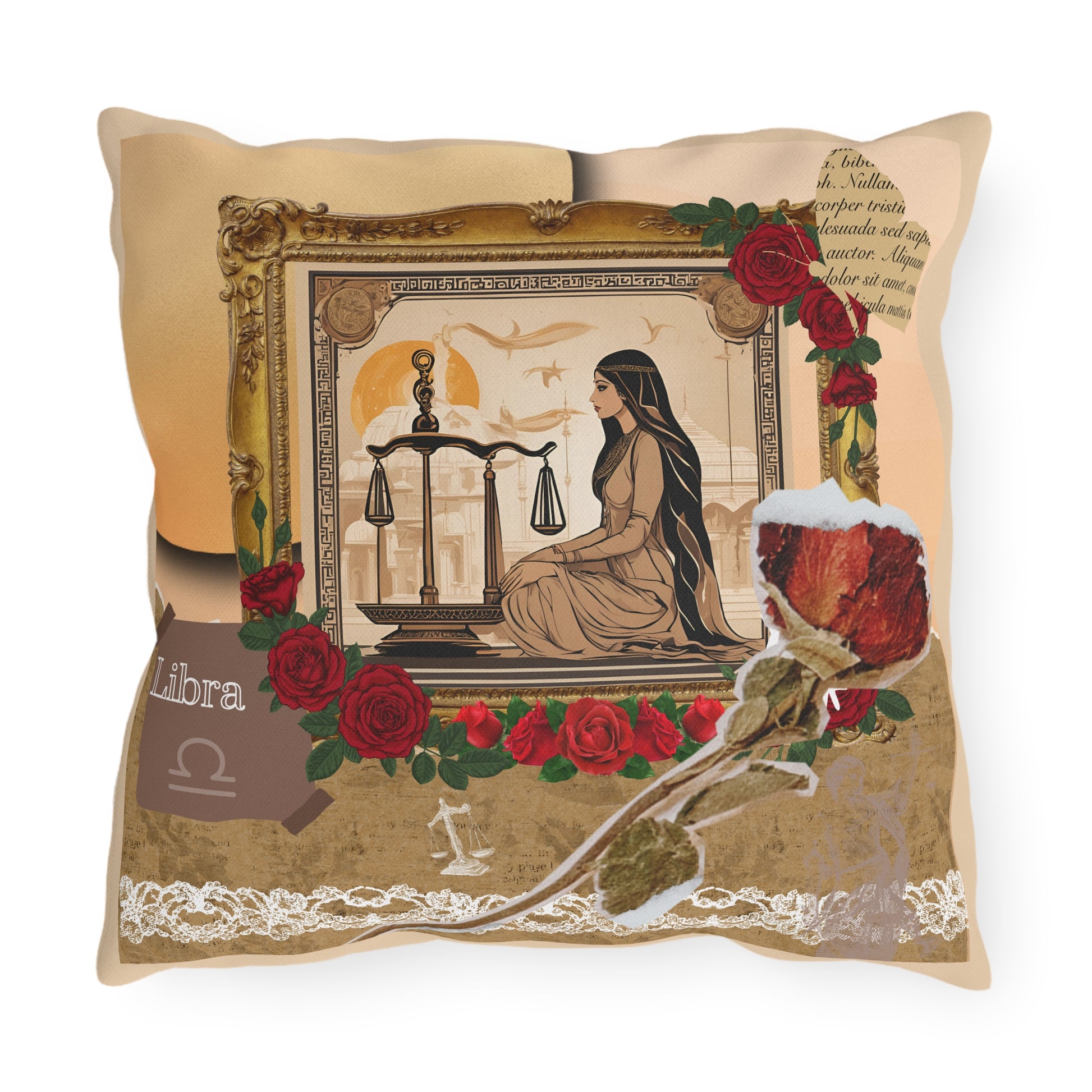 Bring a touch of elegance to your outdoor space with these vibrant and comfortable pillows featuring a graceful woman standing before a pair of balanced scales, embodying the Libra sign's core value of harmony and justice. She is surrounded by delicate roses, which symbolize beauty, love, and refinement—all traits associated with Libra.