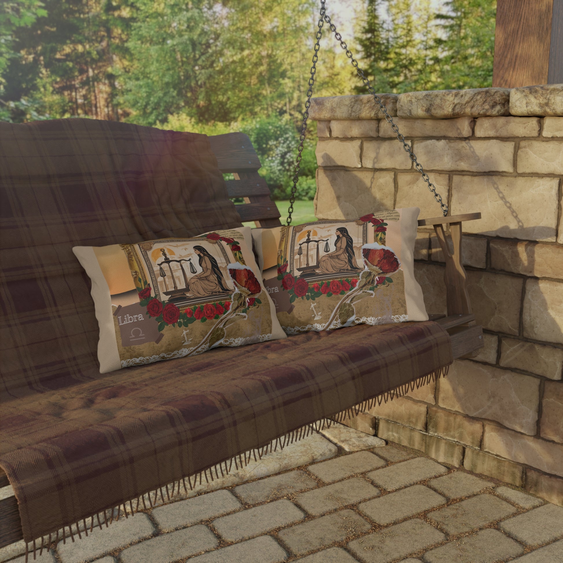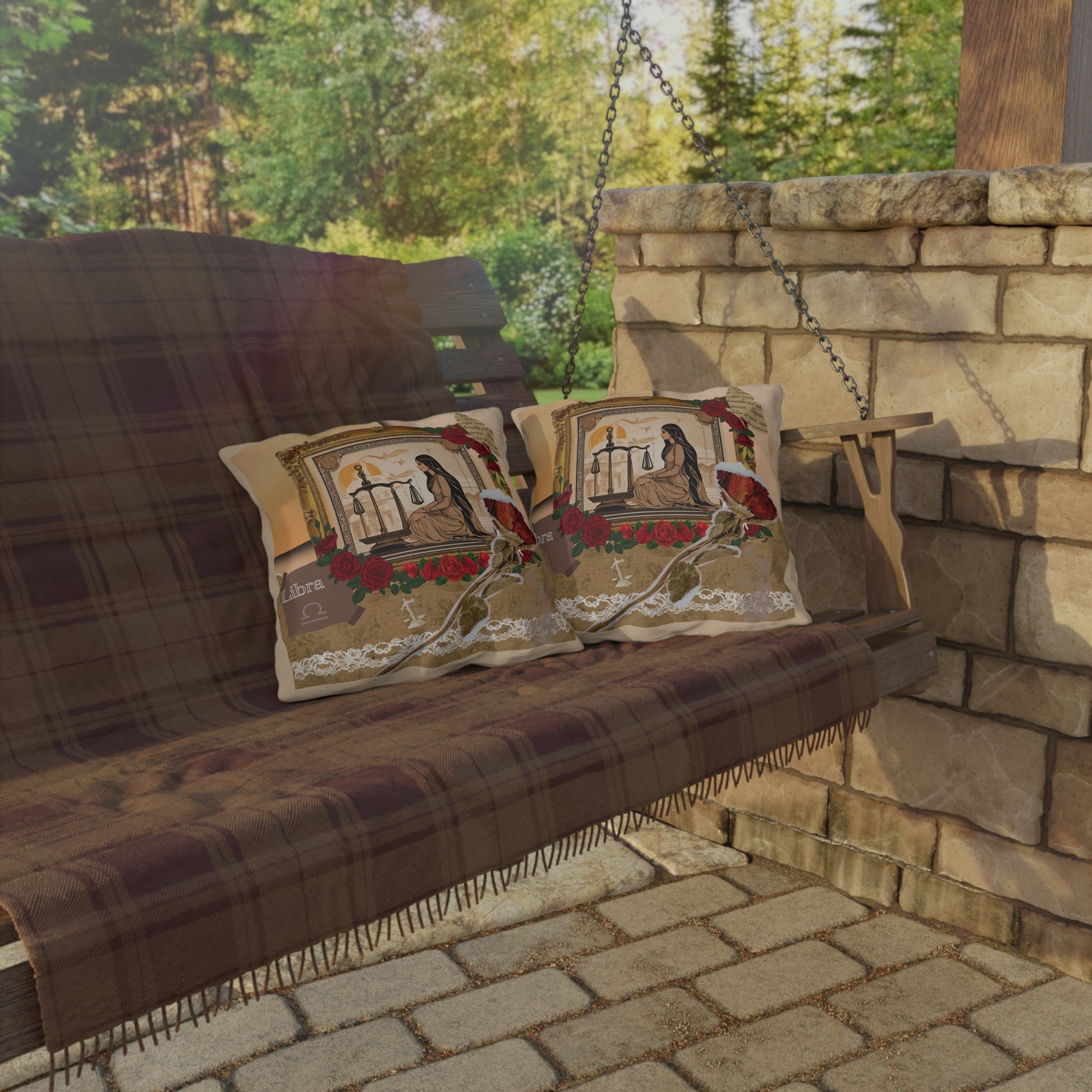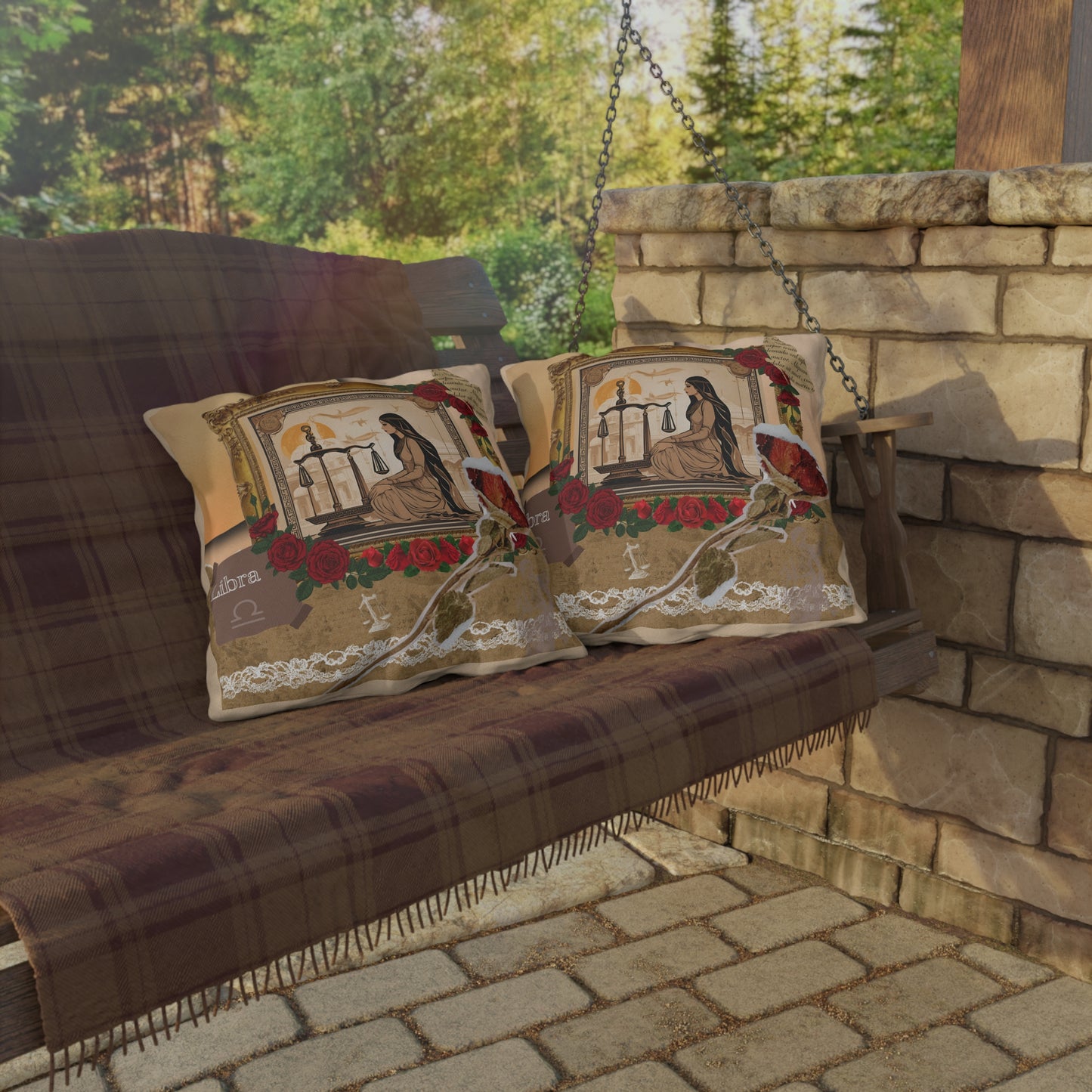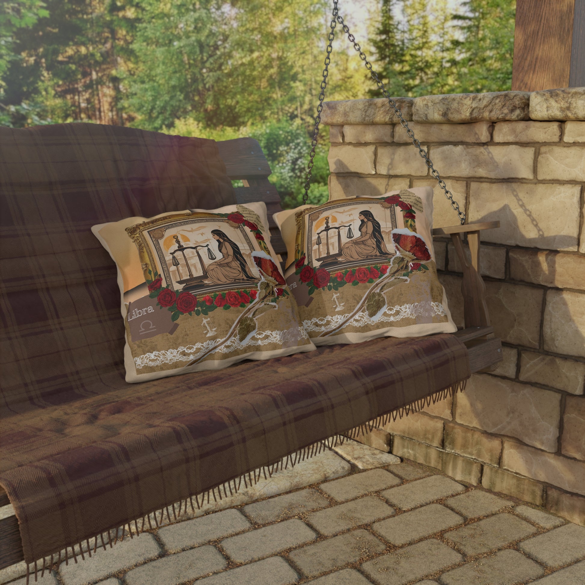 Bring a touch of elegance to your outdoor space with these vibrant and comfortable pillows featuring a graceful woman standing before a pair of balanced scales, embodying the Libra sign's core value of harmony and justice. She is surrounded by delicate roses, which symbolize beauty, love, and refinement—all traits associated with Libra.