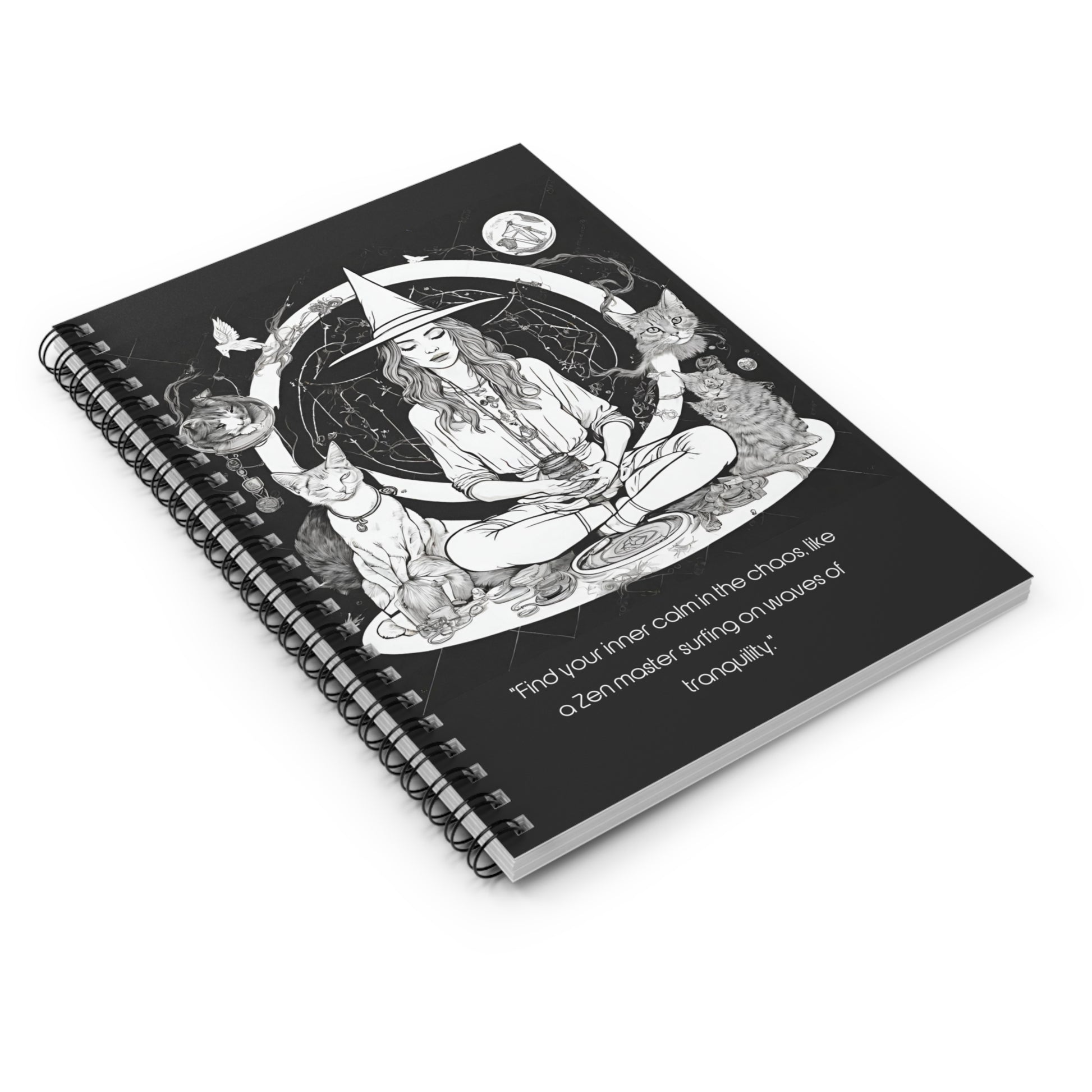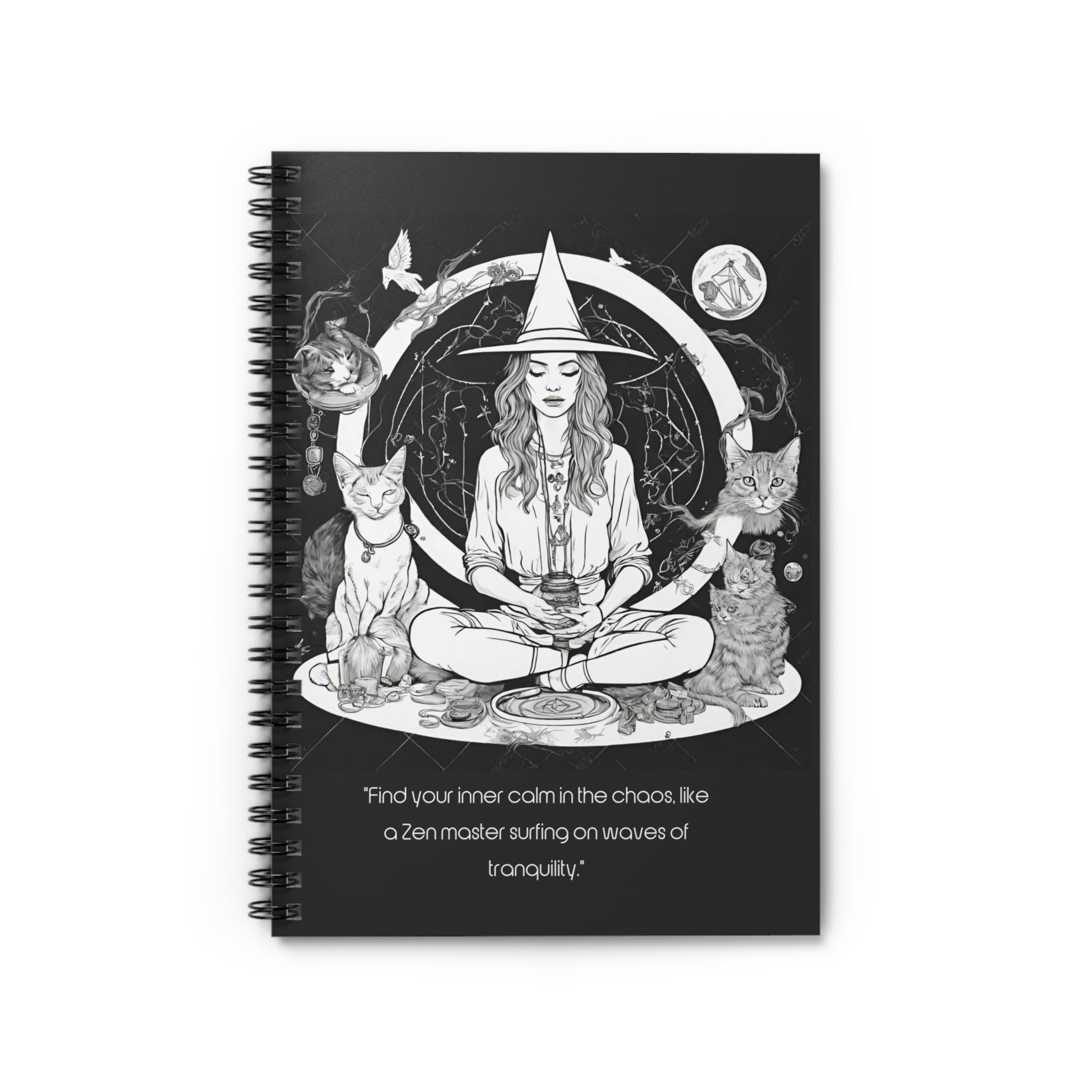 Introducing our exquisite journal, designed to inspire a sense of tranquility and serenity within your daily life. Picture a modern witch, surrounded by her loyal feline familiars, guiding you on a journey to find your inner calm amidst the chaos. With each turn of the page, discover a sanctuary for your ideas and thoughts, allowing you to explore and capture moments of pure tranquility. This journal is your gateway to peace, where you can effortlessly navigate the waves of life, just like a Zen master gracefully surfing on waves of tranquility. Embrace the magical energy within and let your thoughts flow freely as you navigate the pages of this enchanting journal.