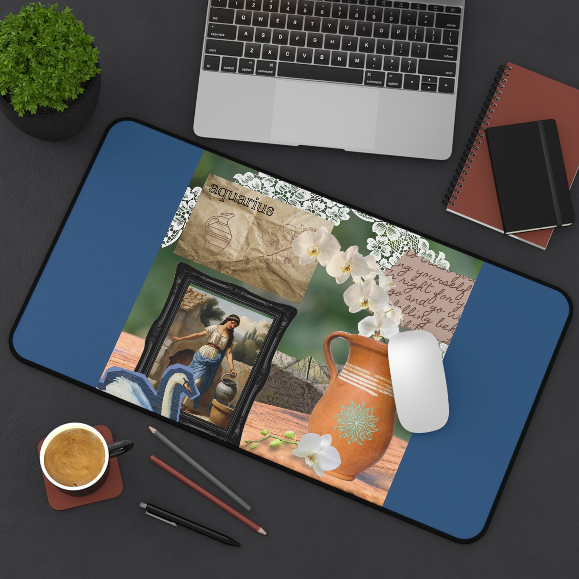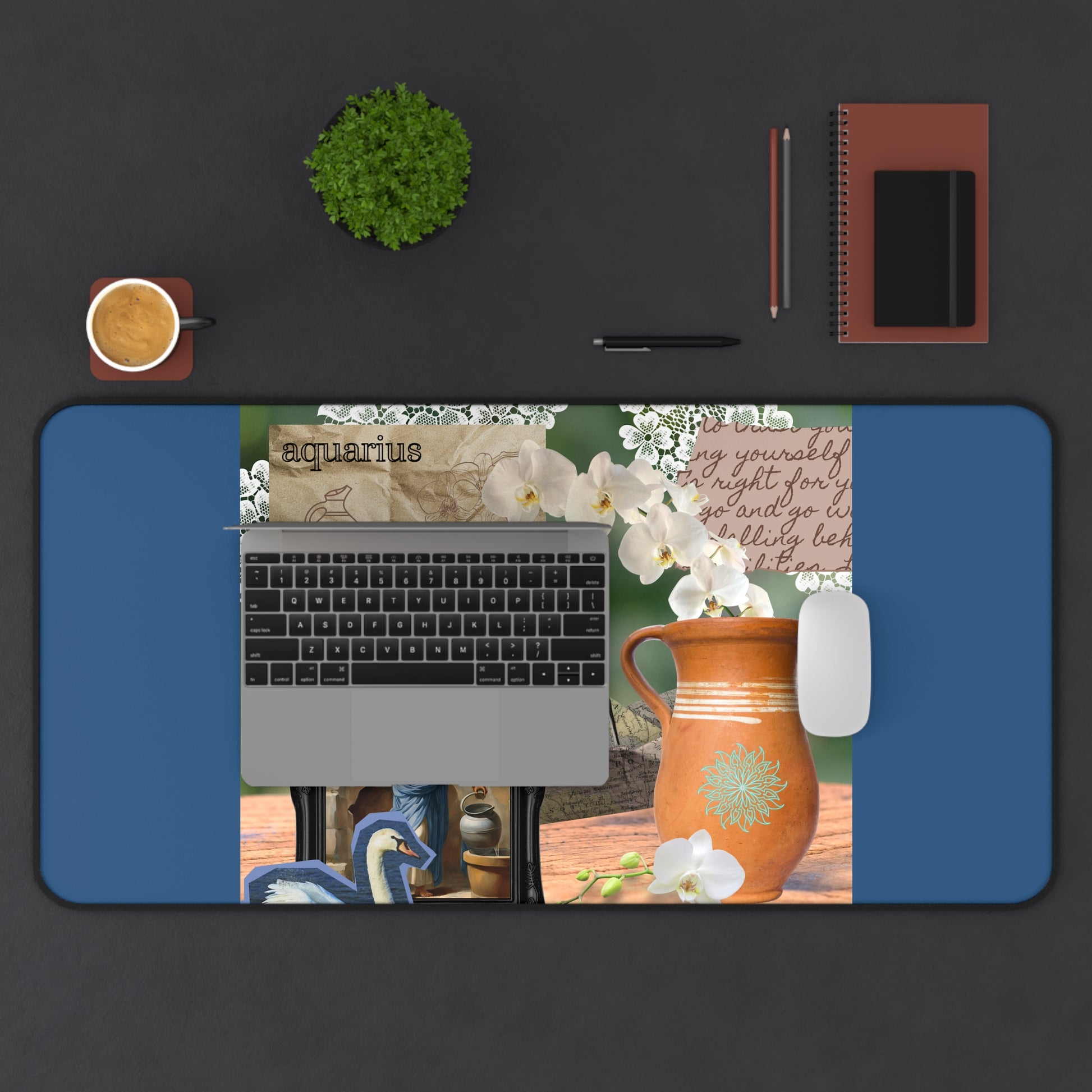 The desk mat showcases a mesmerizing illustration of an Aquarius woman, gracefully pouring water from a jug, symbolizing the water-bearer. Her serene expression and classic attire reflect the nurturing and humanitarian spirit of Aquarius. The background features a blend of rustic and botanical elements, including a beautifully illustrated orchid and intricate lace details, adding depth and charm to the design. The presence of a swan and a vintage pitcher further enhances the tranquil and harmonious vibe.