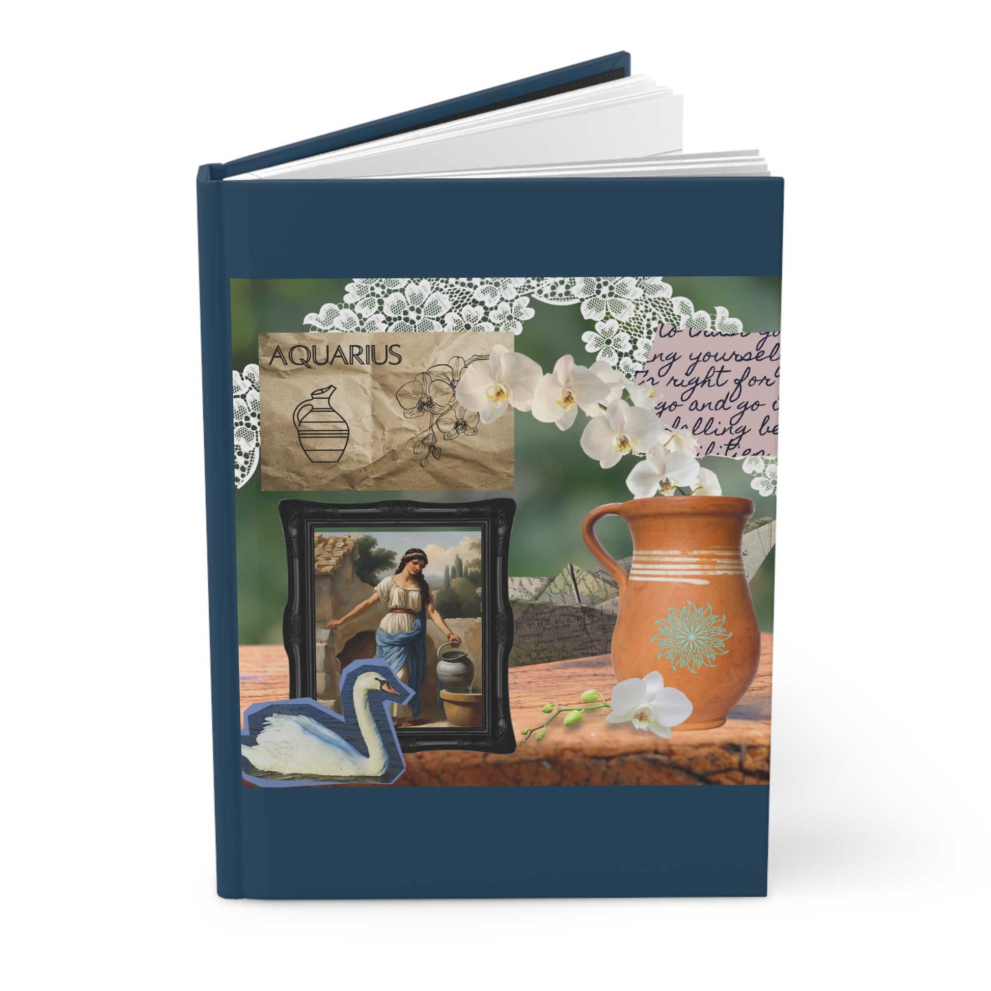 The journal showcases a mesmerizing illustration of an Aquarius woman, gracefully pouring water from a jug, symbolizing the water-bearer. Her serene expression and classic attire reflect the nurturing and humanitarian spirit of Aquarius. The background features a blend of rustic and botanical elements, including a beautifully illustrated orchid and intricate lace details, adding depth and charm to the design. The presence of a swan and a vintage pitcher further enhances the tranquil and harmonious vibe.