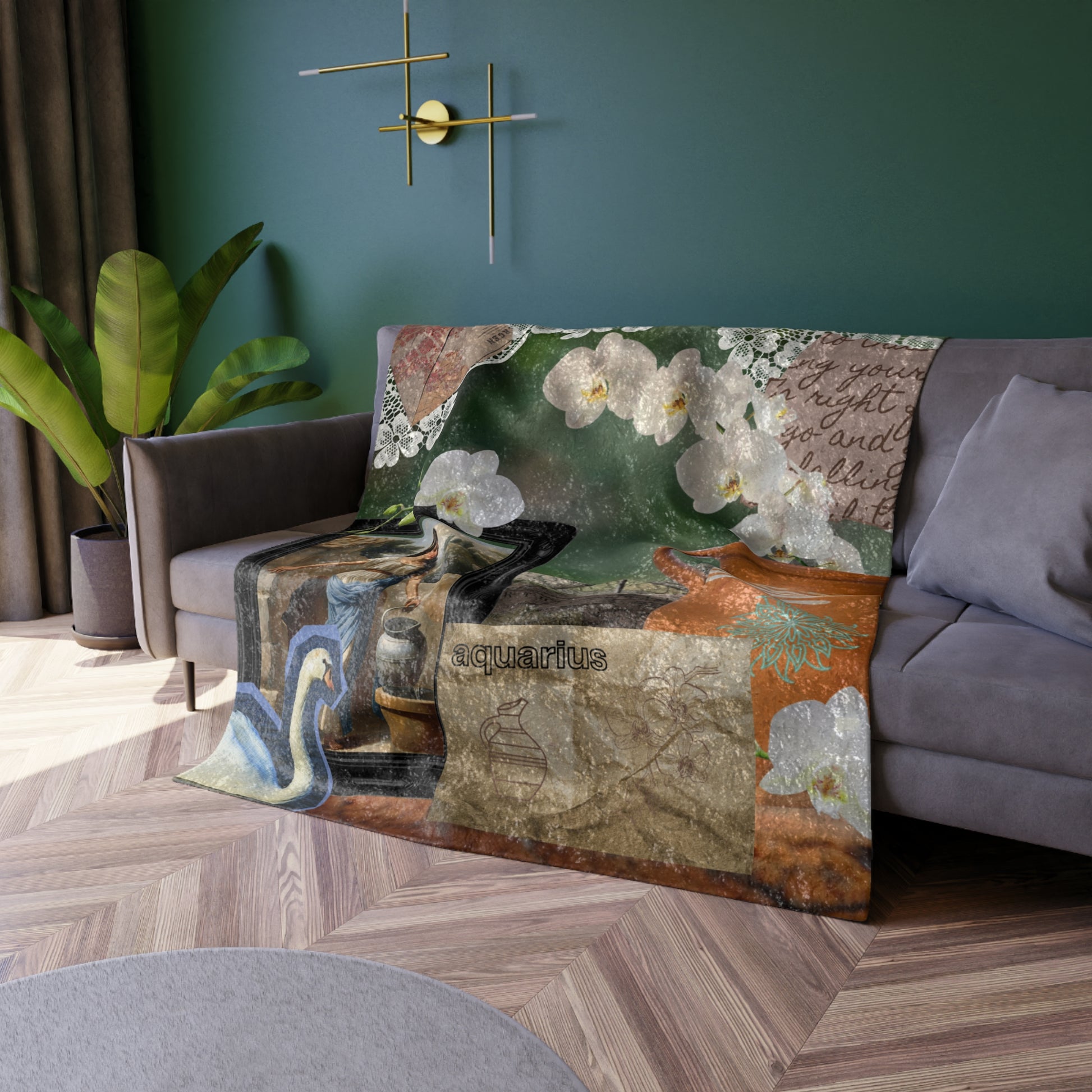 The velvet blanket showcases a mesmerizing illustration of an Aquarius woman, gracefully pouring water from a jug, symbolizing the water-bearer. Her serene expression and classic attire reflect the nurturing and humanitarian spirit of Aquarius. The background features a blend of rustic and botanical elements, including a beautifully illustrated orchid and intricate lace details, adding depth and charm to the design. The presence of a swan and a vintage pitcher further enhances the tranquil and harmonious vibe.