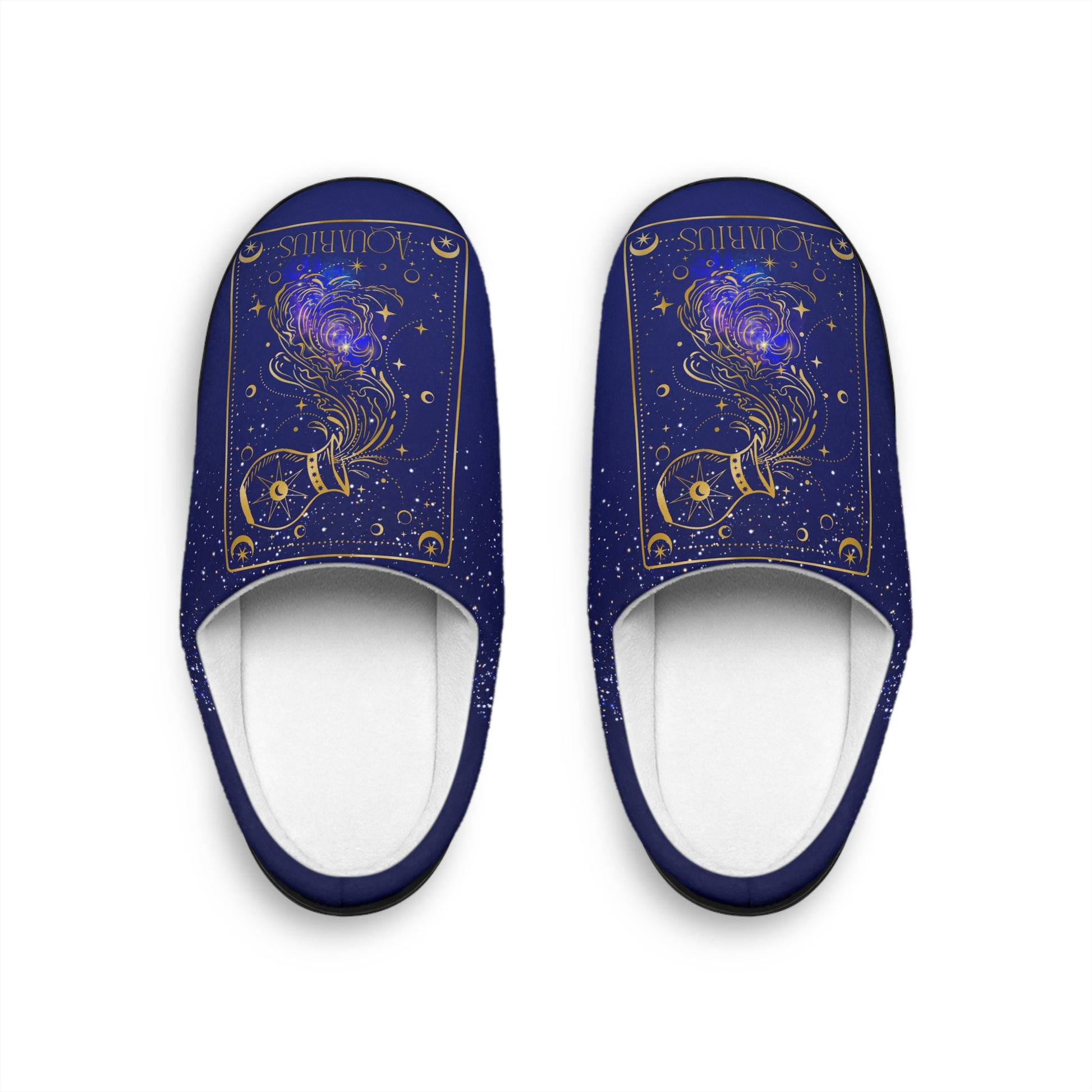 Step into the stars with our Aquarius Zodiac Indoor Slippers! Adorned with a beautifully detailed design of the Aquarius constellation, these cozy slippers are perfect for those born under this innovative and visionary sign. The intricate gold detailing on a deep, cosmic blue background captures the essence of Aquarius, the water bearer, pouring out cosmic wisdom and creativity.