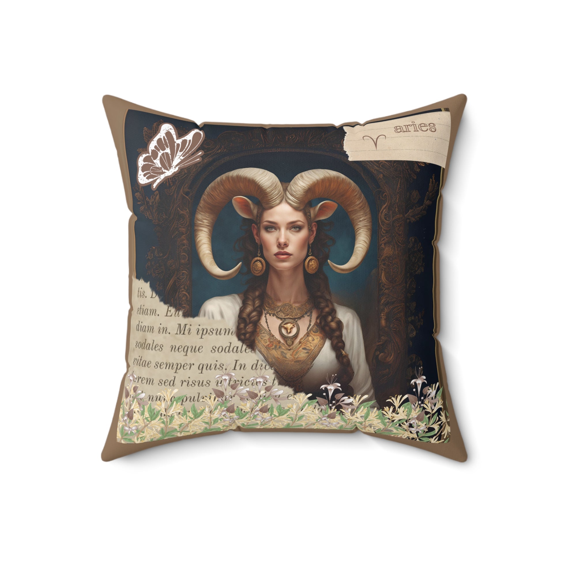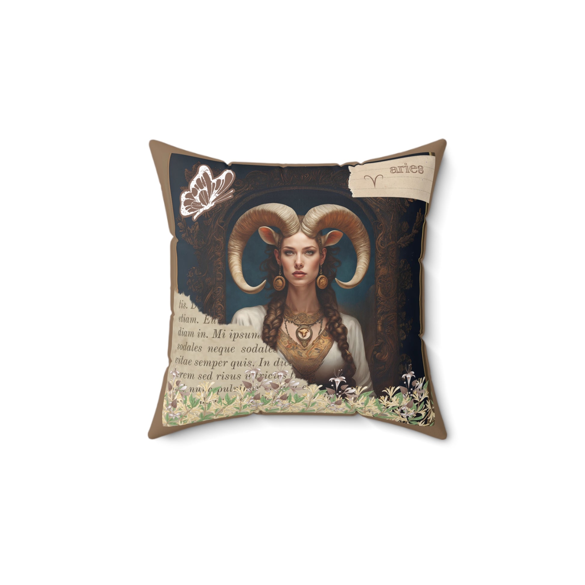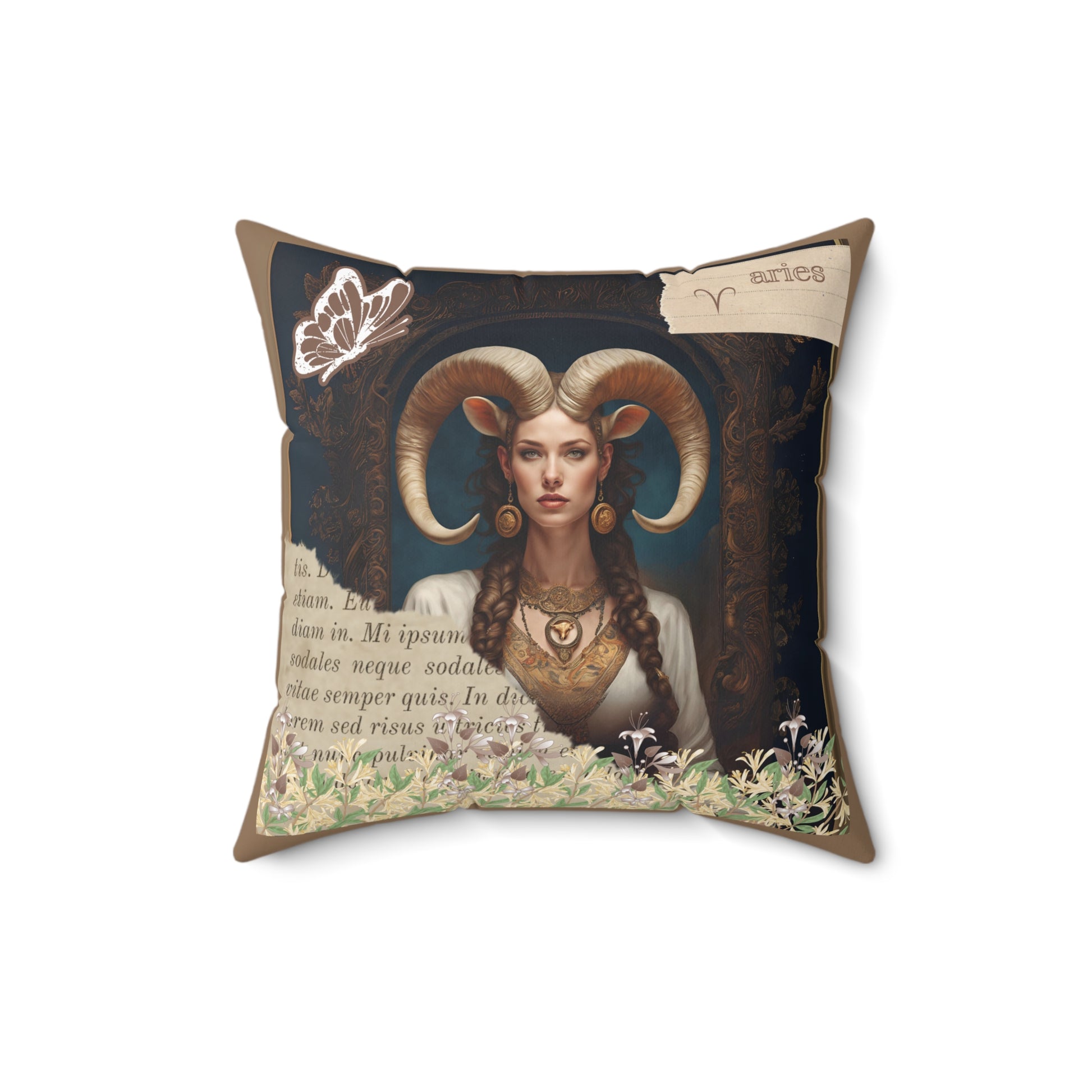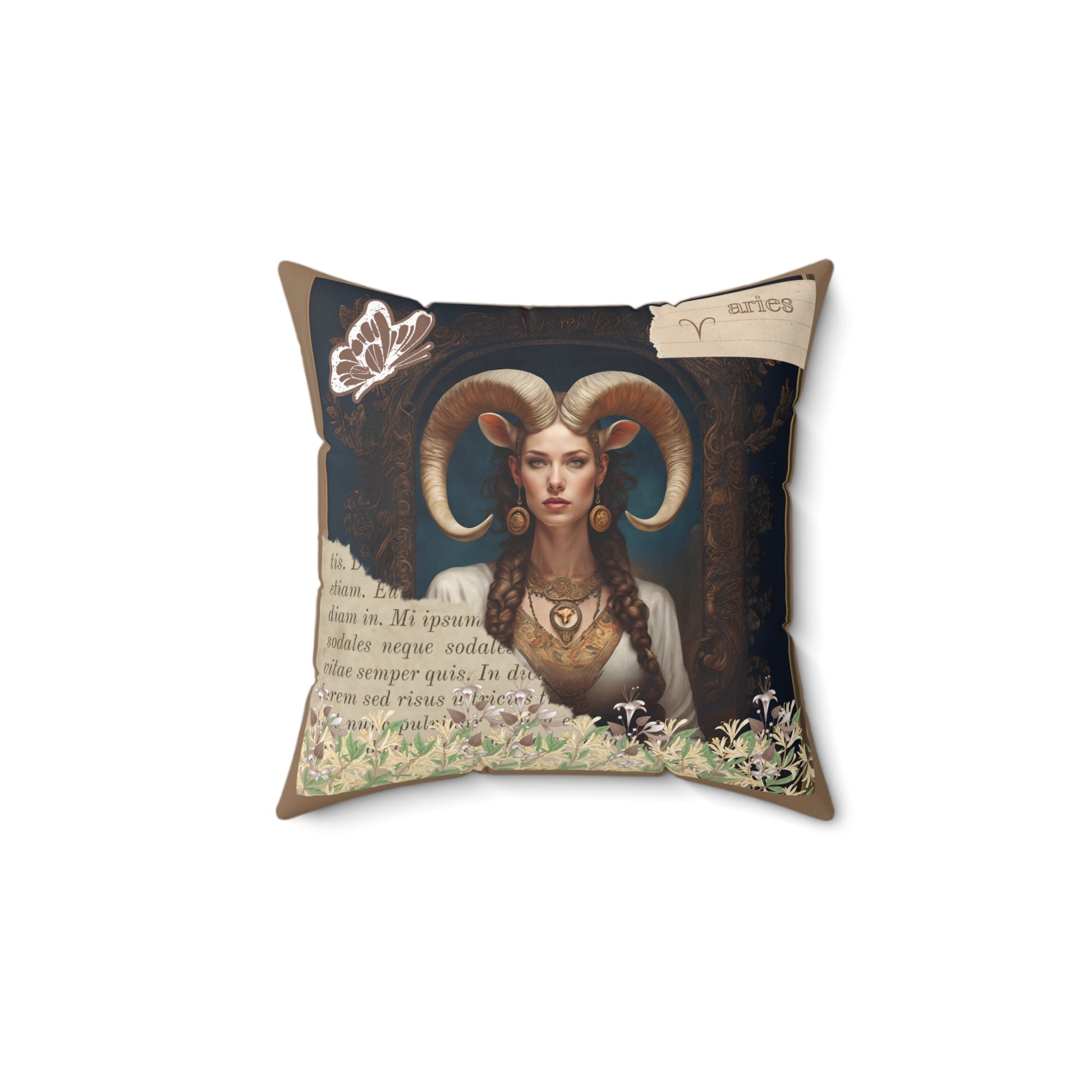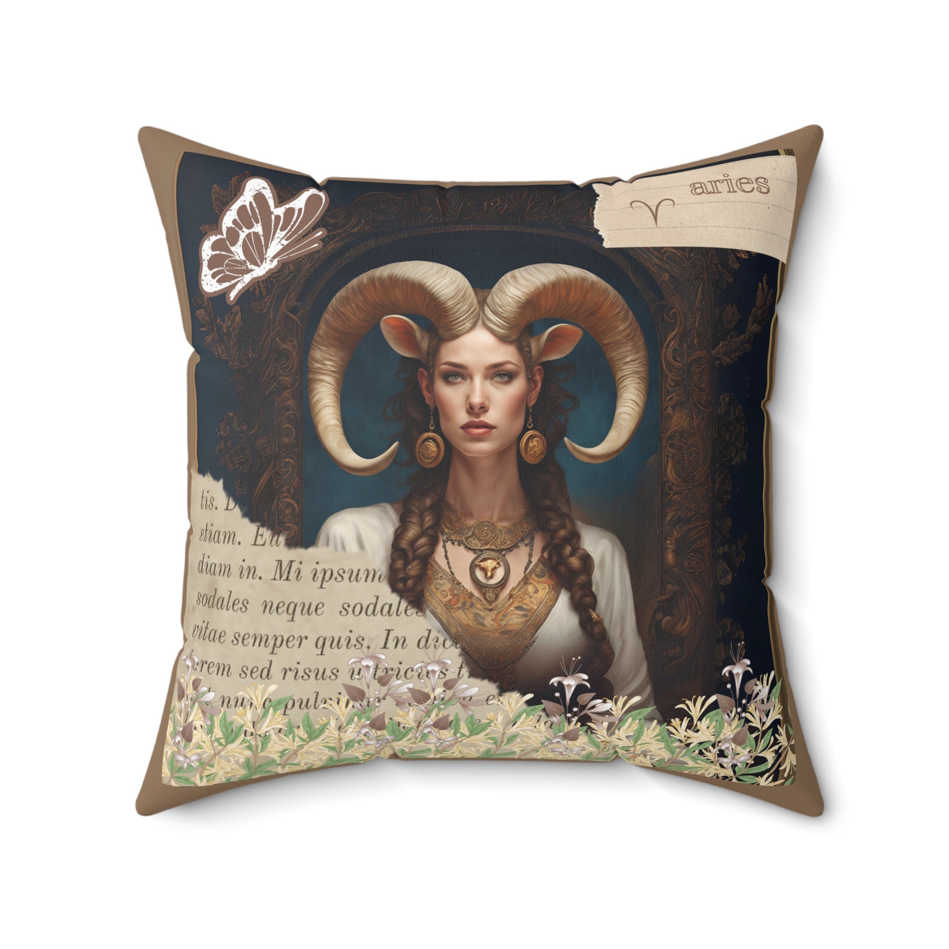 The faux suede pillow features a captivating image of a regal Aries woman, embodying strength and elegance. Her majestic horns add a touch of mythical allure, while her poised and confident demeanor reflects the bold and pioneering nature of Aries. Surrounding her at the base of the image is a lush gathering of honeysuckle, symbolizing rebirth and new beginnings—qualities that are inherently Aries..