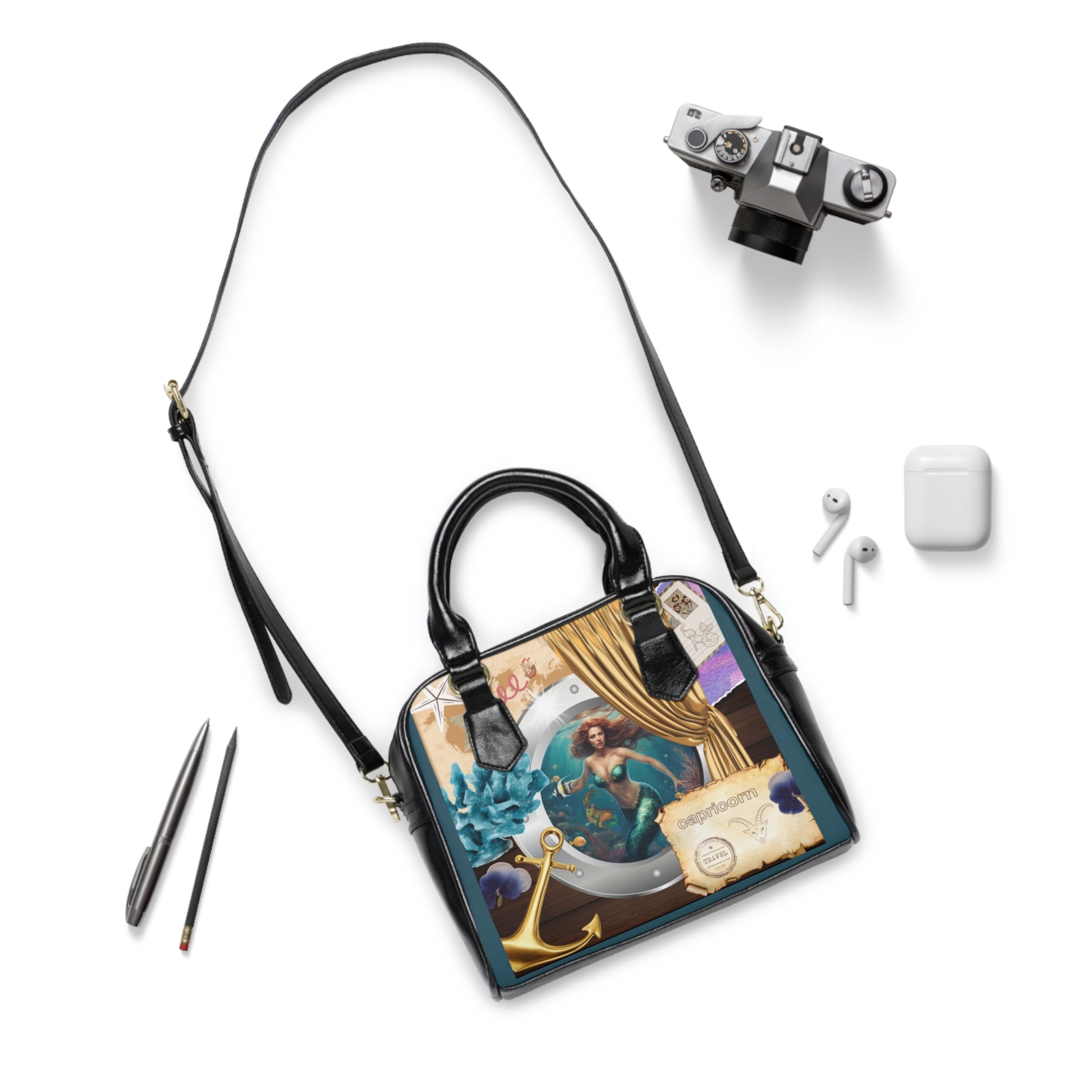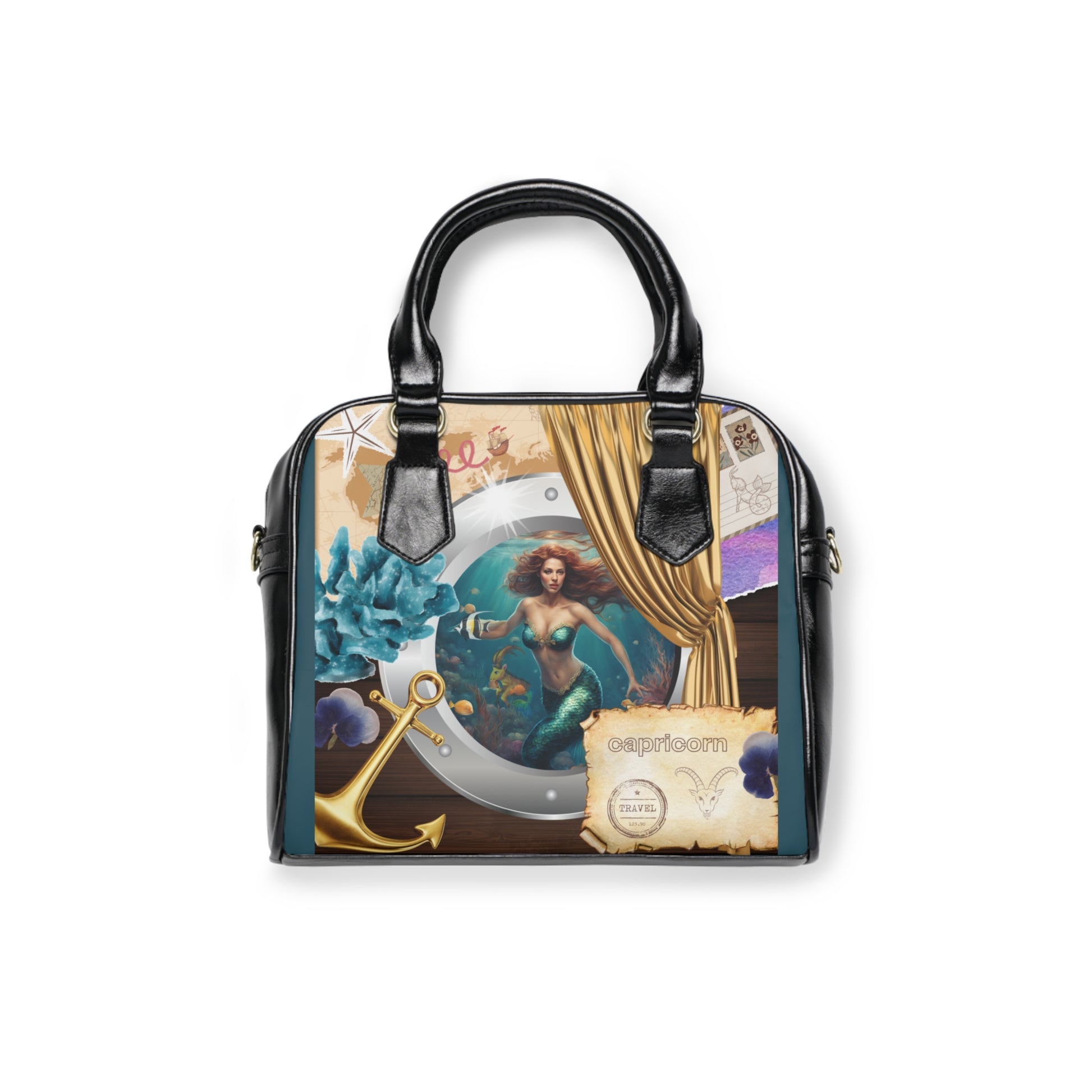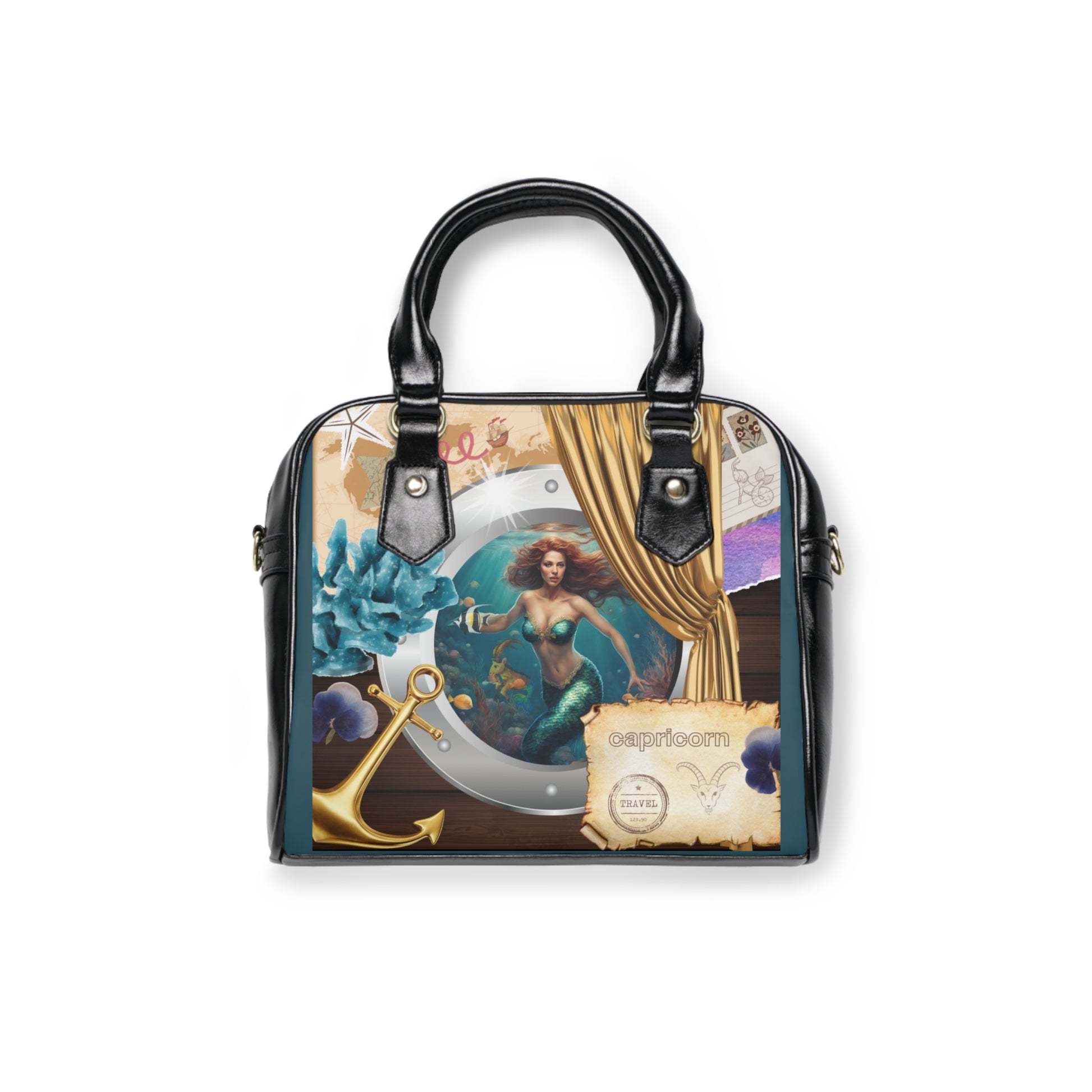 The handbag showcases a captivating illustration of a mermaid, symbolizing the Capricorn's mythological sea-goat. The mermaid is portrayed in a vibrant underwater scene, exuding confidence and grace as she swims among colorful marine life and coral reefs. The detailed background features a nautical theme with a ship, anchor, and starfish, enhancing the adventurous and resilient nature of Capricorn. The image is framed by a porthole, giving the design a unique and immersive look.