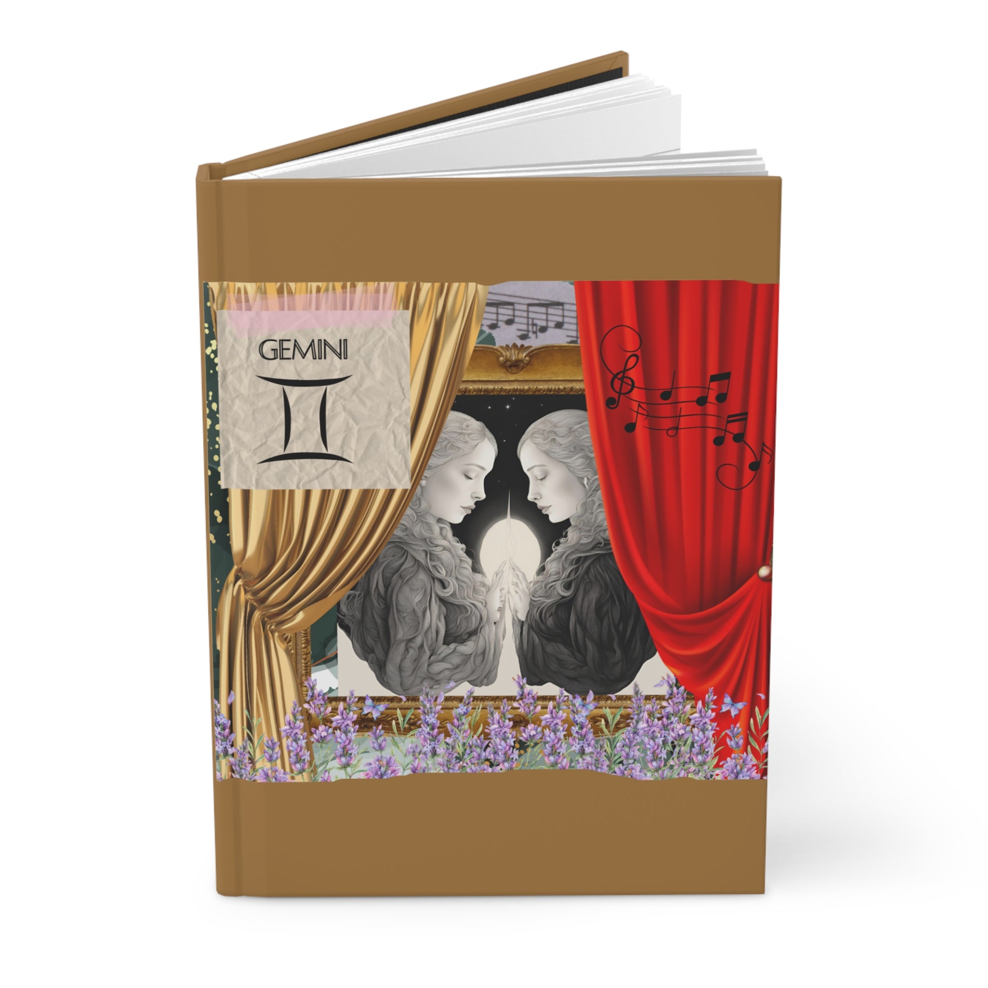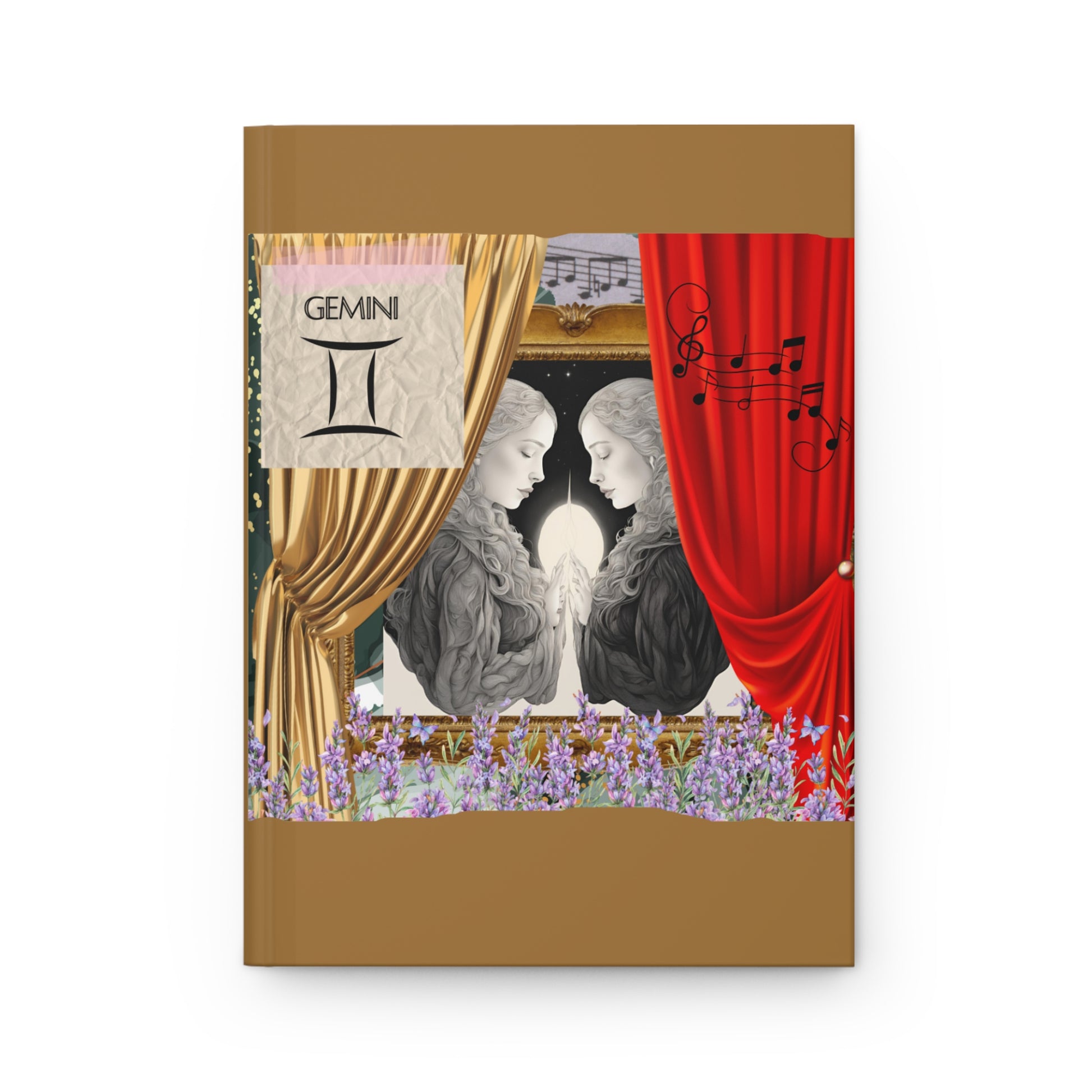 The journal showcases a mesmerizing illustration of the Gemini twins. Rendered in delicate black and white, the twins are depicted in a mirror-like image, holding a luminous orb that symbolizes their dual nature and intellectual curiosity. The intricate details and ethereal quality of the artwork are framed by luxurious golden drapes, adding a touch of opulence. Above the twins, the word "GEMINI" is elegantly displayed along with the distinctive Gemini symbol, emphasizing the zodiac theme.