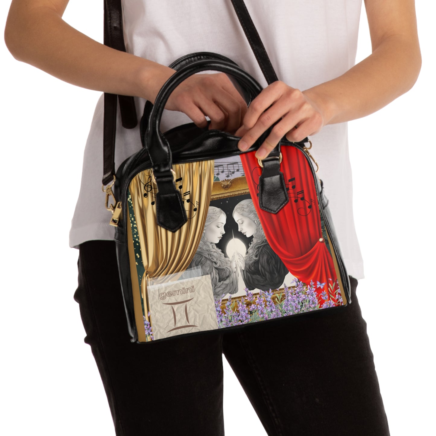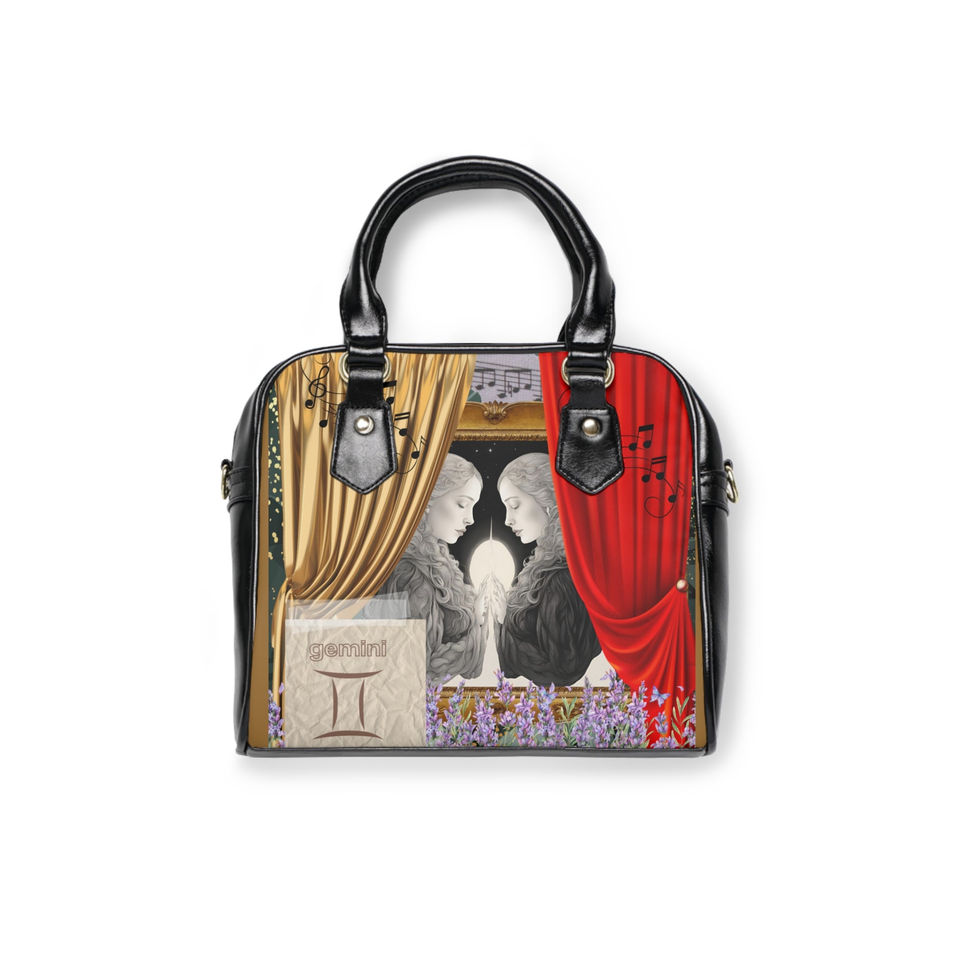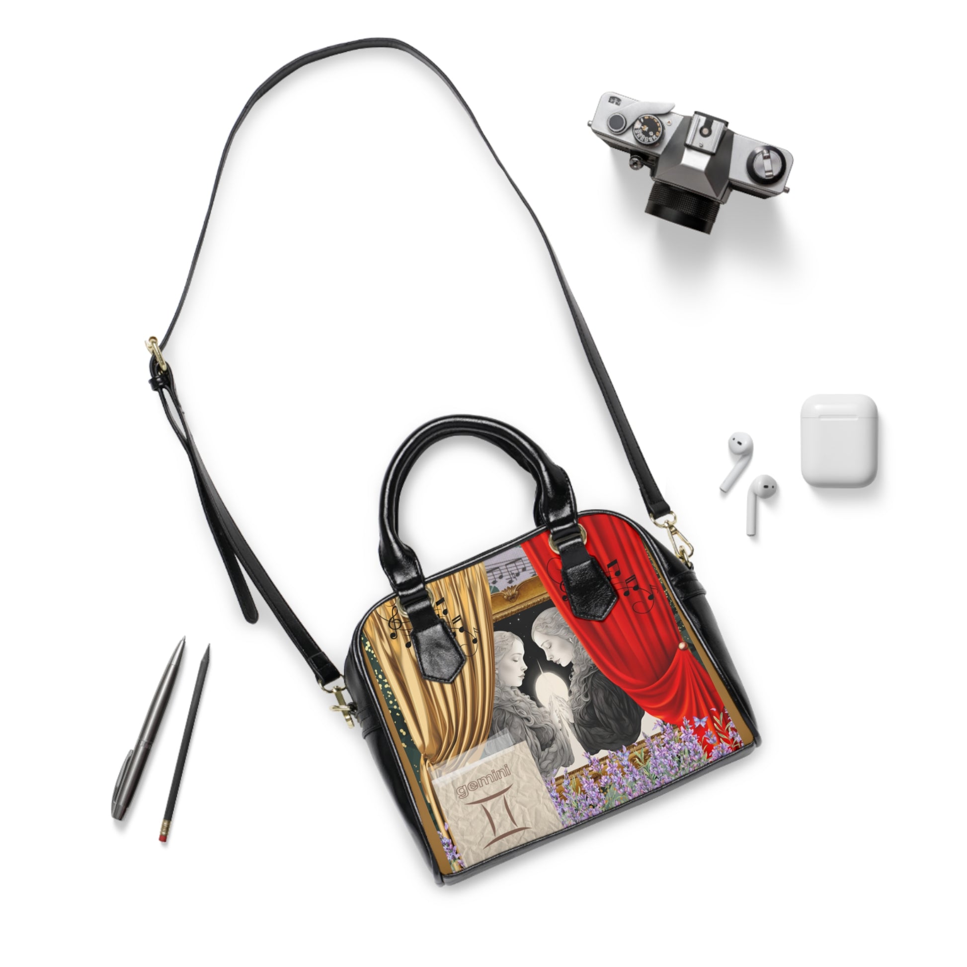 The handbag showcases a mesmerizing illustration of the Gemini twins. Rendered in delicate black and white, the twins are depicted in a mirror-like image, holding a luminous orb that symbolizes their dual nature and intellectual curiosity. The intricate details and ethereal quality of the artwork are framed by luxurious golden drapes, adding a touch of opulence. Above the twins, the word "GEMINI" is elegantly displayed along with the distinctive Gemini symbol, emphasizing the zodiac theme.