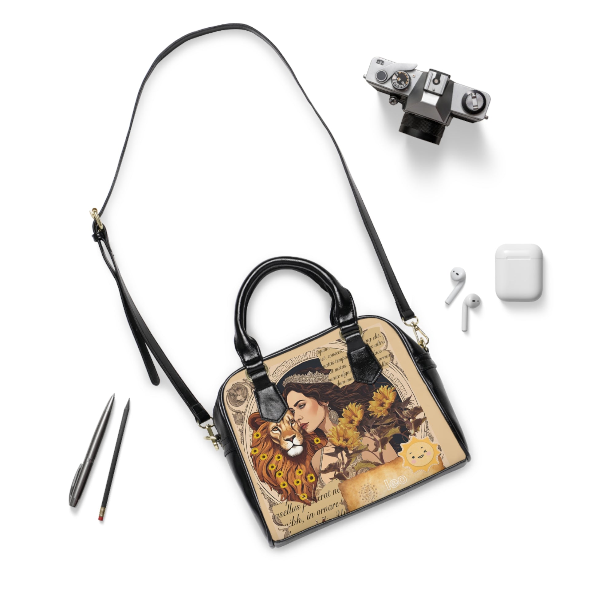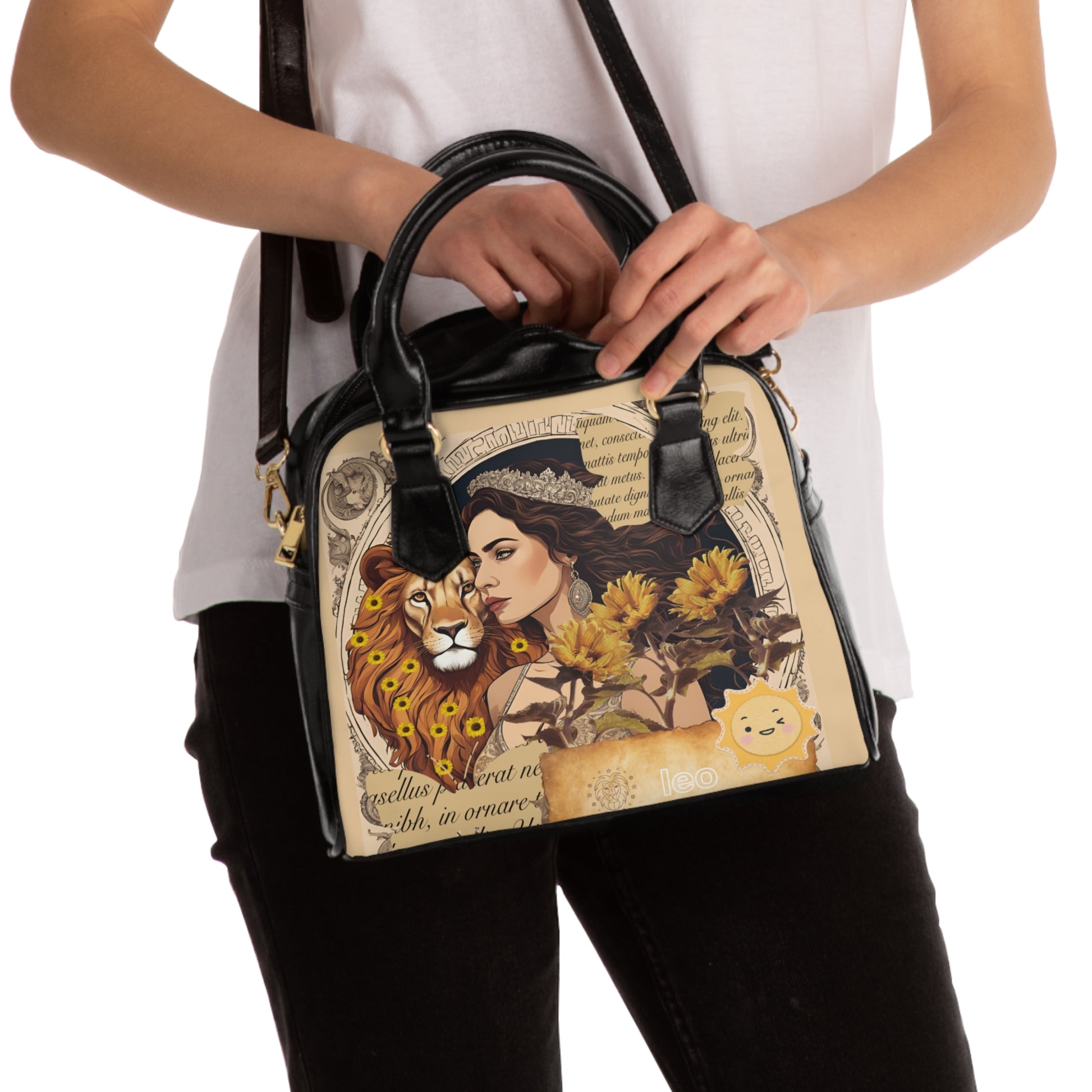 The handbag presents a regal young woman, embodying the essence of Leo with her poised and commanding presence. She stands confidently beside a magnificent lion, whose mane is beautifully adorned with sunflowers, symbolizing Leo's association with the sun and vitality. The lion's protective stance behind her underscores Leo's natural leadership and bravery. Sunflowers are thoughtfully scattered throughout the image, enhancing the vibrant and powerful aesthetic.