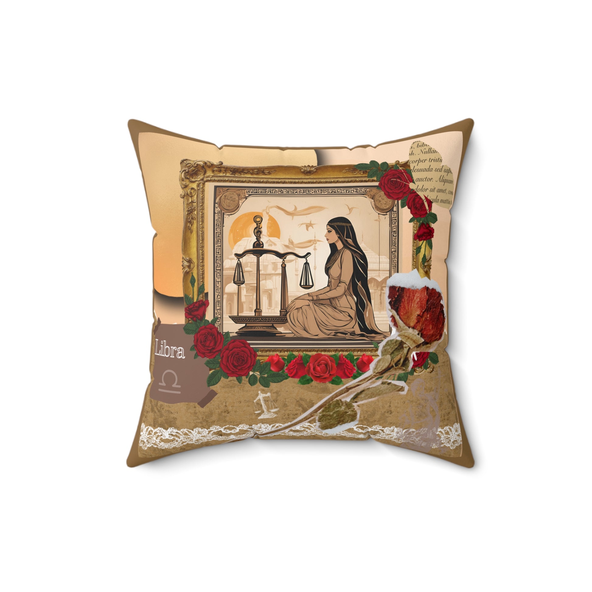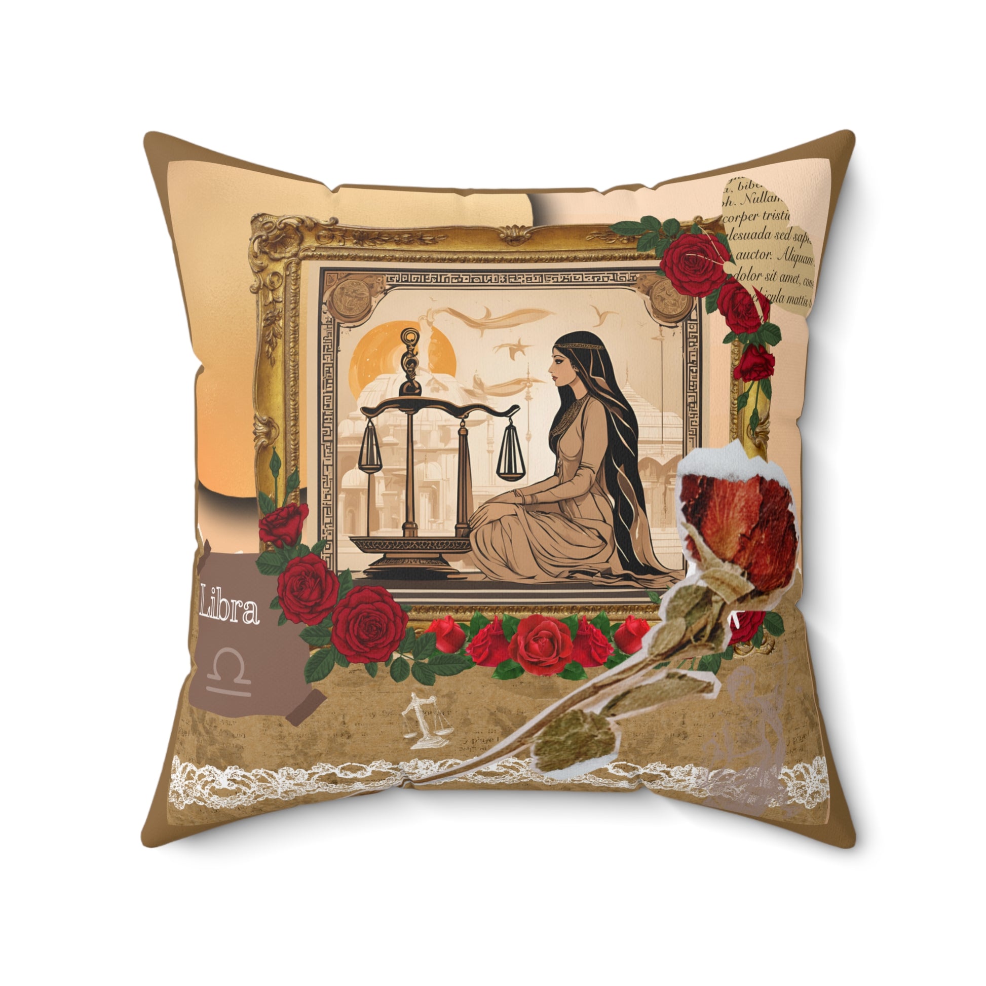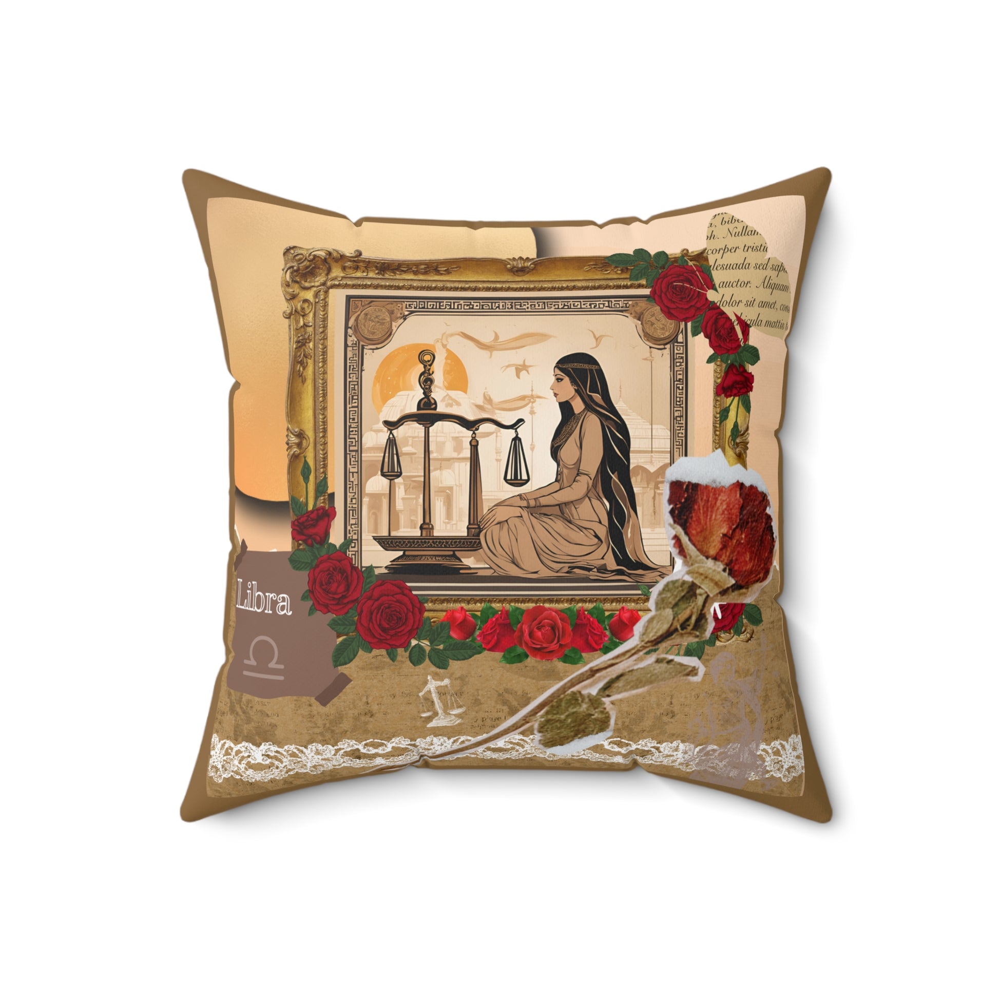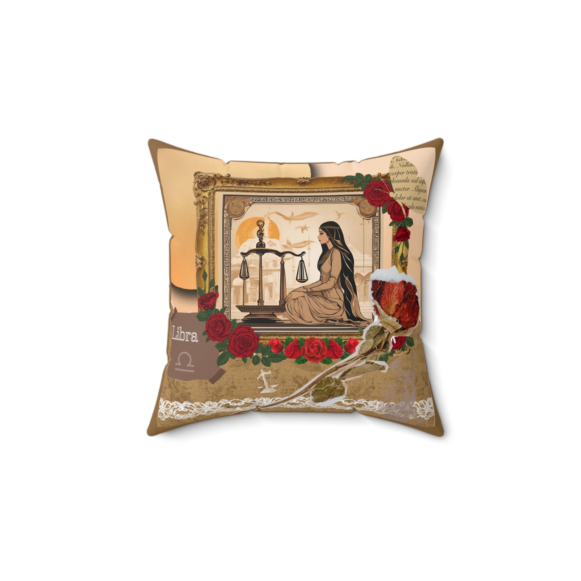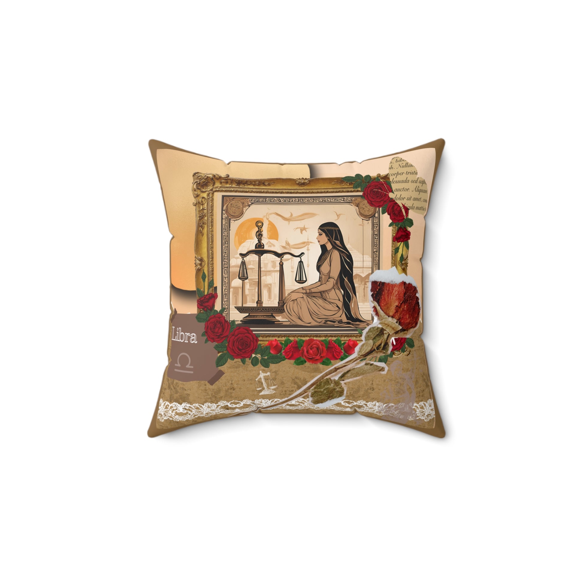 The faux suede pillow features a graceful woman standing before a pair of balanced scales, embodying the Libra sign's core value of harmony and justice. She is surrounded by delicate roses, which symbolize beauty, love, and refinement—all traits associated with Libra.