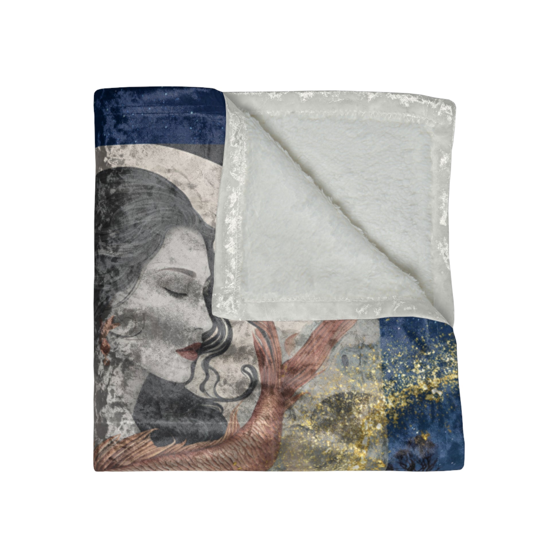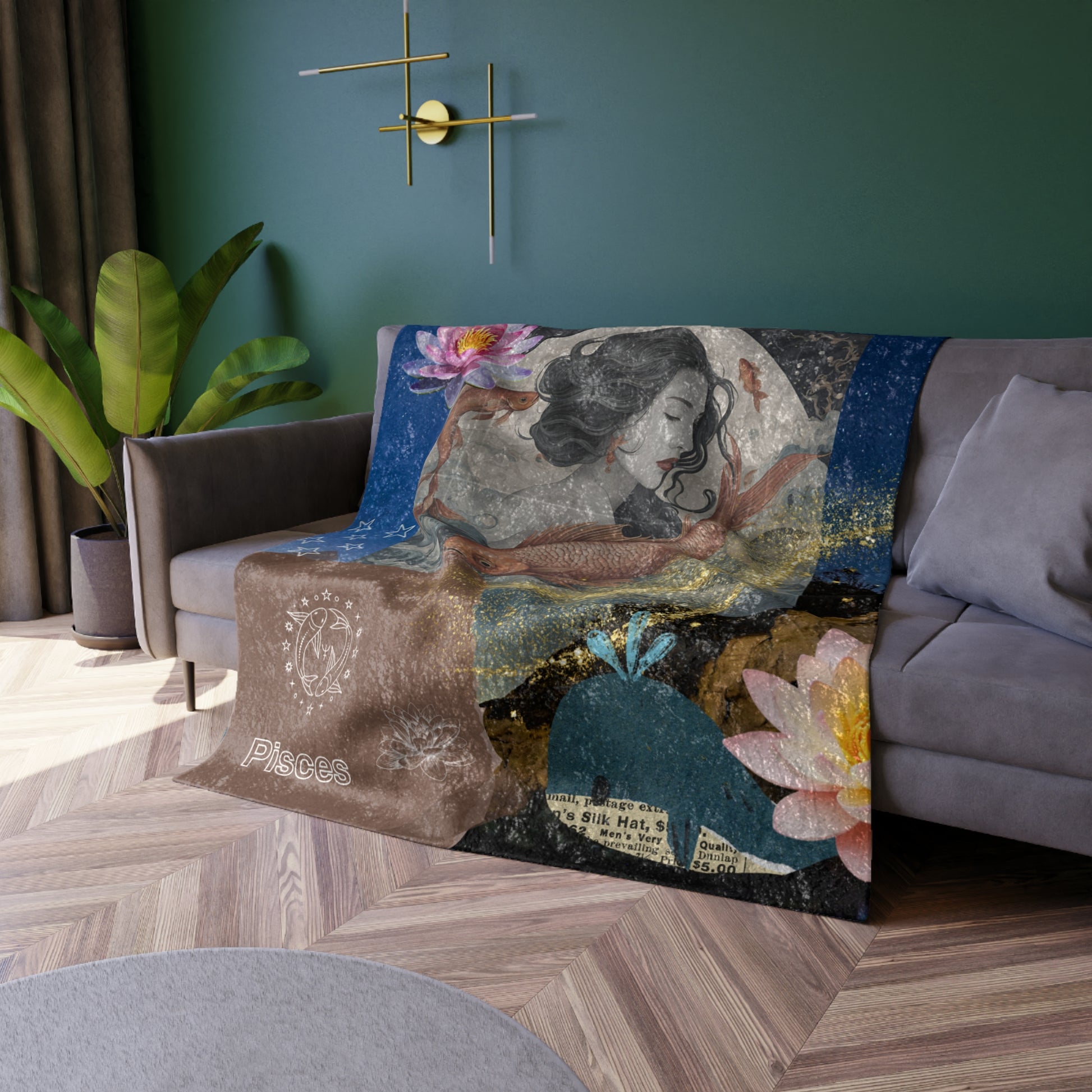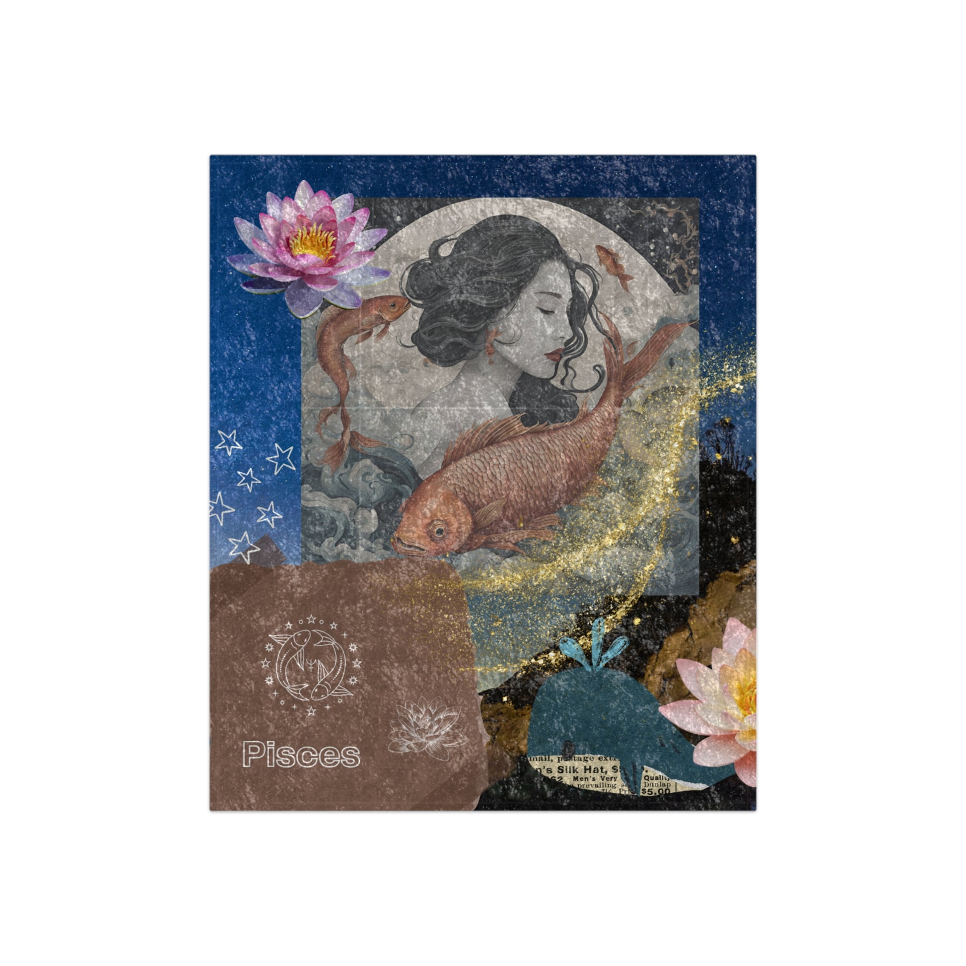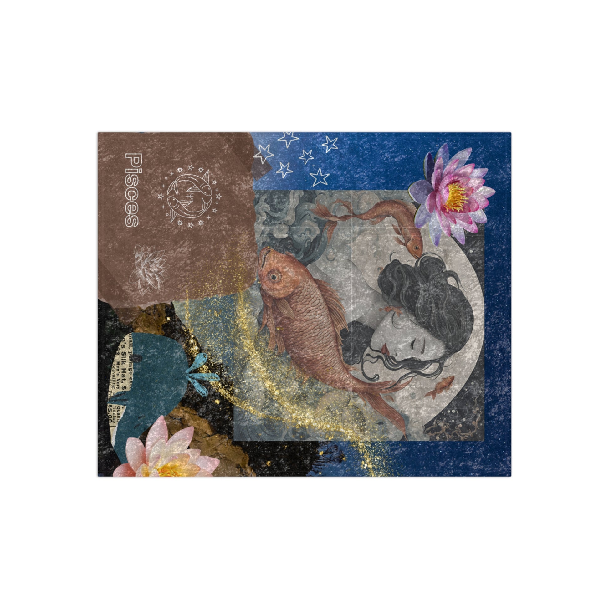 The velvet blanket showcases a serene and enchanting illustration of a Pisces woman. Her tranquil expression and flowing hair, intertwined with the imagery of two vibrant fish, capture the fluid and intuitive nature of Pisces. The background features soft waves and celestial elements, creating a dreamy underwater scene. Delicate accents of lotus flowers and stars add to the ethereal quality of the design.