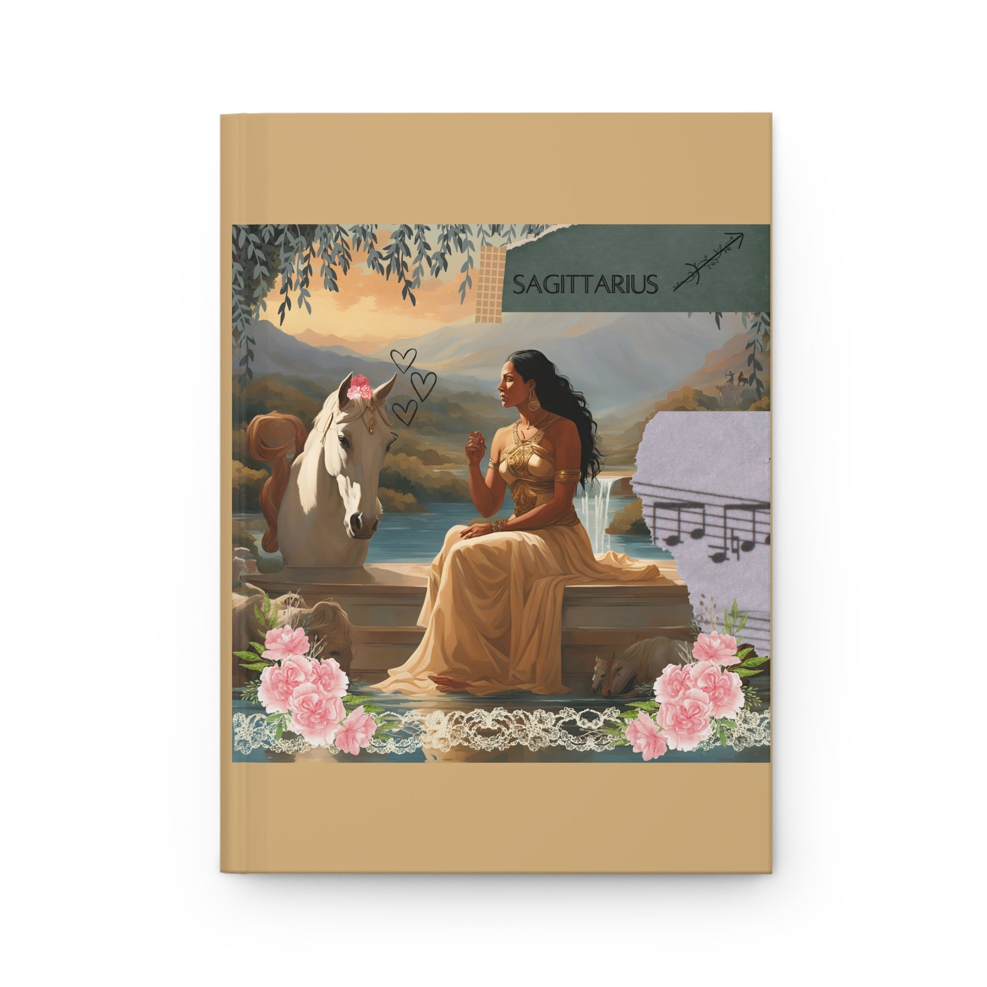 The journal features a stunning illustration of a majestic woman in a golden gown, representing the Sagittarius sign. She is seated beside a serene white horse adorned with a floral crown, set against a breathtaking backdrop of mountains and waterfalls. The scene exudes a sense of freedom, exploration, and harmony with nature, embodying the adventurous and optimistic spirit of Sagittarius. Delicate floral embellishments and musical notes add a touch of romanticism and creativity, further highlighting the sign’s love for beauty and expression.