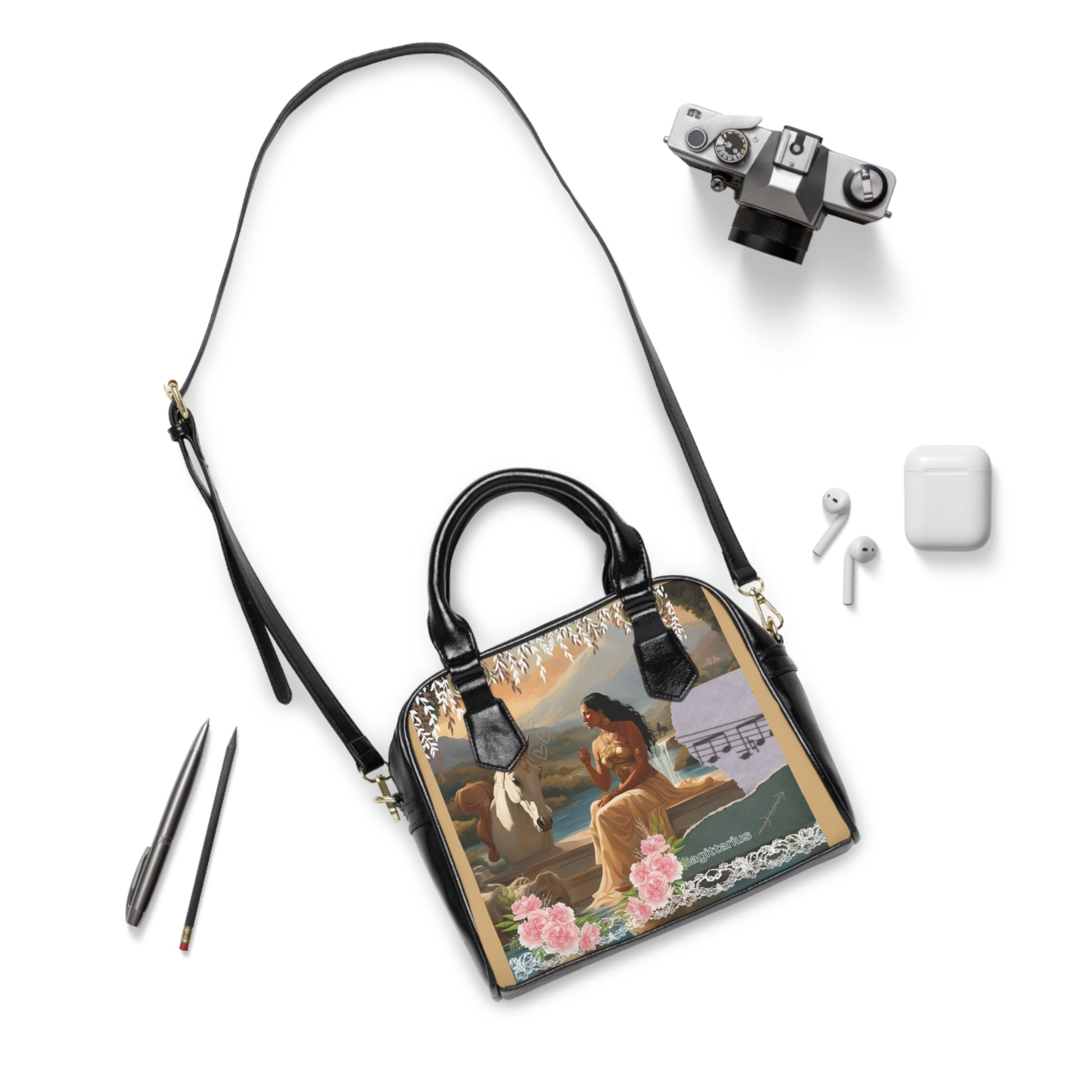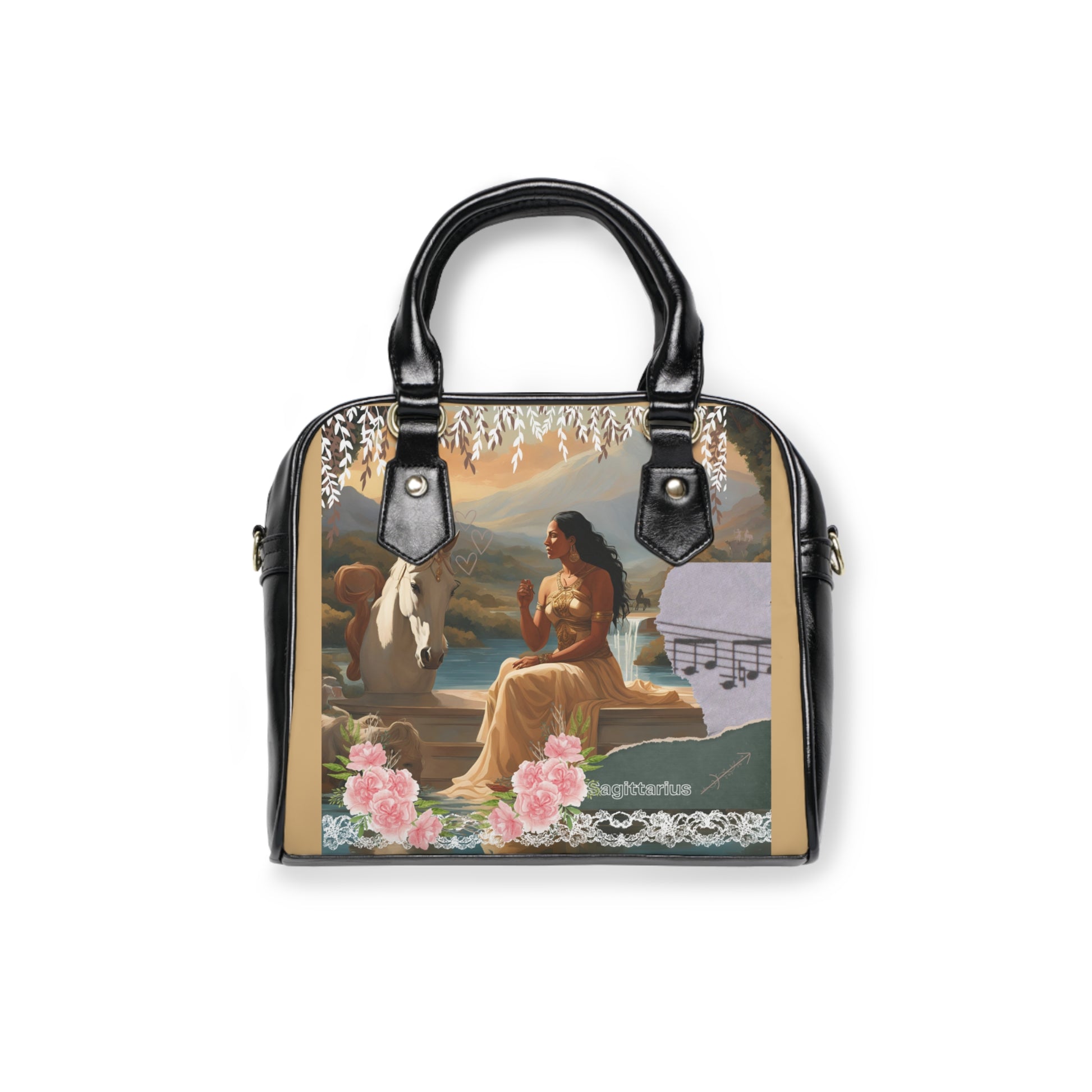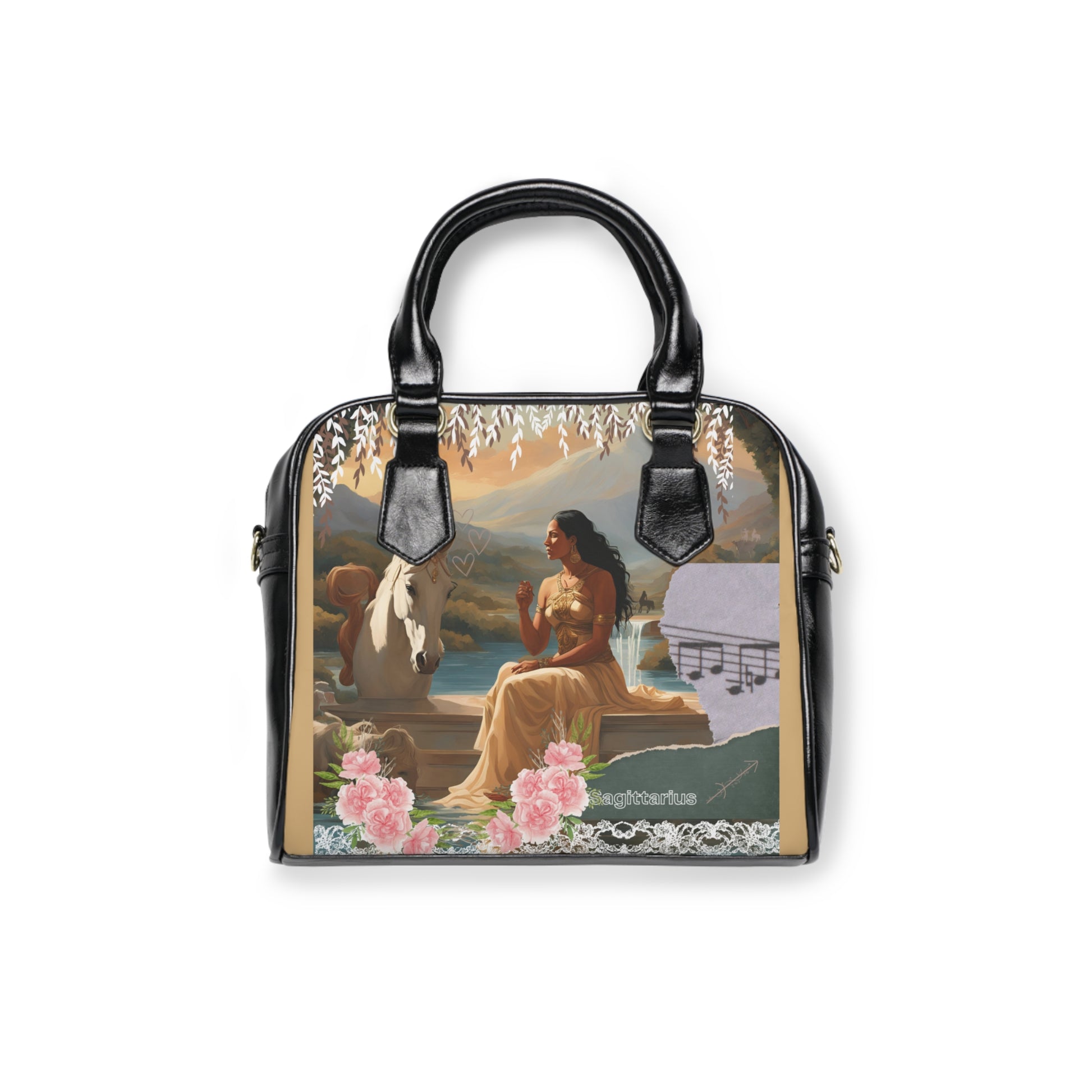 The handbag features a stunning illustration of a majestic woman in a golden gown, representing the Sagittarius sign. She is seated beside a serene white horse adorned with a floral crown, set against a breathtaking backdrop of mountains and waterfalls. The scene exudes a sense of freedom, exploration, and harmony with nature, embodying the adventurous and optimistic spirit of Sagittarius. Delicate floral embellishments and musical notes add a touch of romanticism and creativity, further highlighting the sign’s love for beauty and expression.