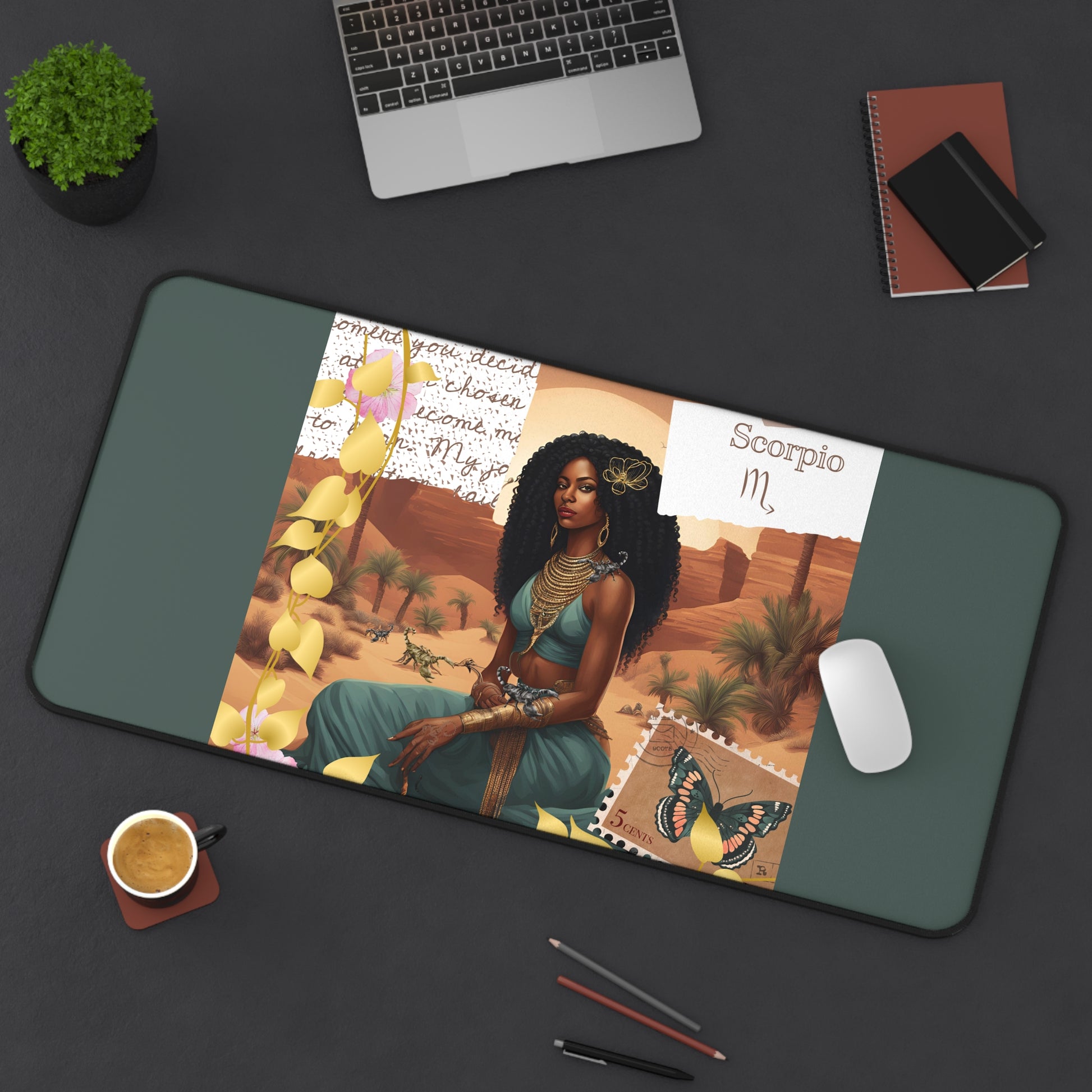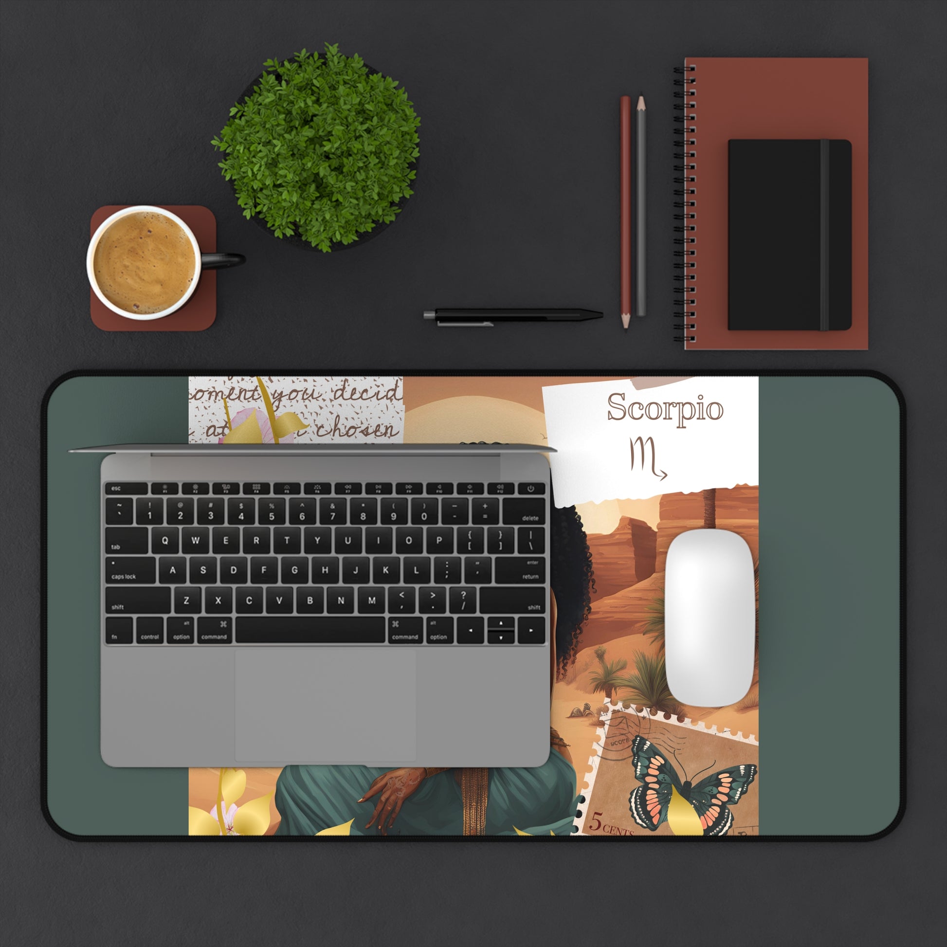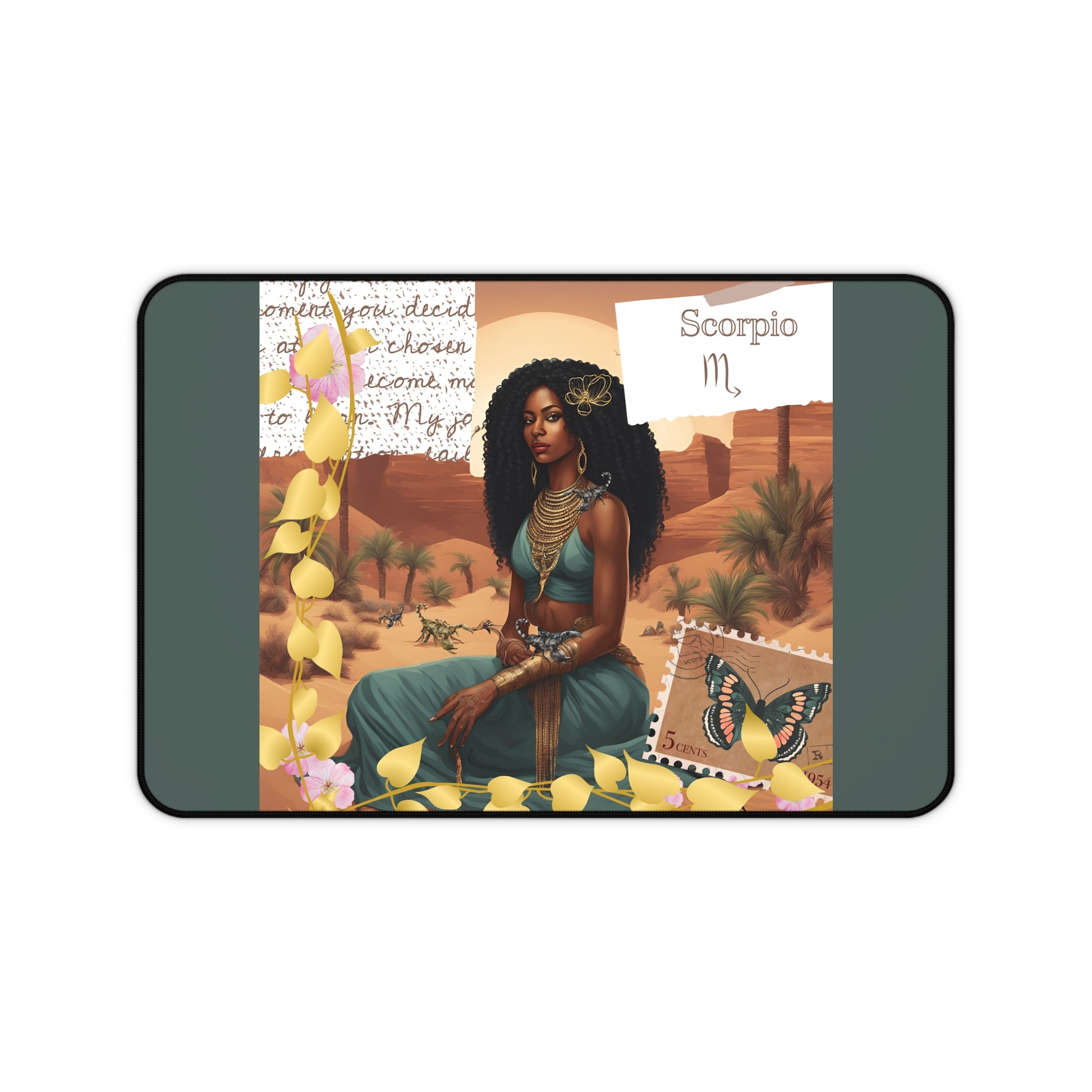 The desk mat showcases a stunning illustration of a regal woman dressed in rich, deep hues, representing the Scorpio sign. She sits confidently in a desert oasis, exuding strength and mystery. Intricate scorpions adorn her arms, symbolizing the transformative and powerful nature of Scorpio. The background features a vivid sunset, palm trees, and desert flora, creating a scene that is both exotic and enchanting. Delicate golden leaves and a vintage butterfly stamp add an extra layer of depth and elegance to the design.