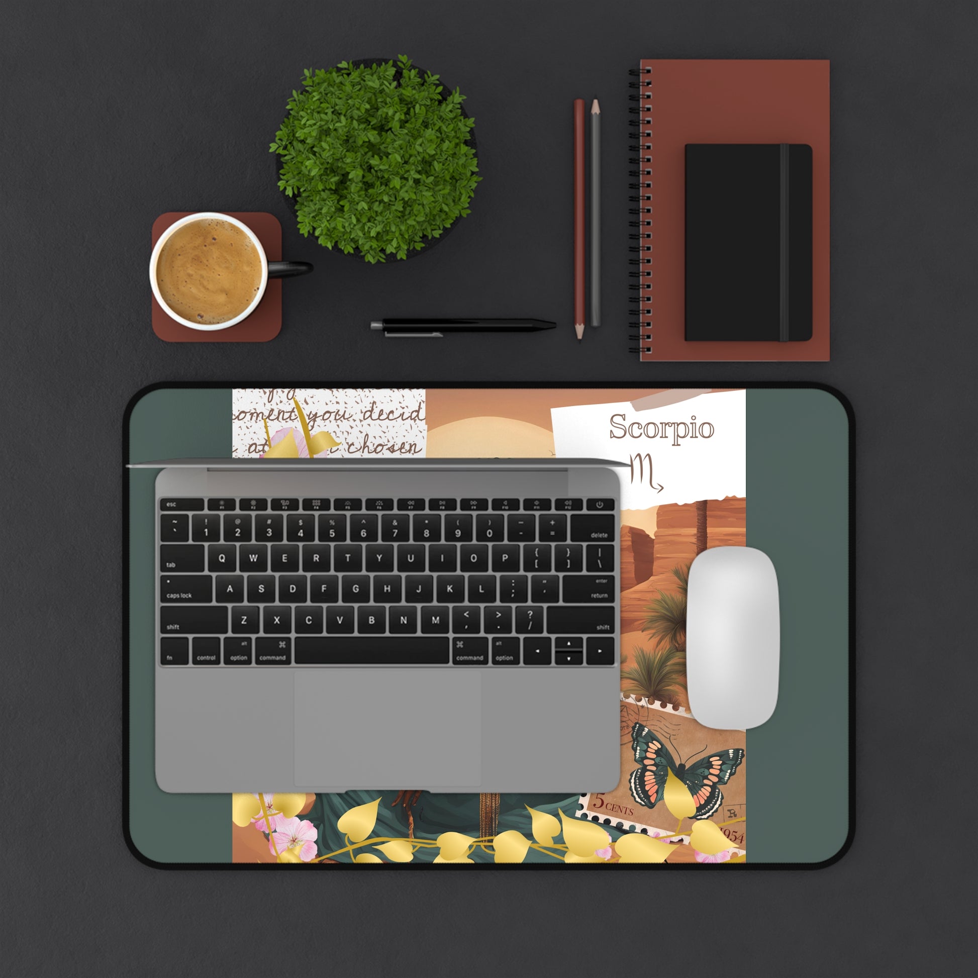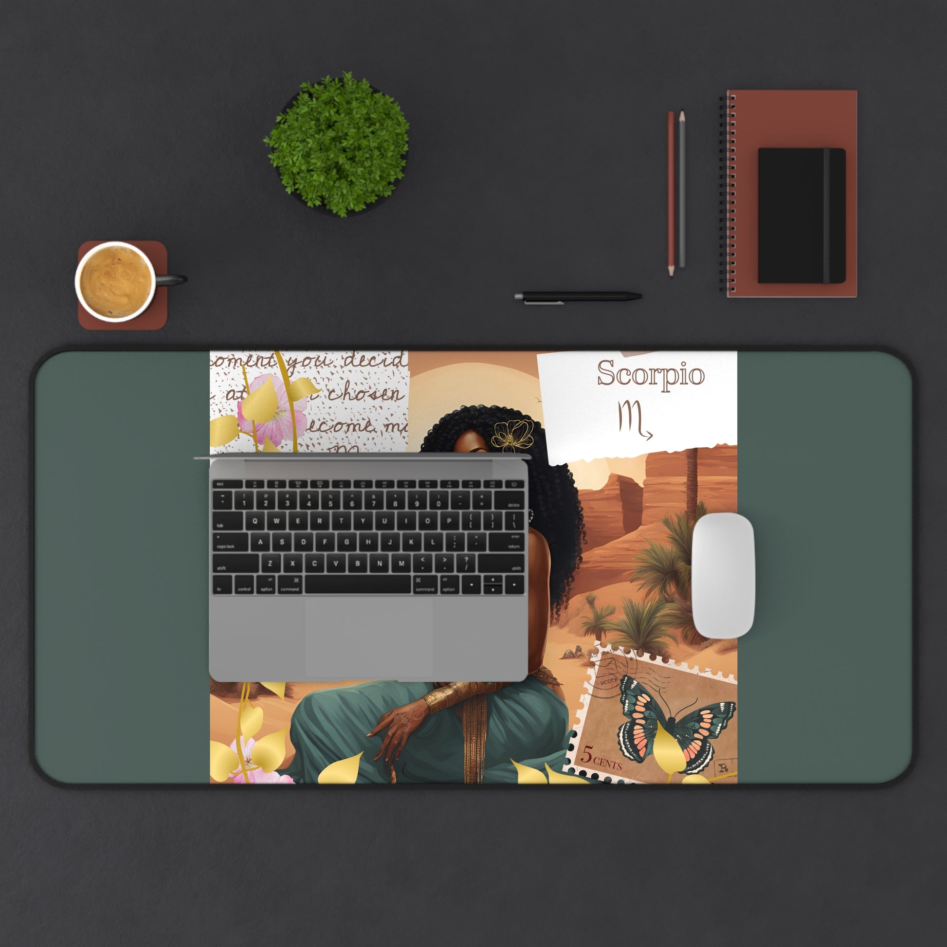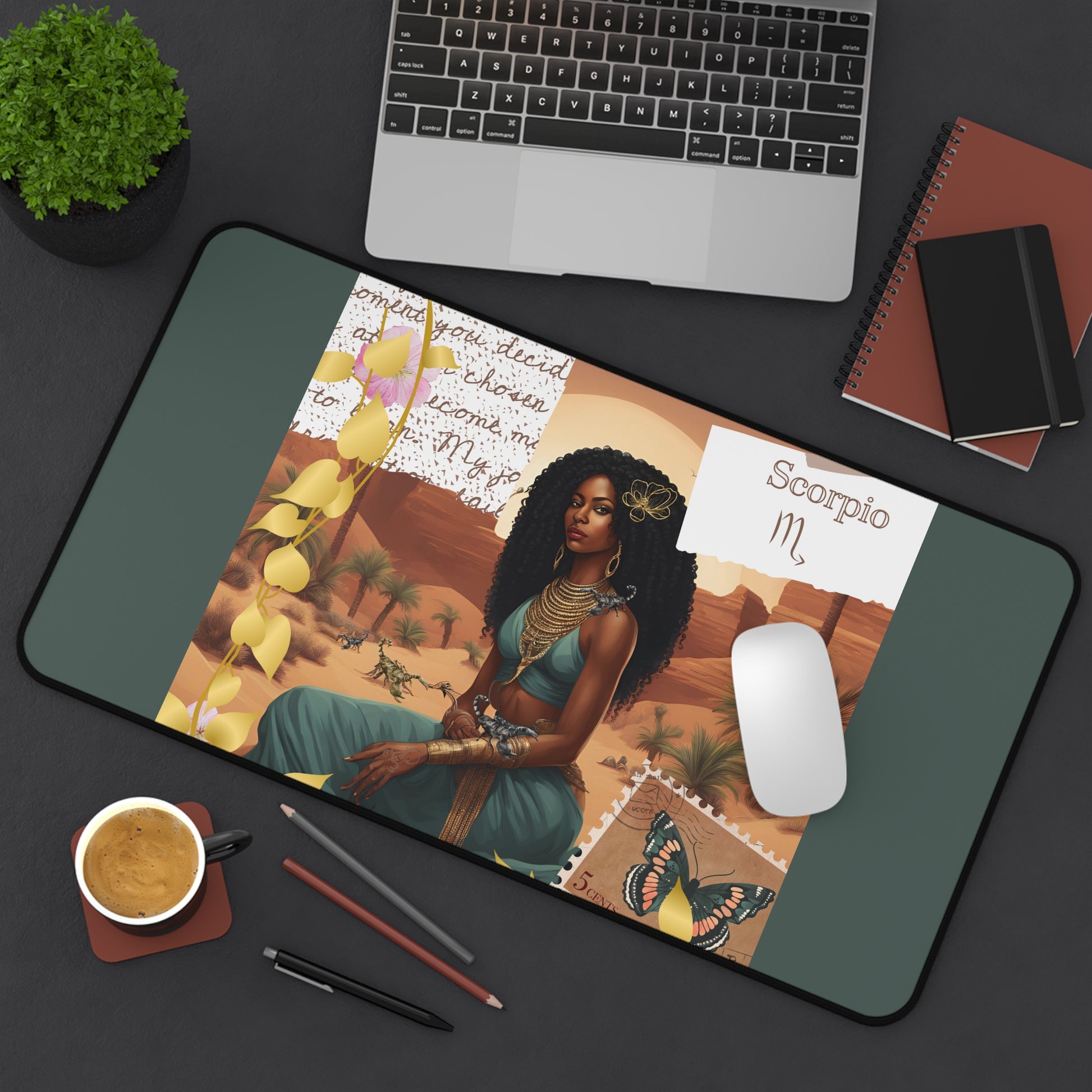 The desk mat showcases a stunning illustration of a regal woman dressed in rich, deep hues, representing the Scorpio sign. She sits confidently in a desert oasis, exuding strength and mystery. Intricate scorpions adorn her arms, symbolizing the transformative and powerful nature of Scorpio. The background features a vivid sunset, palm trees, and desert flora, creating a scene that is both exotic and enchanting. Delicate golden leaves and a vintage butterfly stamp add an extra layer of depth and elegance to the design.