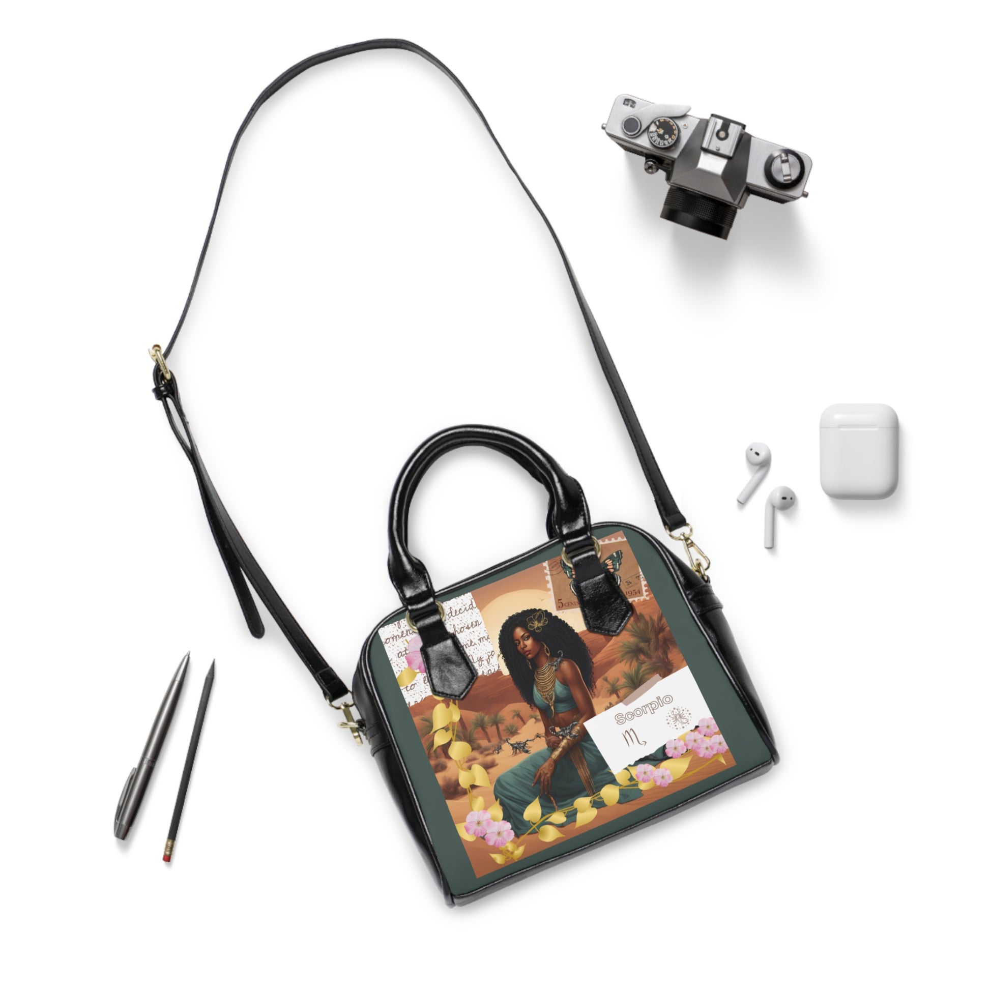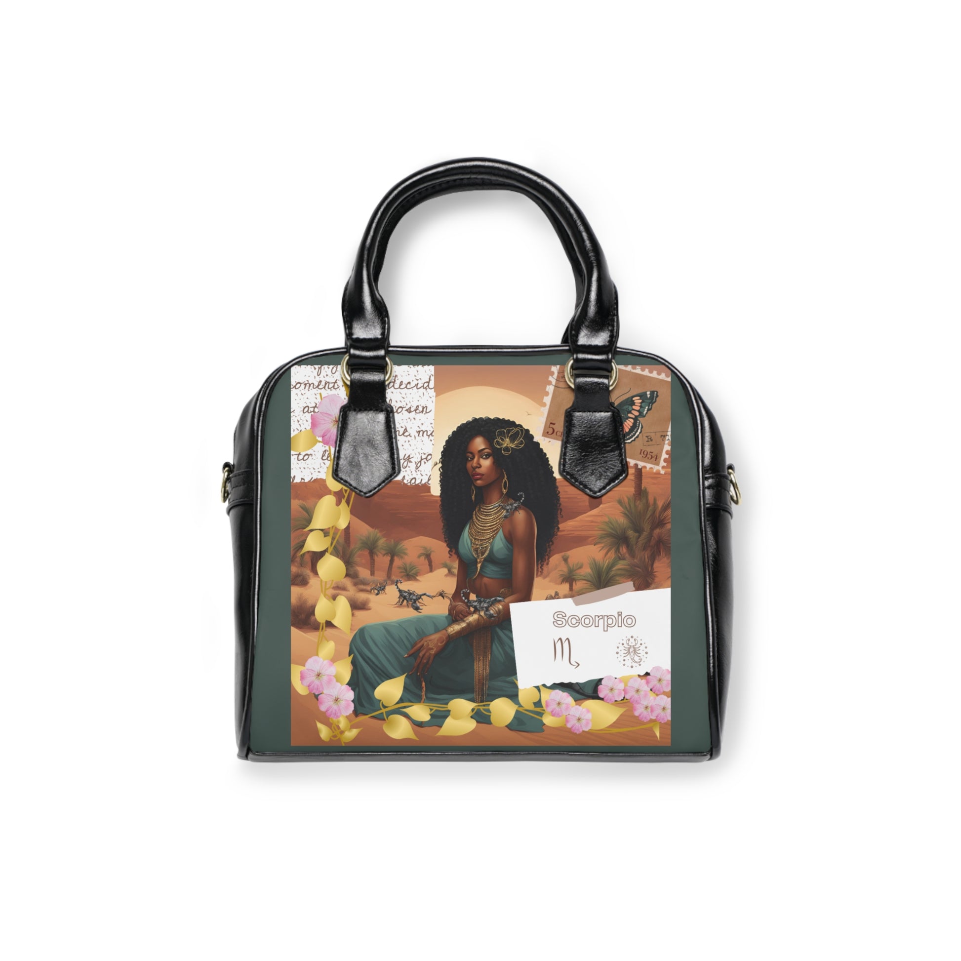 The handbag showcases a stunning illustration of a regal woman dressed in rich, deep hues, representing the Scorpio sign. She sits confidently in a desert oasis, exuding strength and mystery. Intricate scorpions adorn her arms, symbolizing the transformative and powerful nature of Scorpio. The background features a vivid sunset, palm trees, and desert flora, creating a scene that is both exotic and enchanting. Delicate golden leaves and a vintage butterfly stamp add an extra layer of depth and elegance to the design.