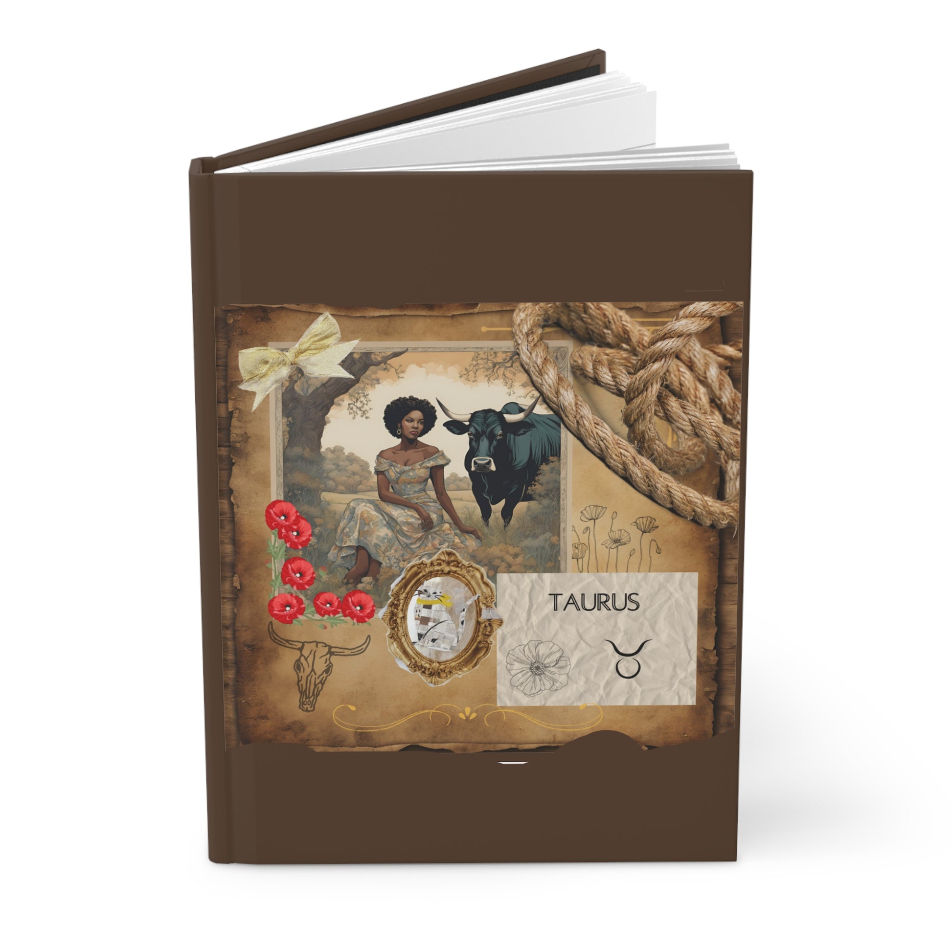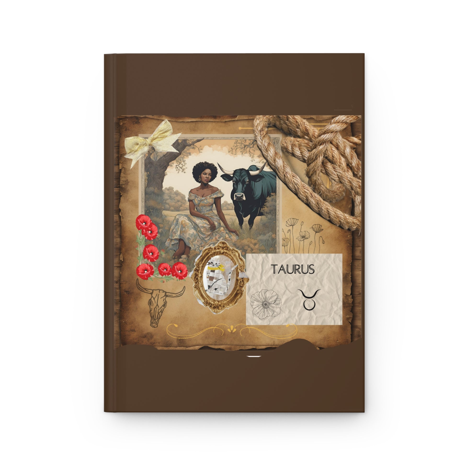 The journal showcases a stunning illustration of a Taurus woman seated in a serene, pastoral setting. The earthy tones and intricate details of the artwork bring out the grounded and resilient nature of Taurus. The woman, dressed in a floral gown, exudes calm and grace, with a powerful bull standing by her side, symbolizing strength and determination. The image is framed with vintage elements, including a golden bow and rustic floral accents, enhancing the overall aesthetic.