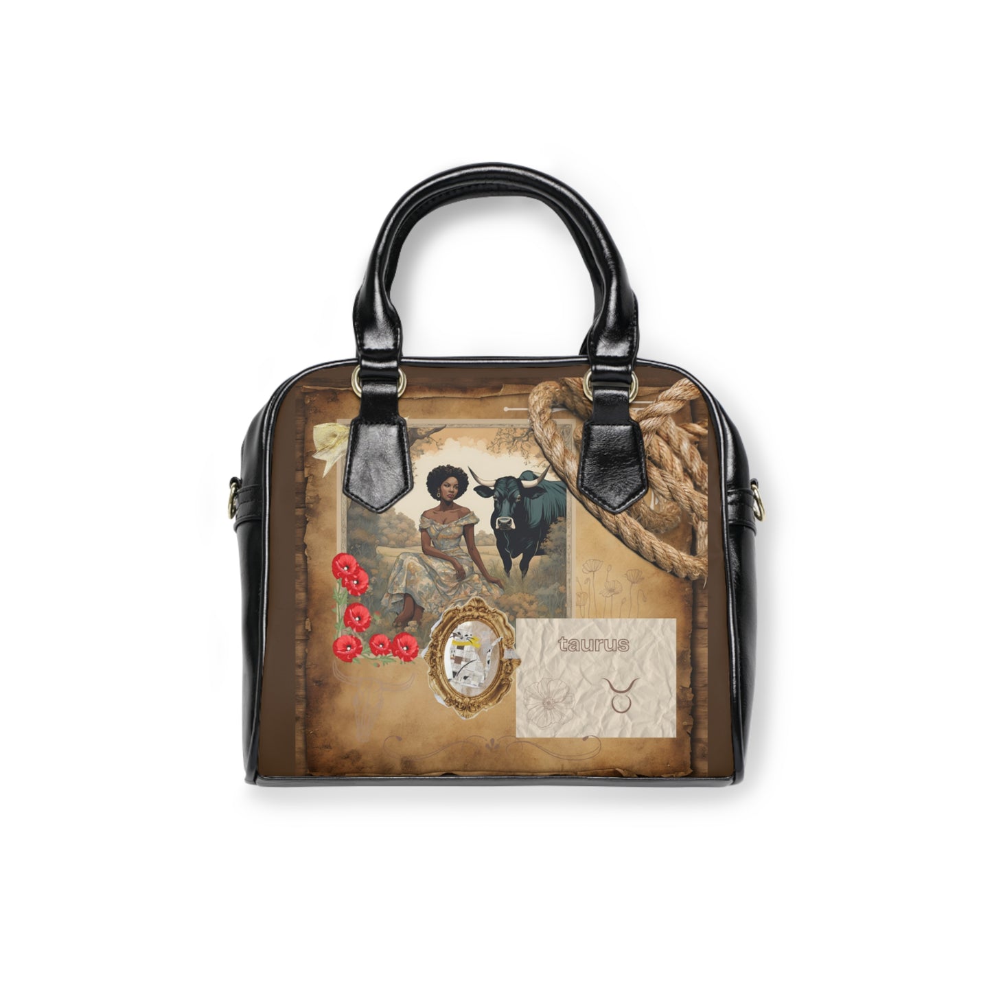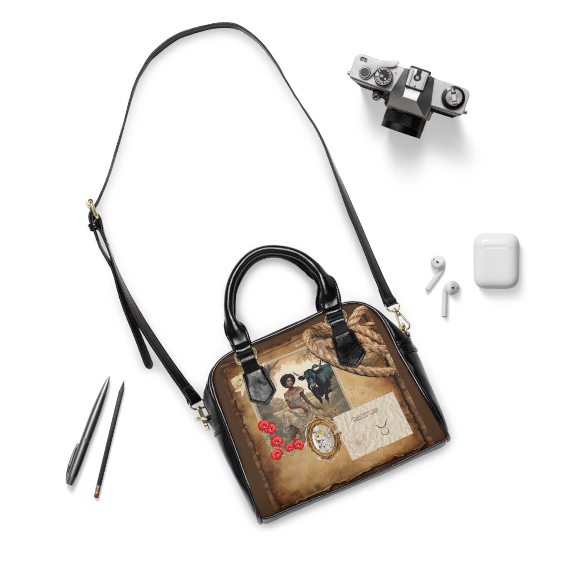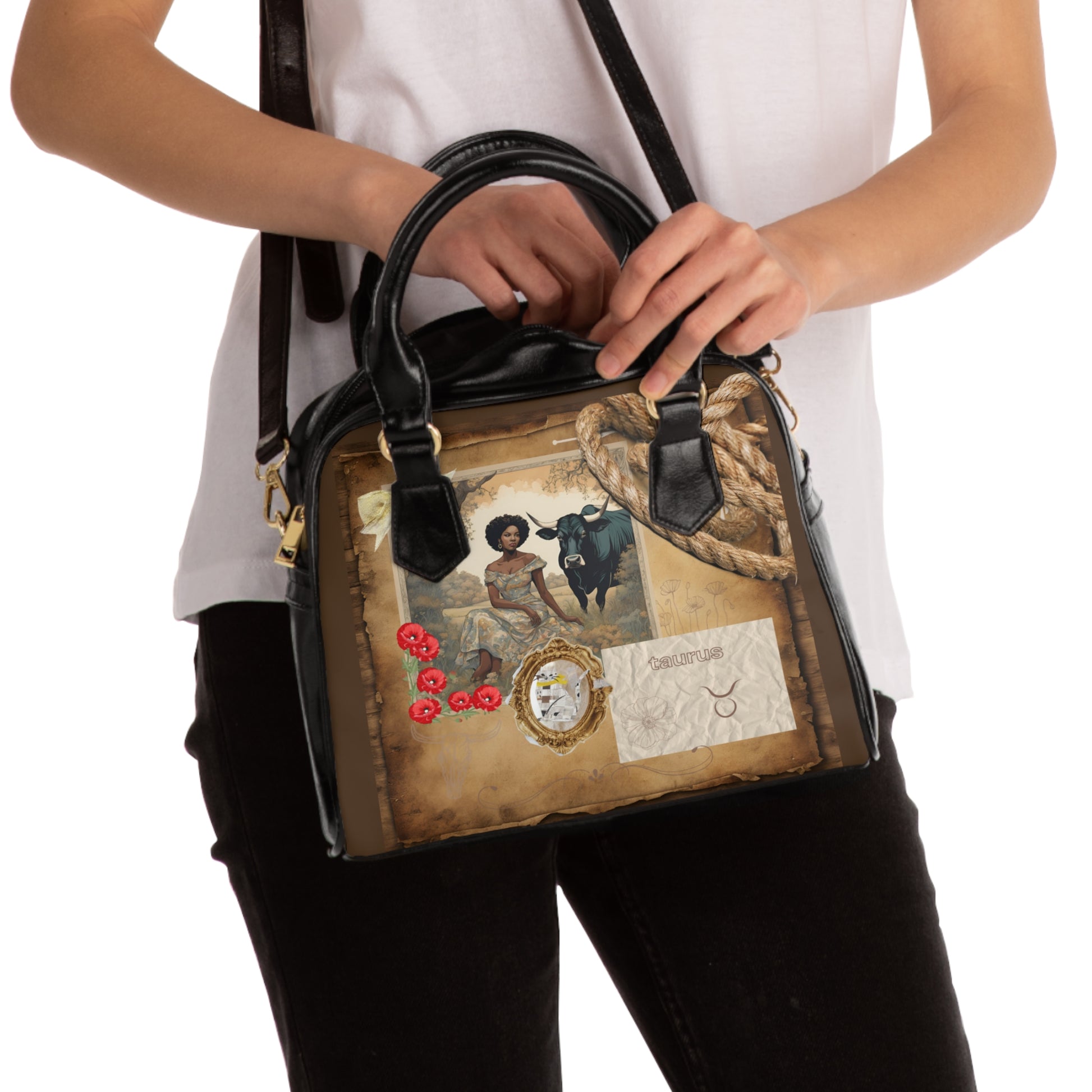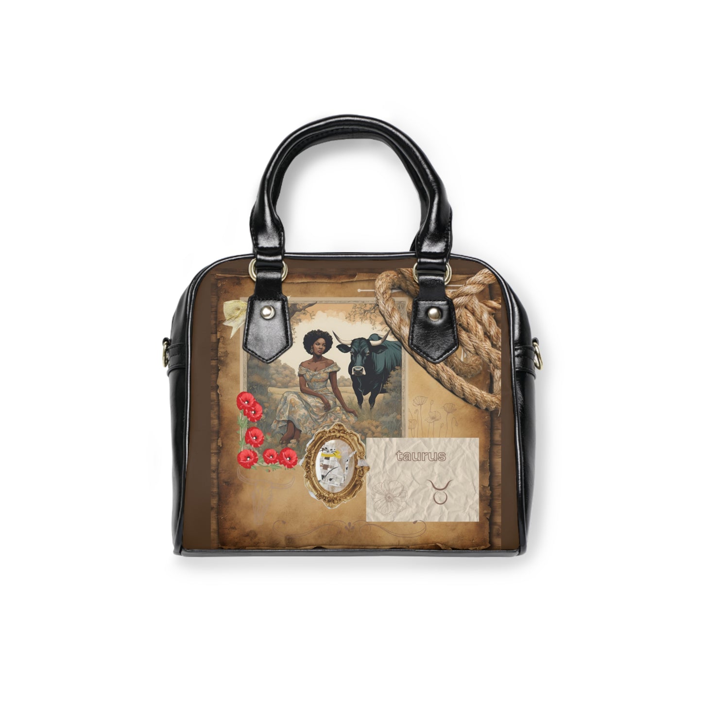 The handbag showcases a stunning illustration of a Taurus woman seated in a serene, pastoral setting. The earthy tones and intricate details of the artwork bring out the grounded and resilient nature of Taurus. The woman, dressed in a floral gown, exudes calm and grace, with a powerful bull standing by her side, symbolizing strength and determination. The image is framed with vintage elements, including a golden bow and rustic floral accents, enhancing the overall aesthetic.