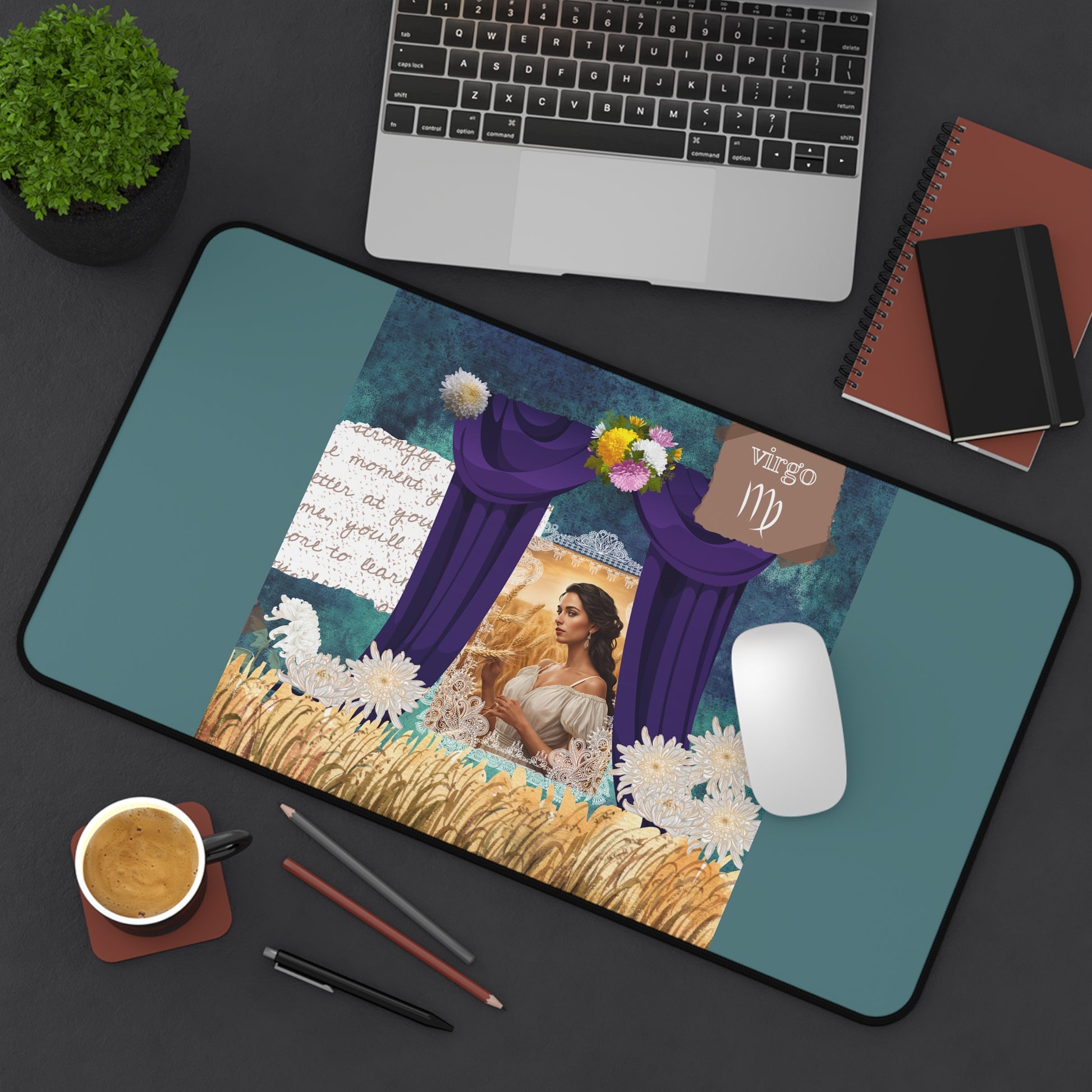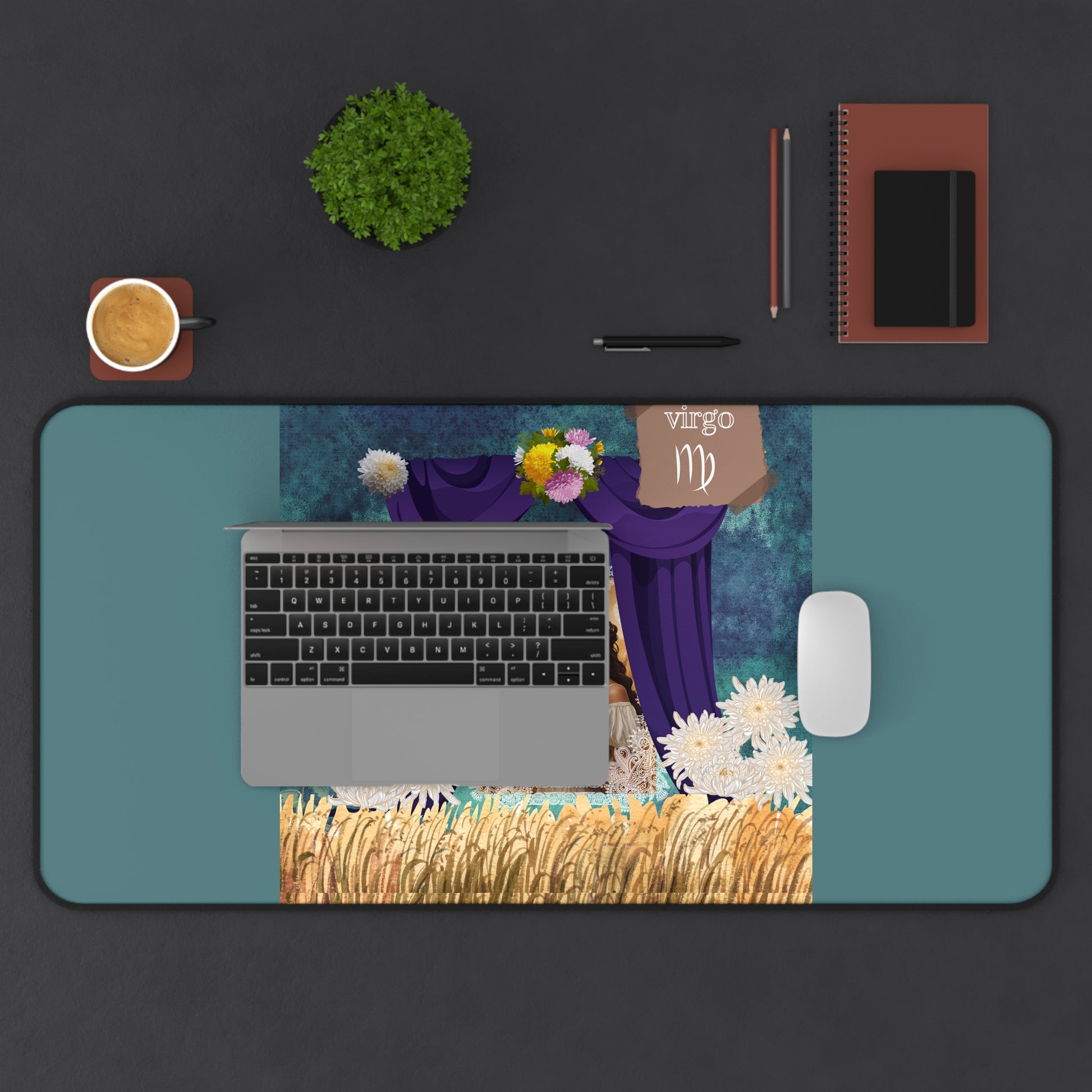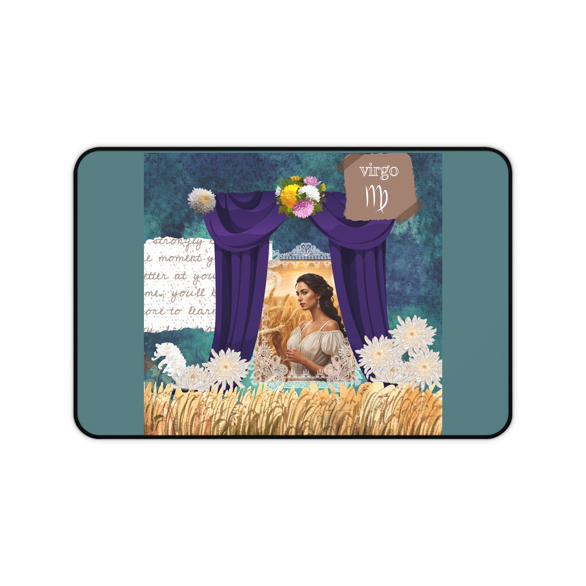 The desk mat showcases a stunning painting of a beautiful woman standing gracefully in a golden wheat field. She holds a stalk of wheat, symbolizing Virgo's connection to the harvest and their nurturing nature. The scene is framed by a majestic blue curtain that drapes elegantly around the image, adding a touch of grandeur and sophistication. Chrysanthemum flowers, known for their association with Virgo, are delicately placed throughout the design, enhancing its natural beauty and symbolic meaning.