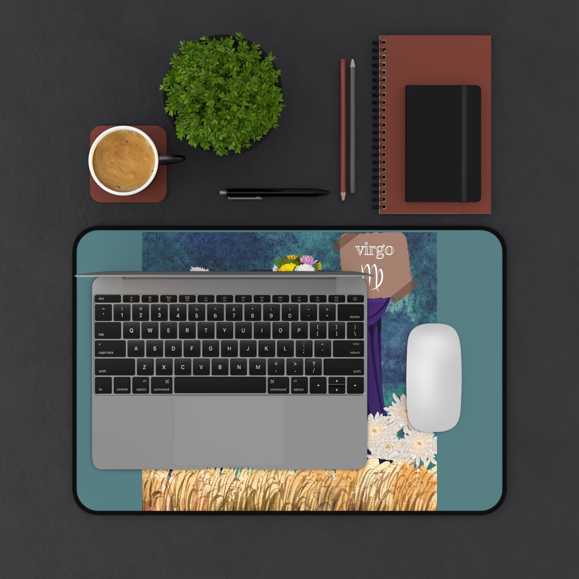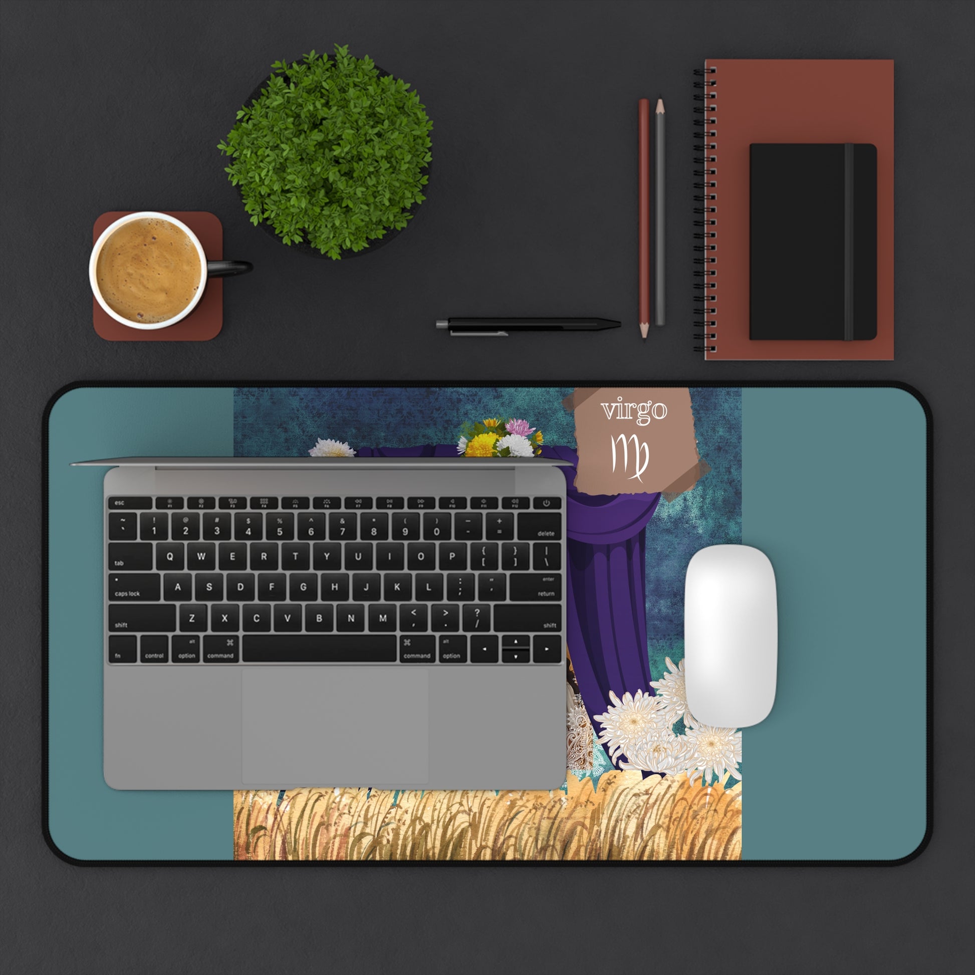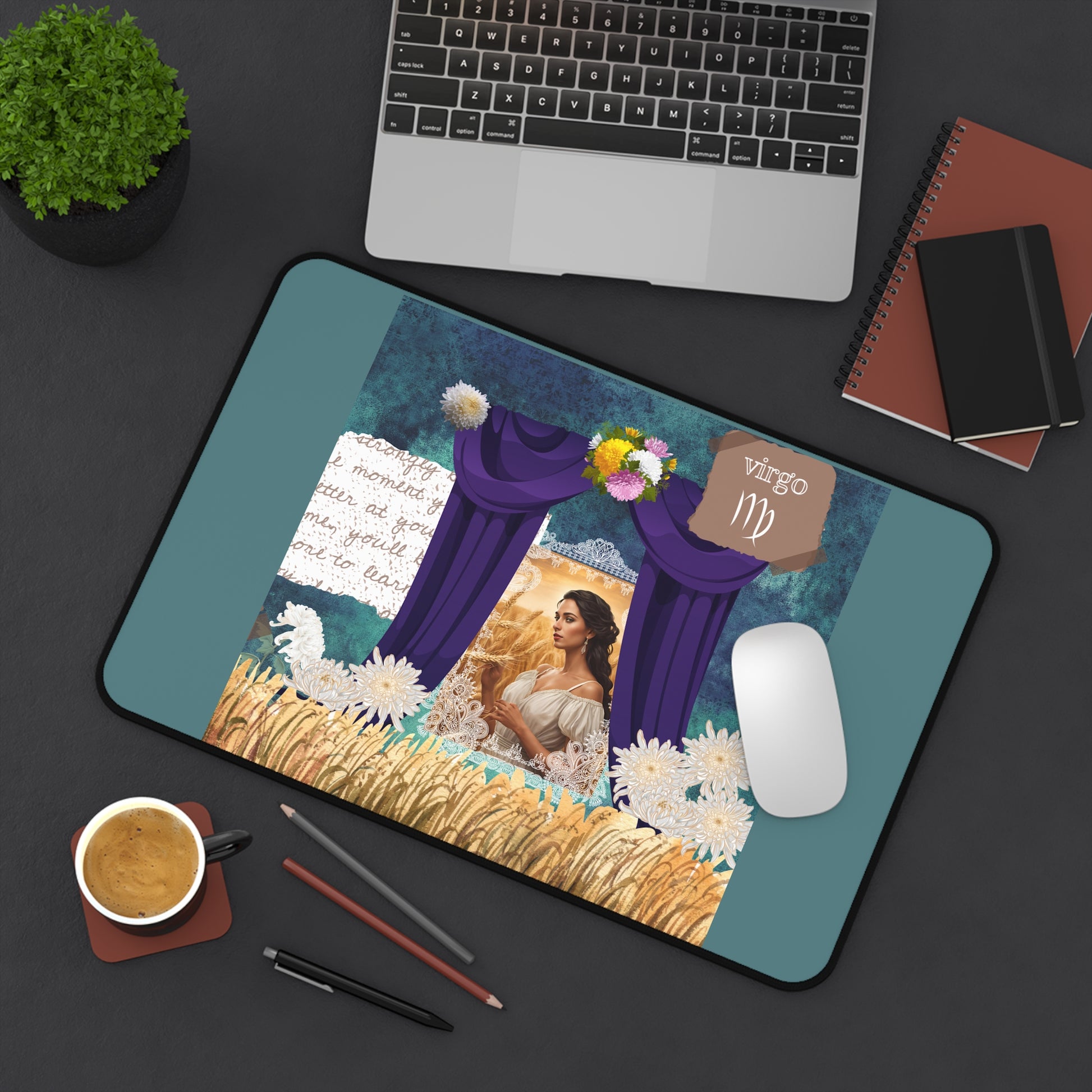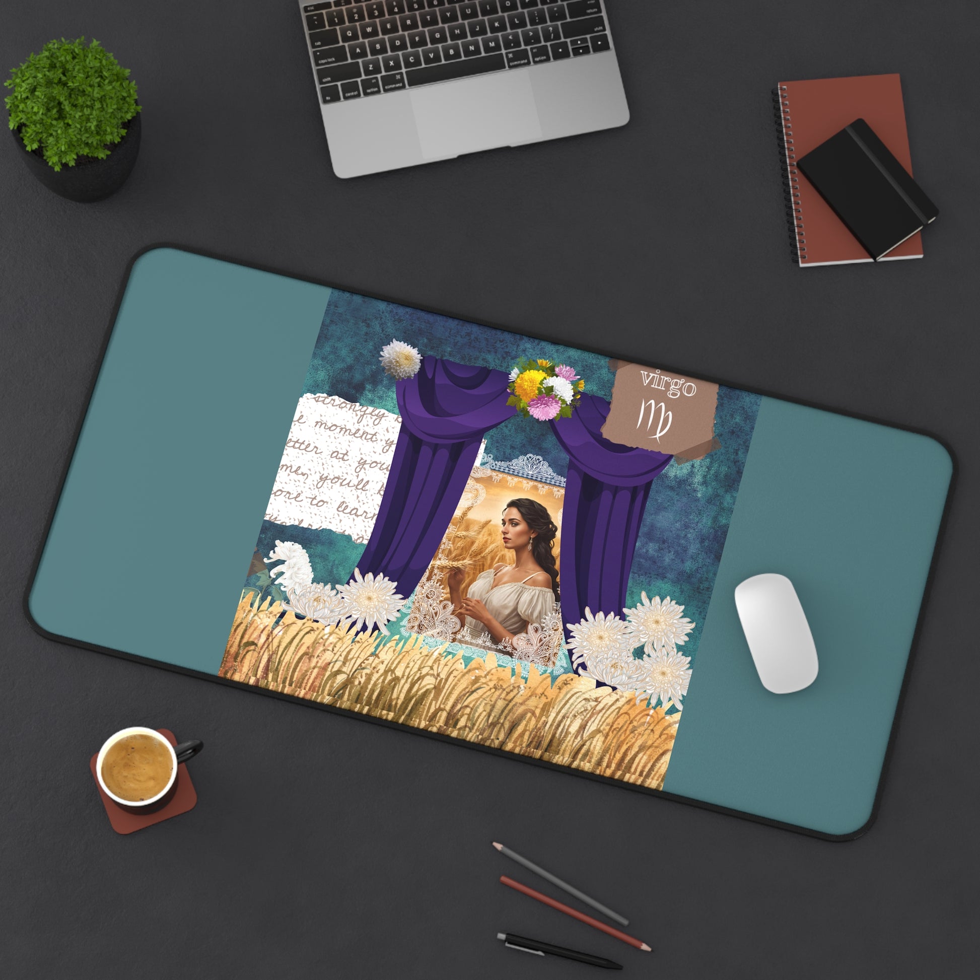 The desk mat showcases a stunning painting of a beautiful woman standing gracefully in a golden wheat field. She holds a stalk of wheat, symbolizing Virgo's connection to the harvest and their nurturing nature. The scene is framed by a majestic blue curtain that drapes elegantly around the image, adding a touch of grandeur and sophistication. Chrysanthemum flowers, known for their association with Virgo, are delicately placed throughout the design, enhancing its natural beauty and symbolic meaning.