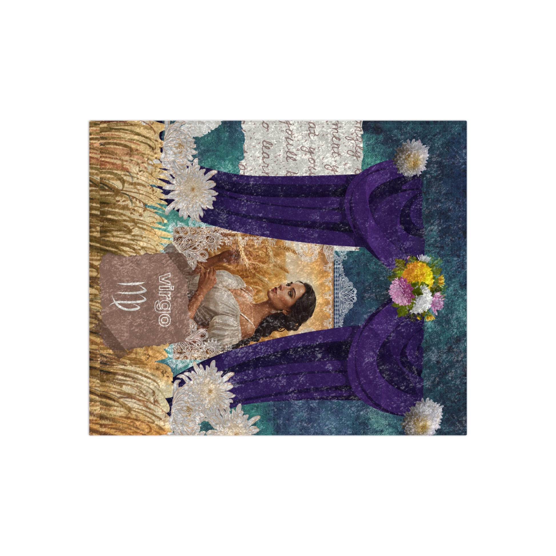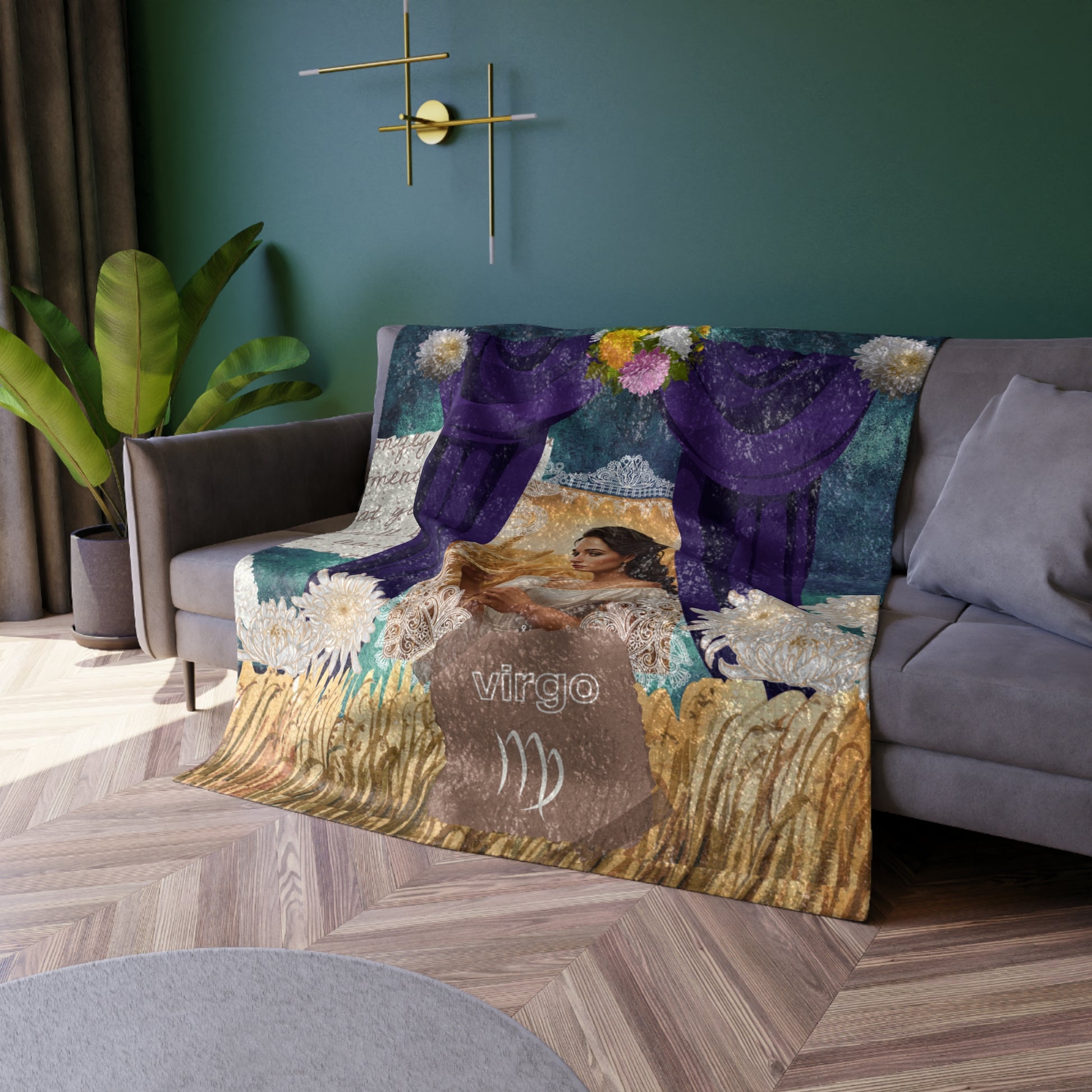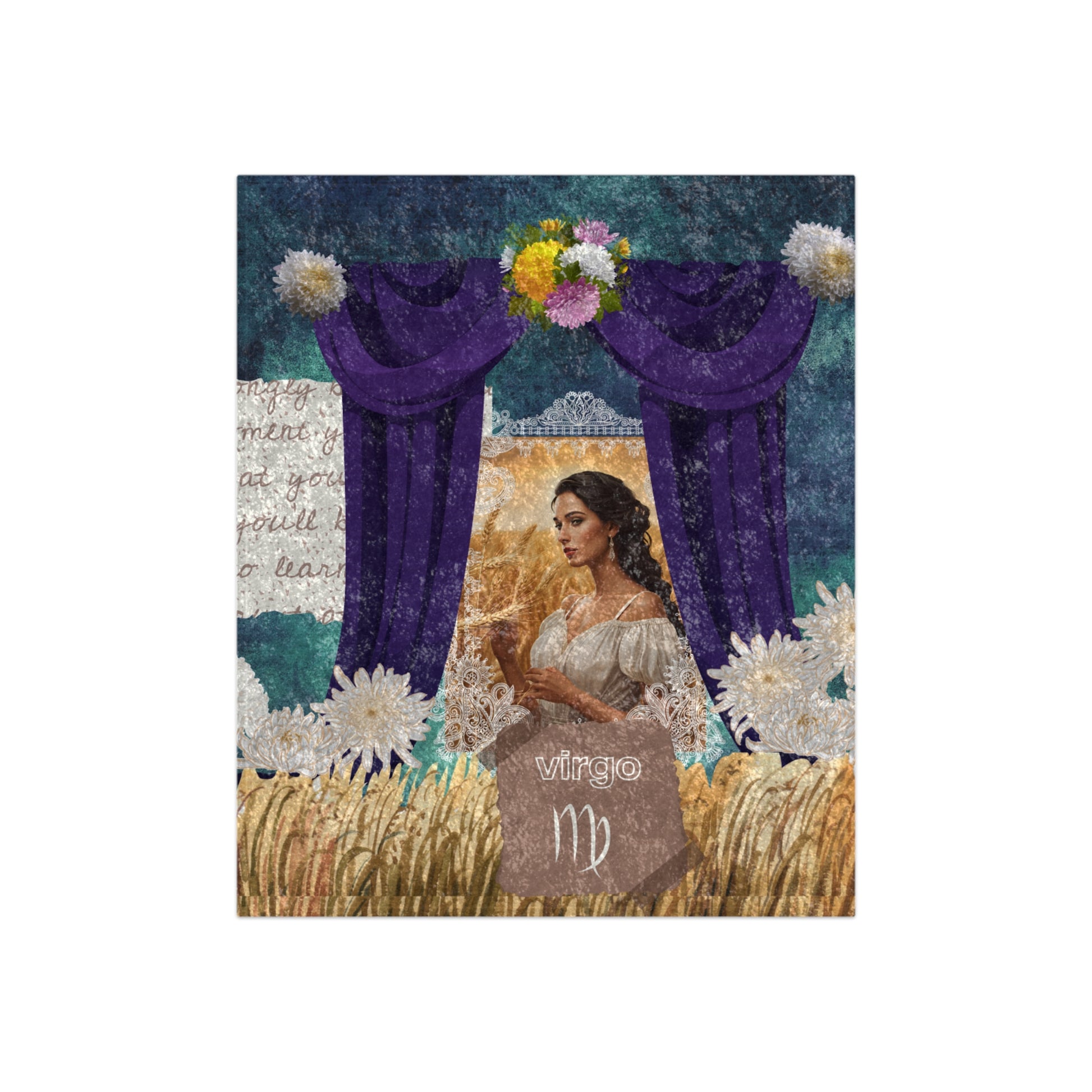 The velvet blanket showcasesa stunning painting of a beautiful woman standing gracefully in a golden wheat field. She holds a stalk of wheat, symbolizing Virgo's connection to the harvest and their nurturing nature. The scene is framed by a majestic blue curtain that drapes elegantly around the image, adding a touch of grandeur and sophistication. Chrysanthemum flowers, known for their association with Virgo, are delicately placed throughout the design, enhancing its natural beauty and symbolic meaning.